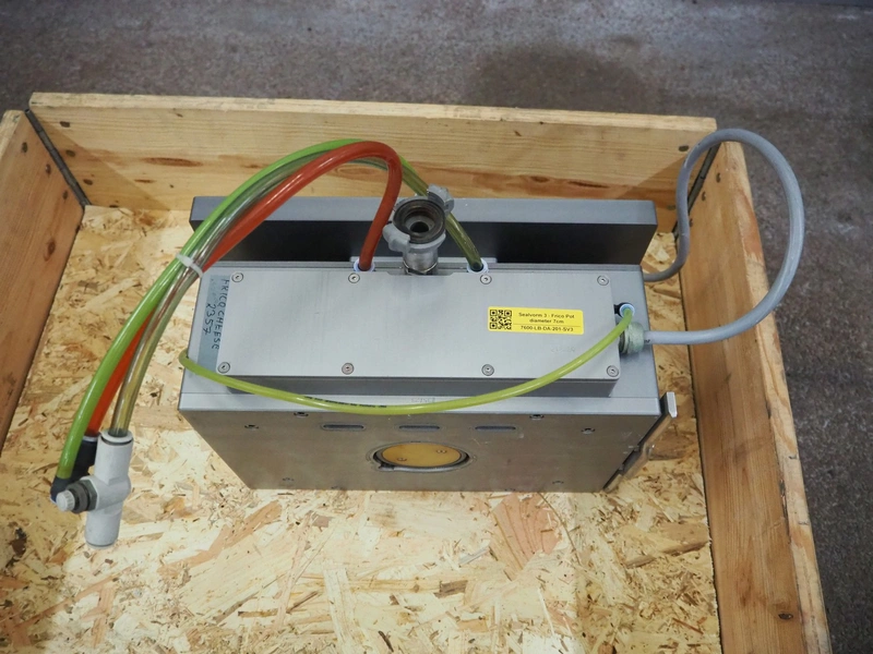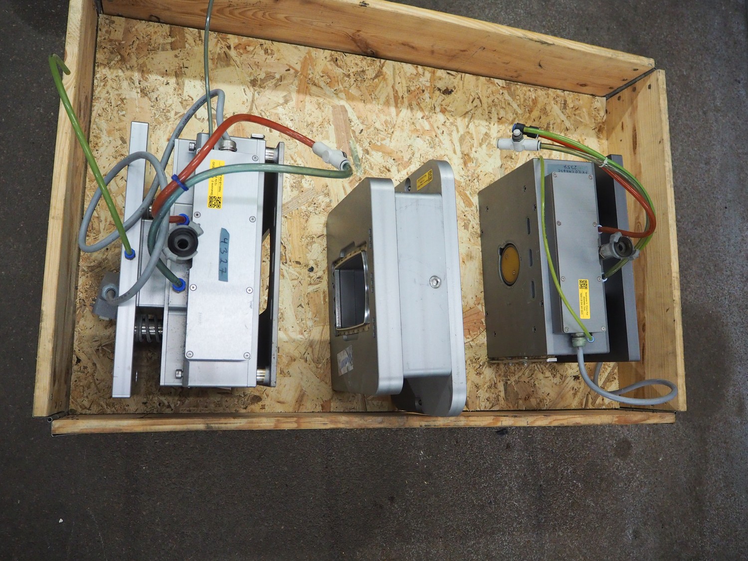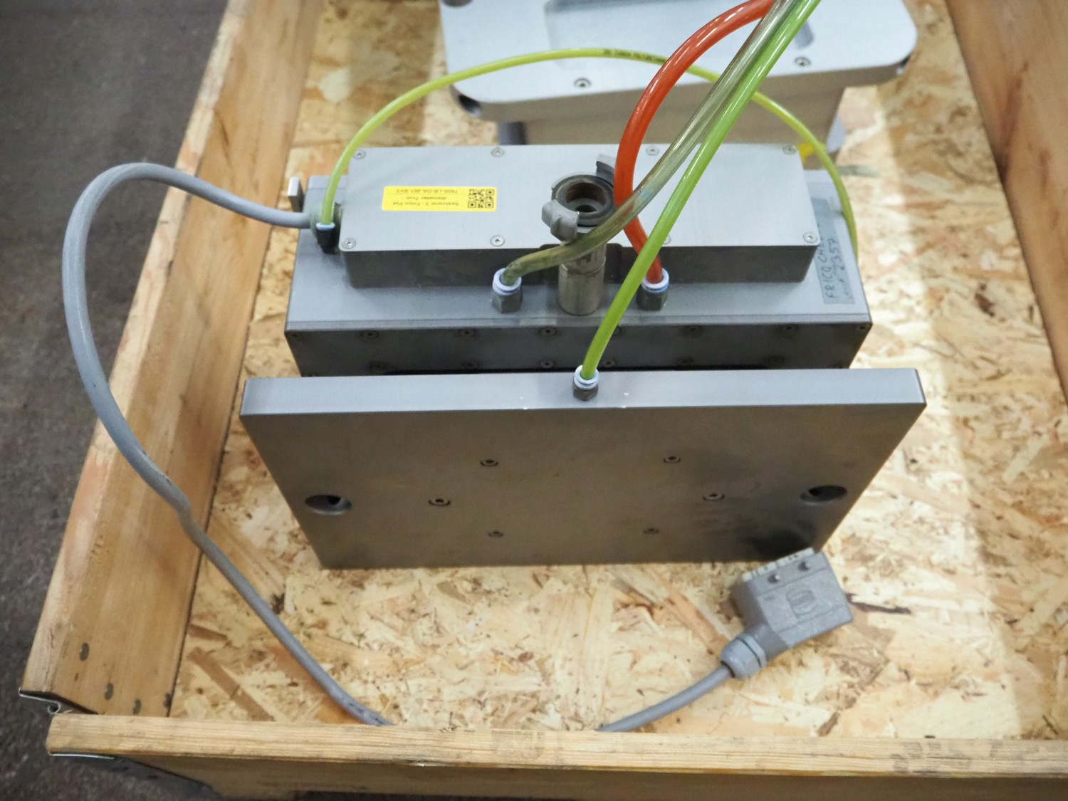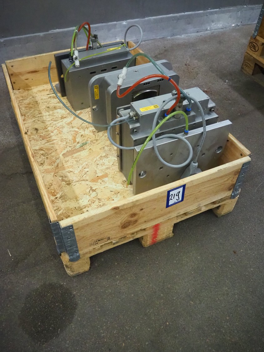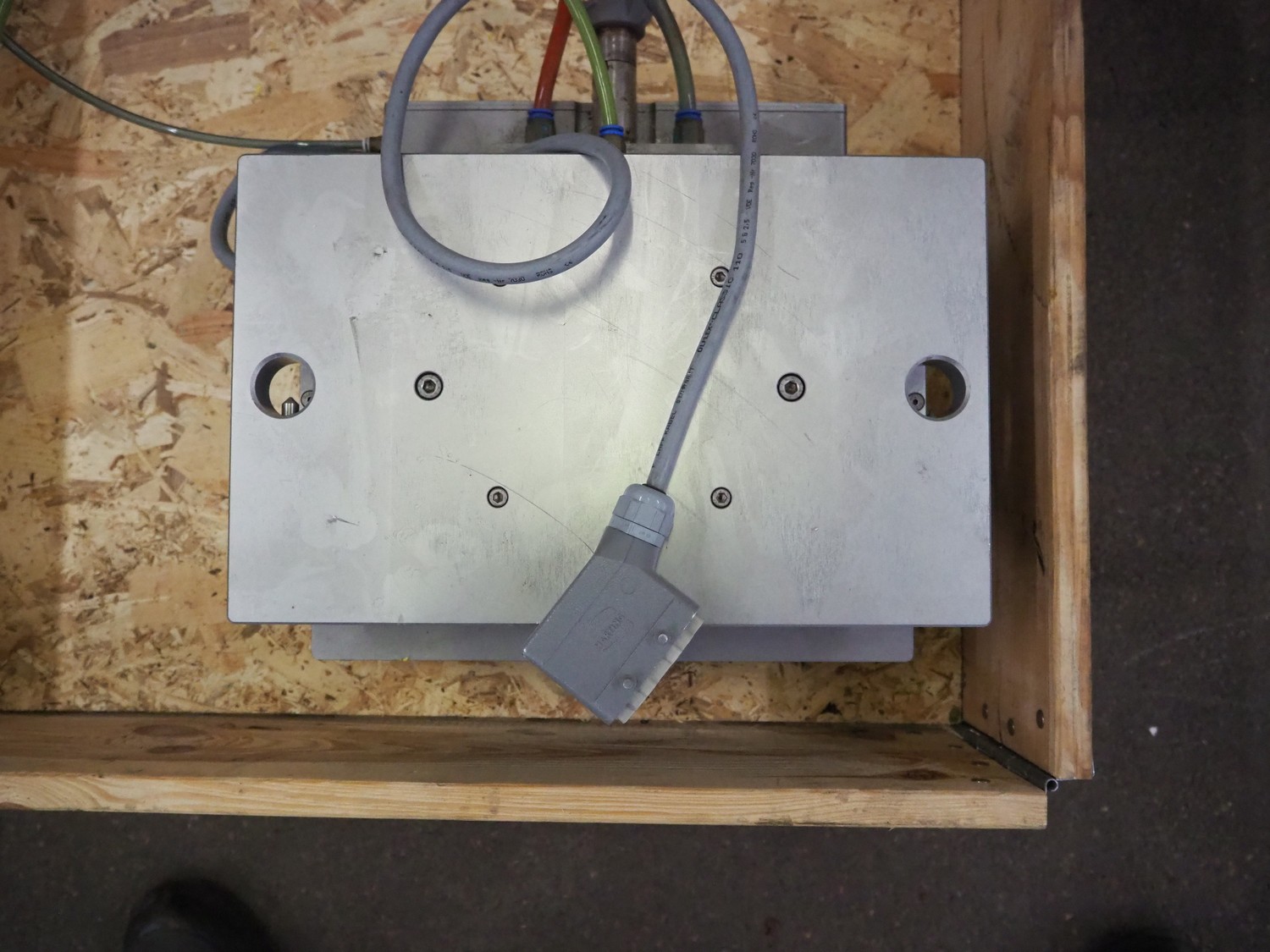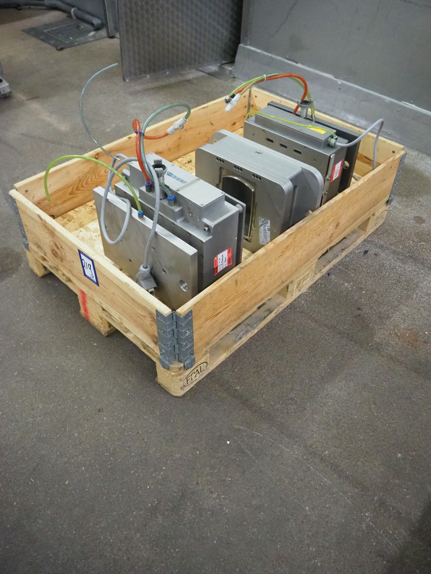 Pallet with 3 dyes for traysealer, dimensions dye: (2x) 200 mm x 125 mm and (1x) Ø 70 mm, total dimensions: 400 mm x 350 mm x 250 mm, 420 mm x 350 mm x 200 mm and 400 mm x 240 mm x 200 mm.
