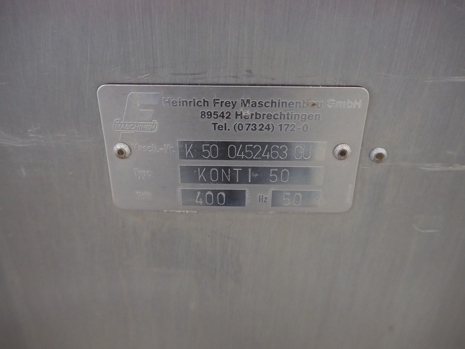 Frey vacuum filling machine, type: KONTI 50, machine number: K 50 0452463 GU, 400 V, 50 Hz, dimensions: 780 mm x 840 mm x 1650 mm.