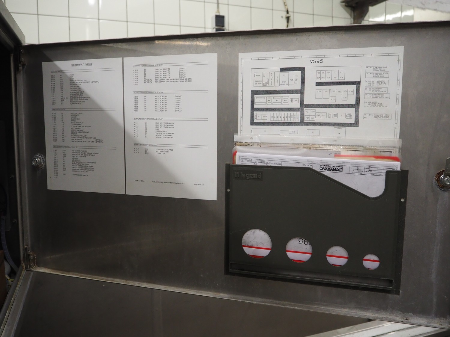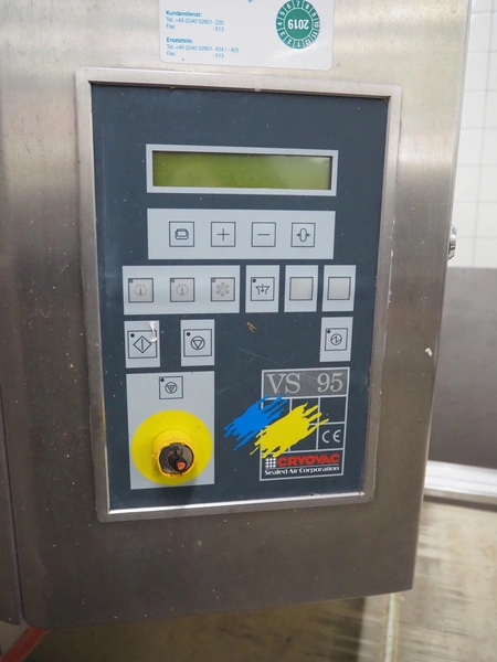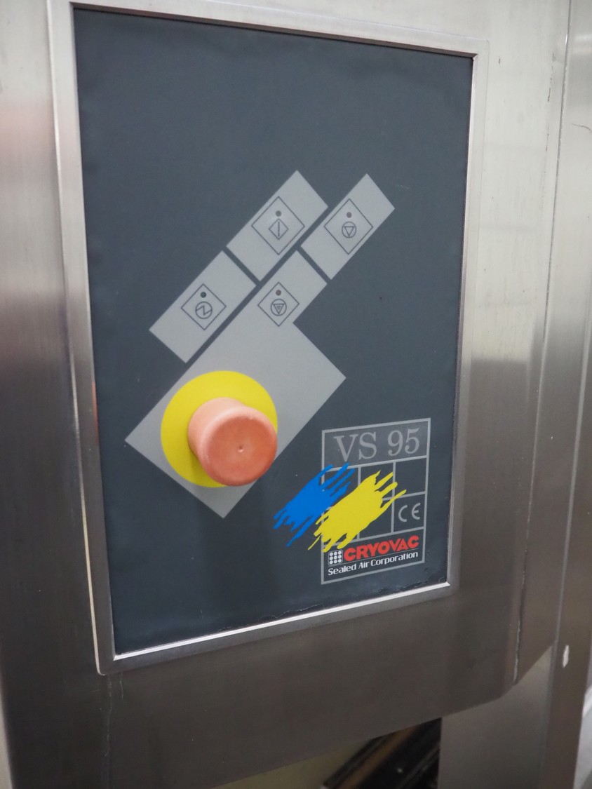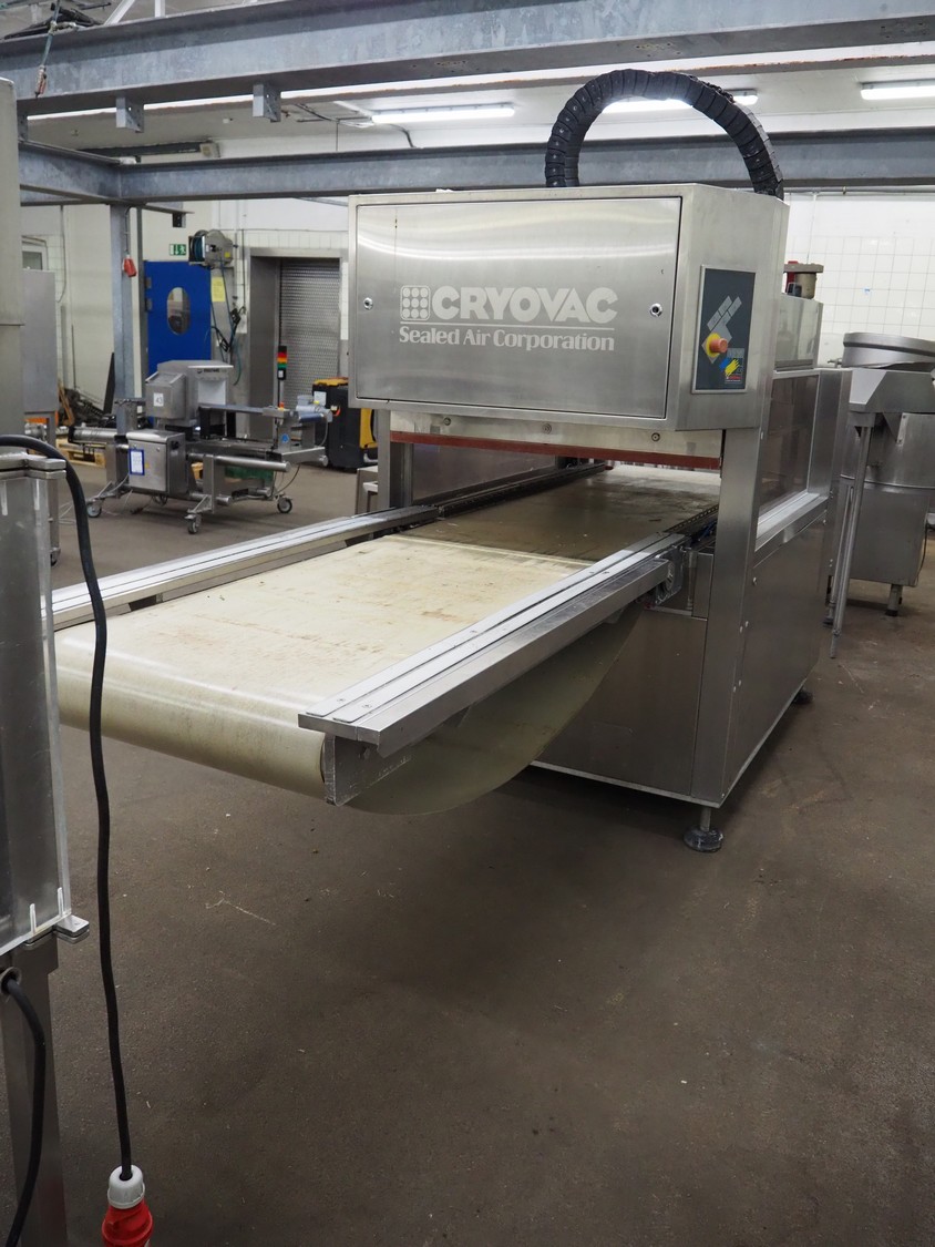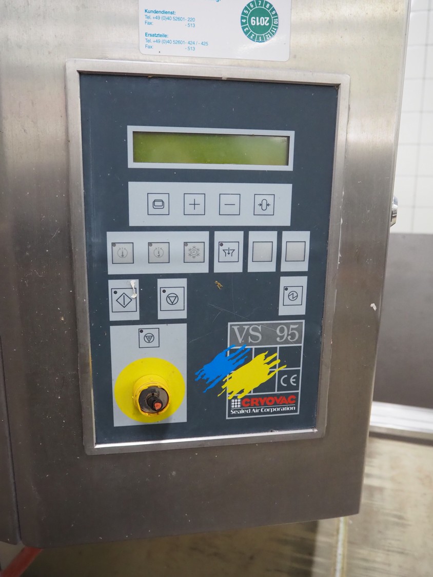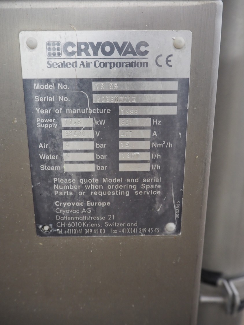 Cryovac belt vacuum machine, model: VS 95, serial number: A03800712, year of construction: 1999, 400 V, 3 Ph, 50 Hz, 40 A, seal length: (2x) 1500 mm, plastic belt, belt width: 730 mm, Garden Denver vacuum pump, type: R-VWP 1500 (05), capacity: 1580 m³ per hour, total dimensions: 3700 mm x 1400 mm x 2200 mm, including suction device for rest film, dimensions: 1000 mm x 770 mm x 1500 mm.