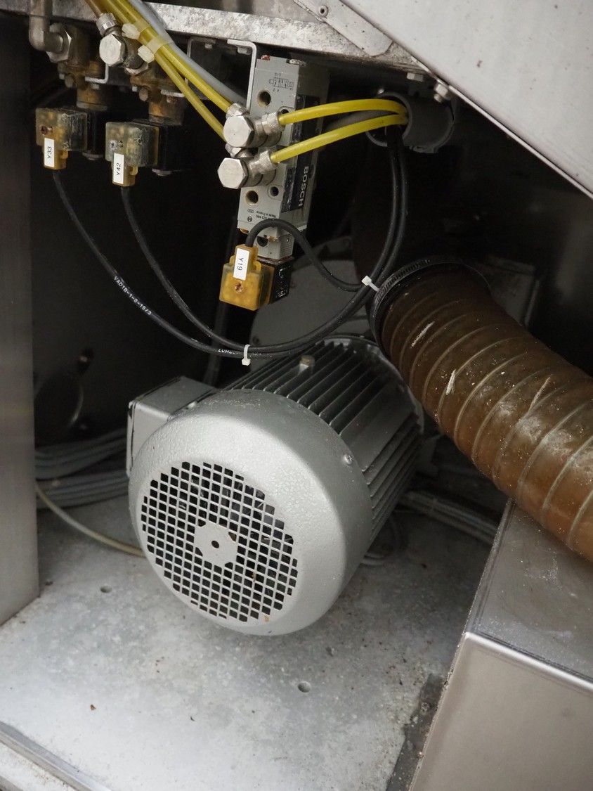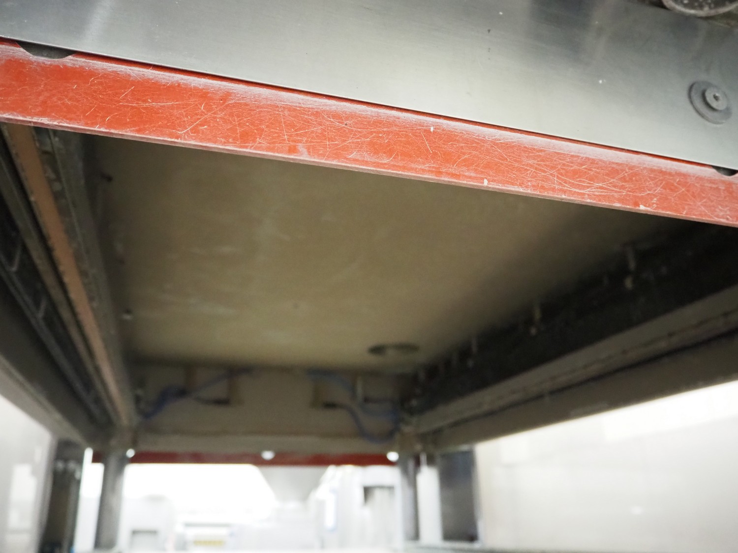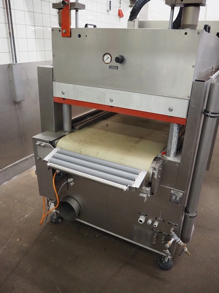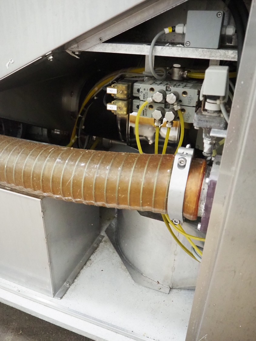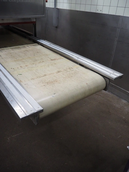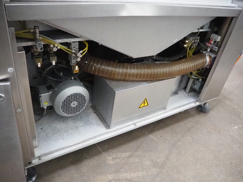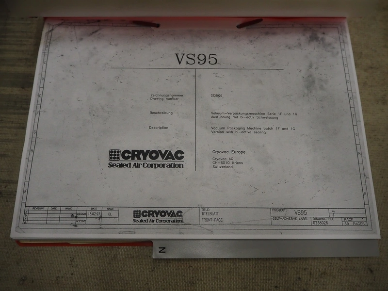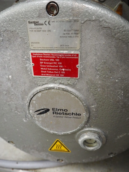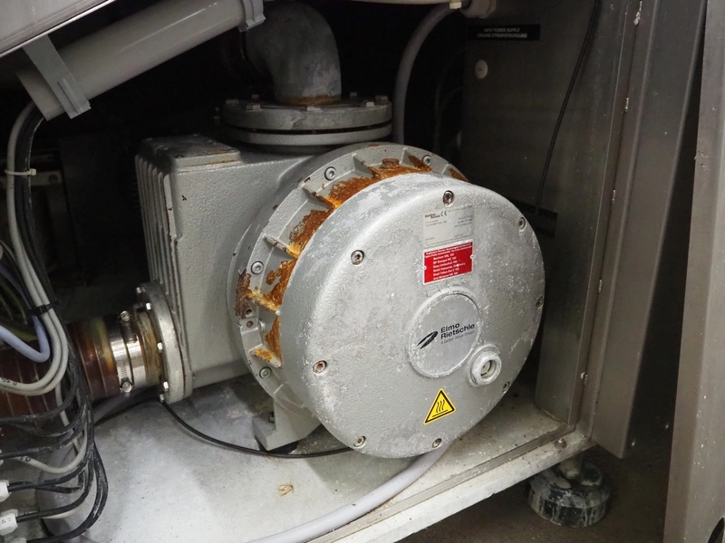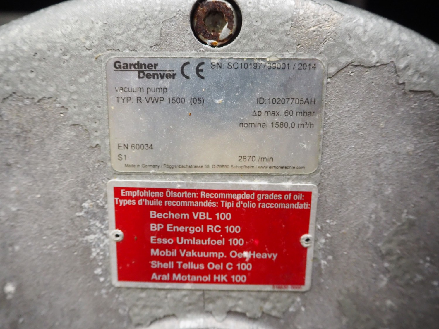Cryovac belt vacuum machine, model: VS 95, serial number: A03800712, year of construction: 1999, 400 V, 3 Ph, 50 Hz, 40 A, seal length: (2x) 1500 mm, plastic belt, belt width: 730 mm, Garden Denver vacuum pump, type: R-VWP 1500 (05), capacity: 1580 m³ per hour, total dimensions: 3700 mm x 1400 mm x 2200 mm, including suction device for rest film, dimensions: 1000 mm x 770 mm x 1500 mm.