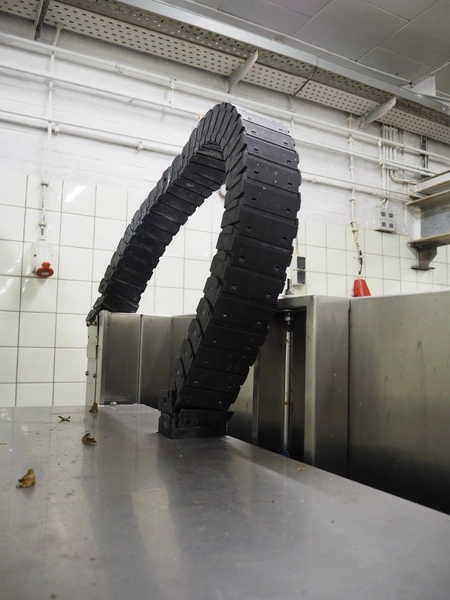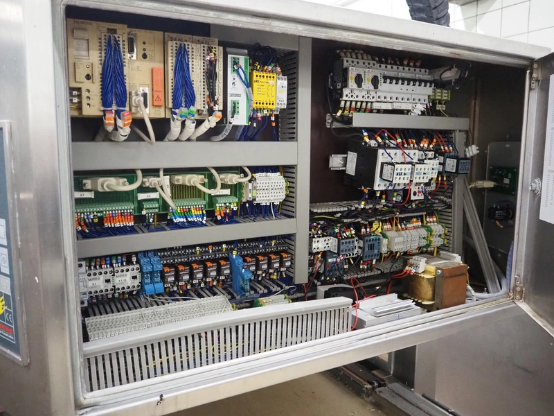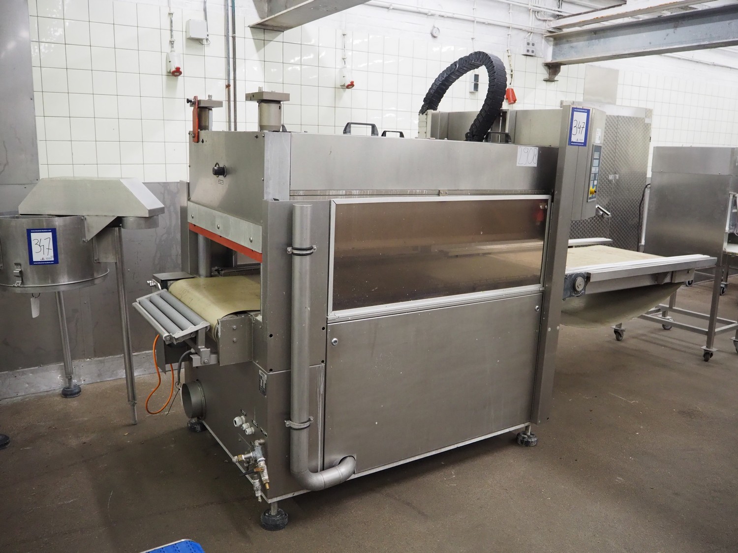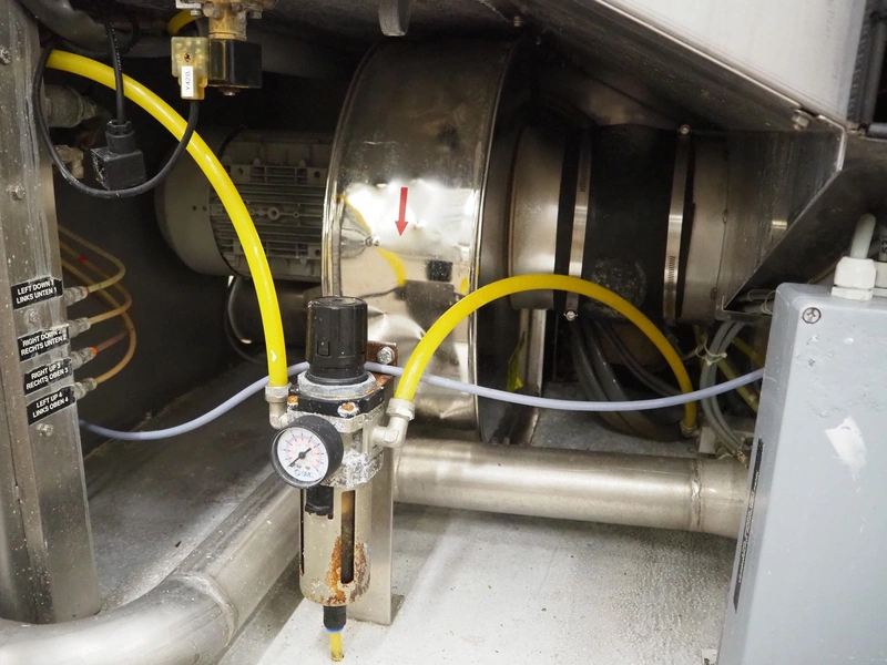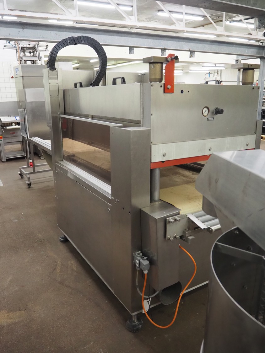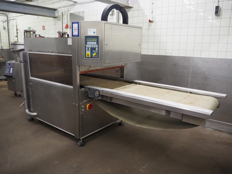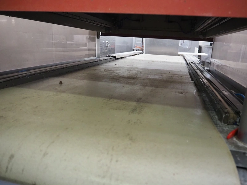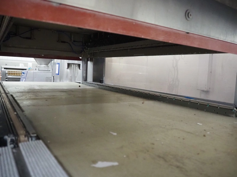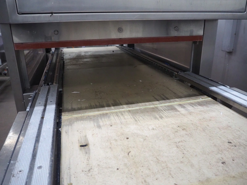 Cryovac belt vacuum machine, model: VS 95, serial number: A03800712, year of construction: 1999, 400 V, 3 Ph, 50 Hz, 40 A, seal length: (2x) 1500 mm, plastic belt, belt width: 730 mm, Garden Denver vacuum pump, type: R-VWP 1500 (05), capacity: 1580 m³ per hour, total dimensions: 3700 mm x 1400 mm x 2200 mm, including suction device for rest film, dimensions: 1000 mm x 770 mm x 1500 mm.