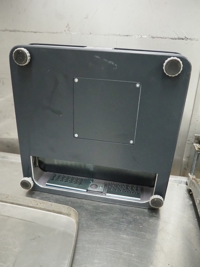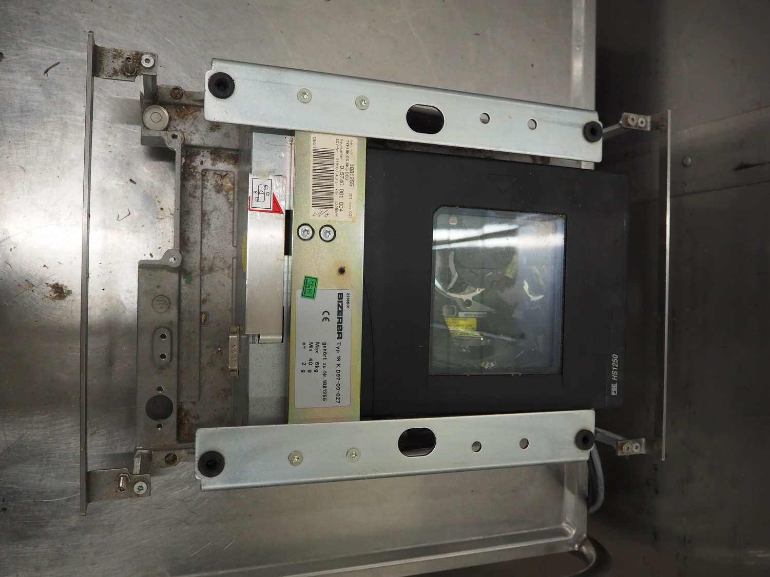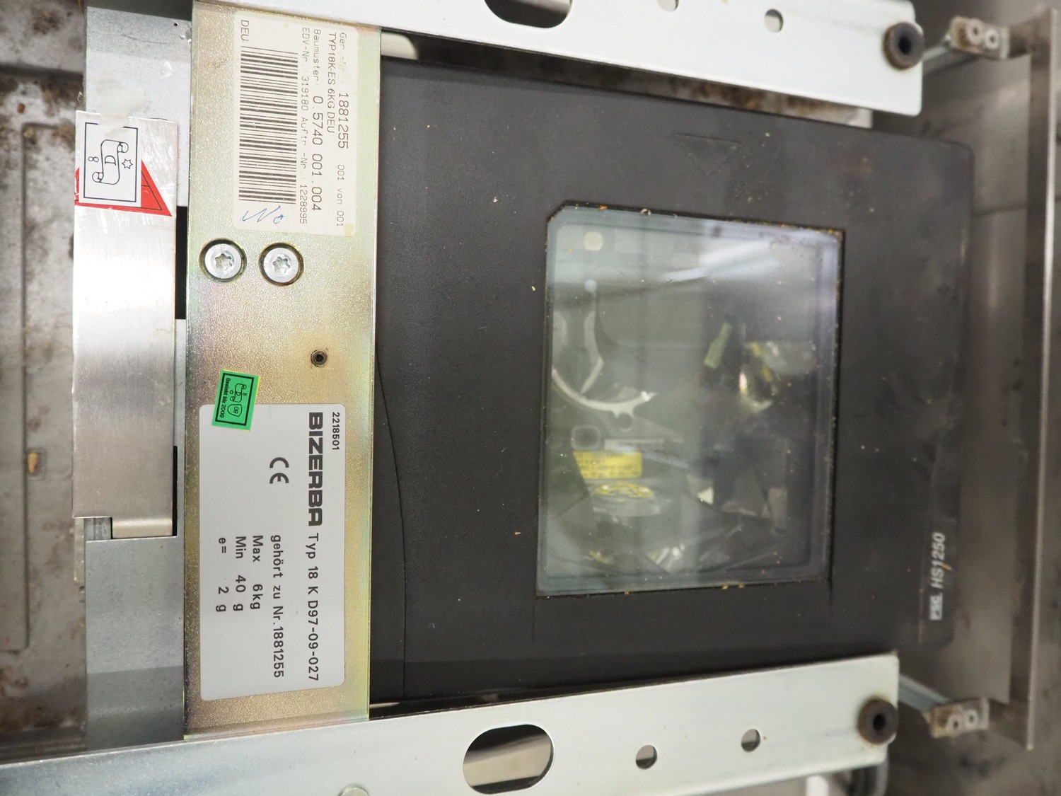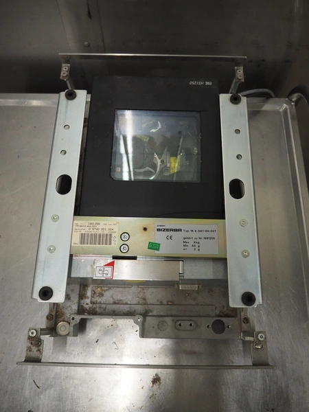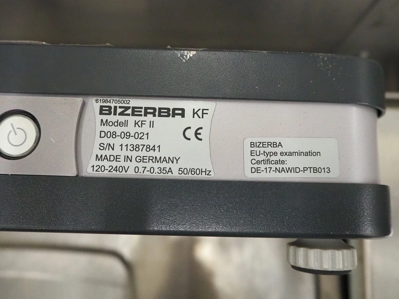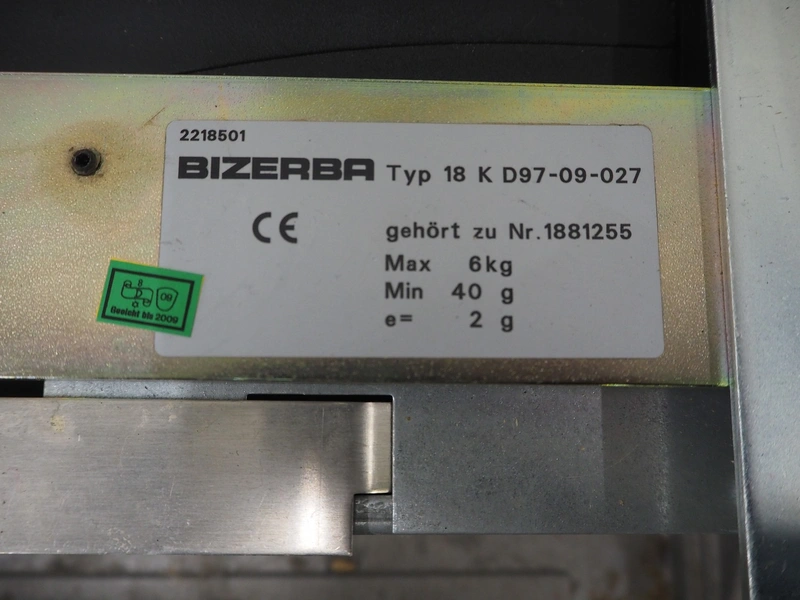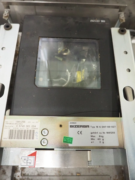 Bizerba weighing scale with indicator, model indicator: KF II, serial number: 11387841, 120-240 V, 50/60 Hz, 0.7-0.35 A, type weighing scale: 18 K D97-09-027, number: 1881255, maximum weight: 6 kg, minimum weight: 40 gram, e= 2 gram, dimensions scale: 370 mm x 300 mm and dimensions indicator: 440 mm x 300 mm x 130 mm.
