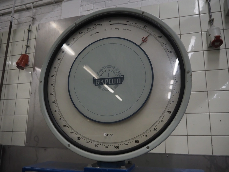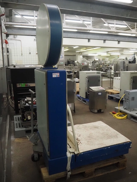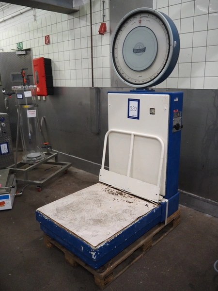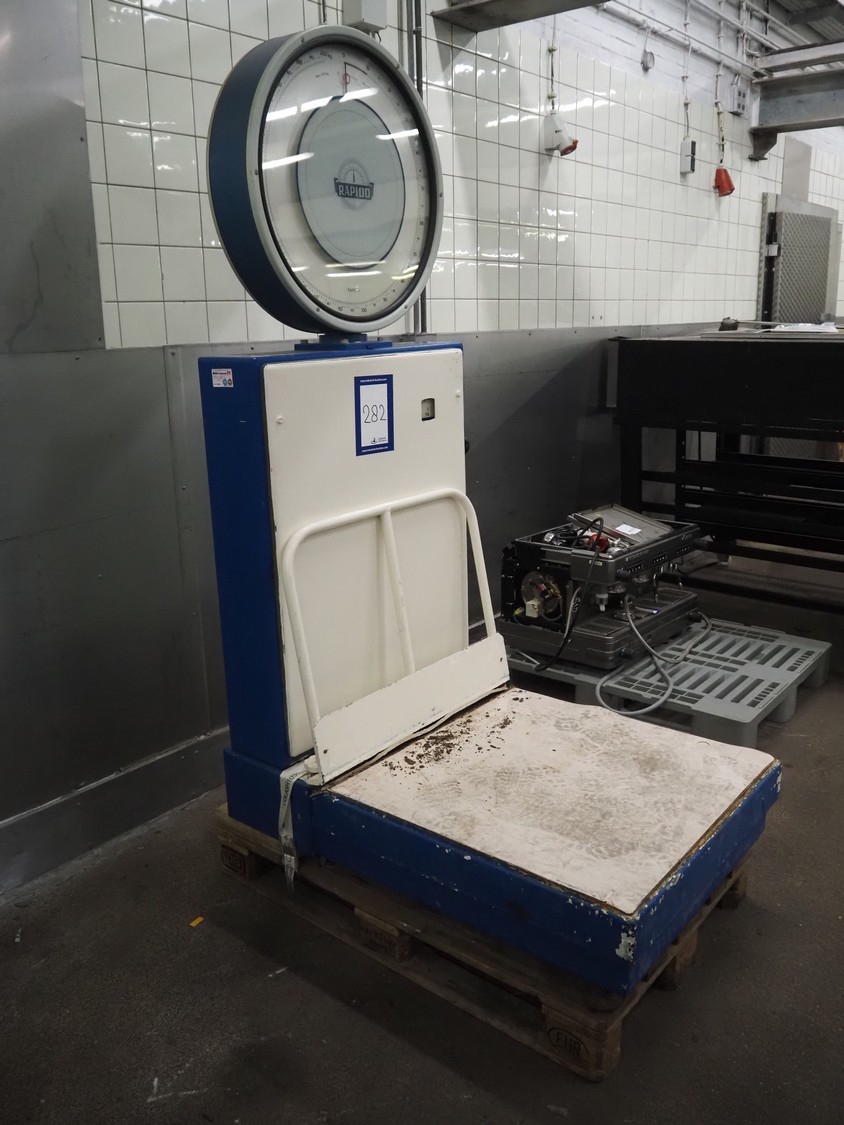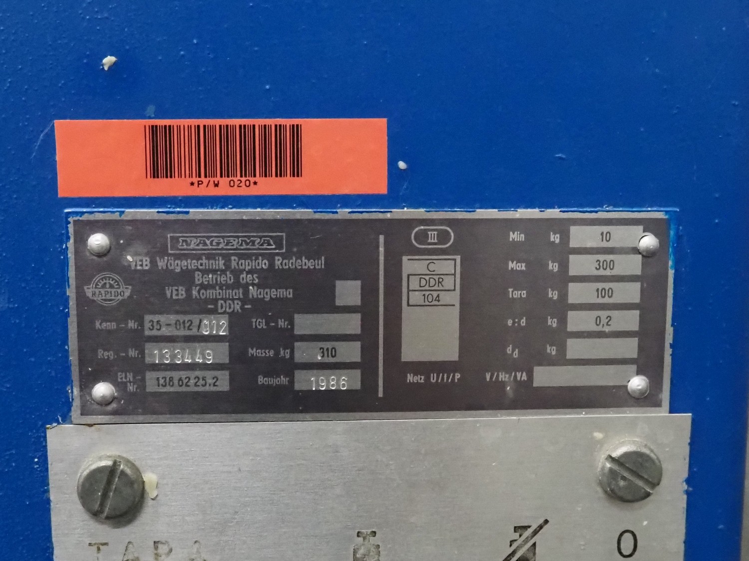 VEB Wägetechnik Rapido Radebeu weighing scale, model: Nagema Rapido, serial number: 35-012/012, year of construction: 1986, weight: 310, minimum weight: 10 kg maximum weight: 300 kg, e: 0.2 kg dimensions scale: 780 mm x 780 mm, total dimensions: 1370 mm x 780 mm x 1950 mm.