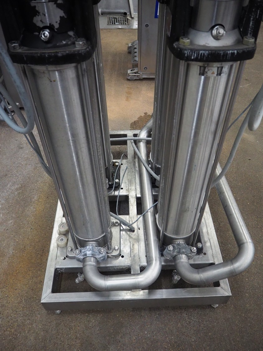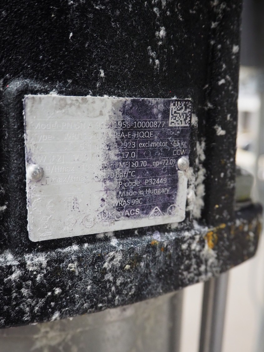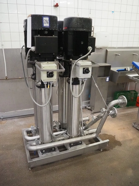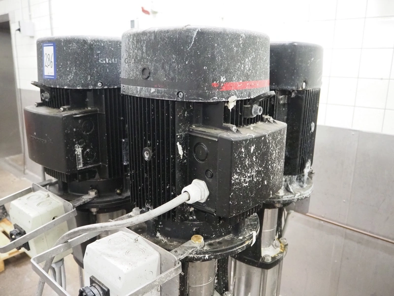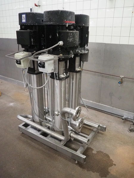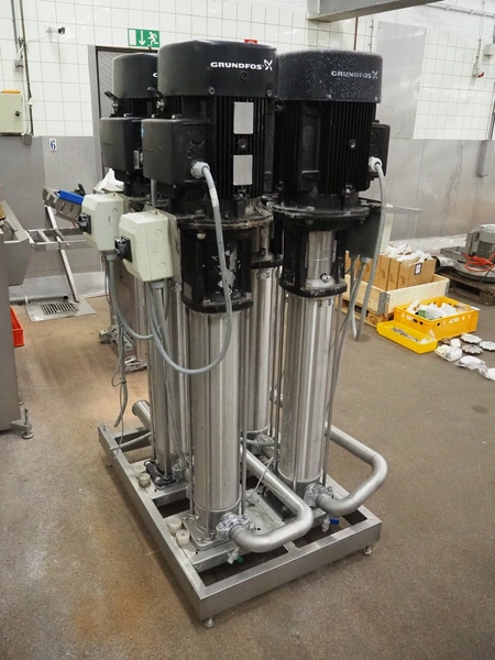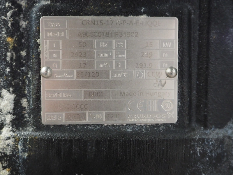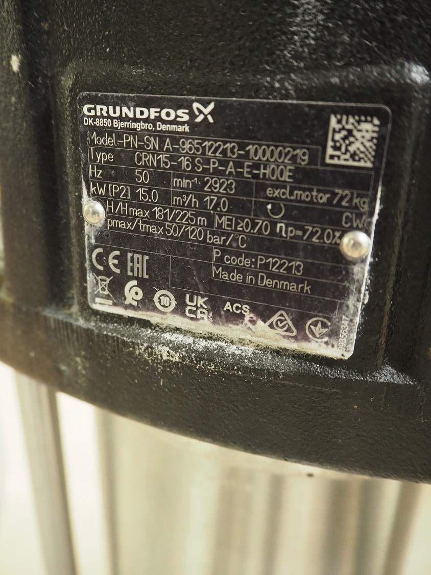 Grundfos centrifugal pump installation with 4 pumps, model: PN-SA A-96512213-100004219, CRN15-16 SF-P-GI-E-HQQE, CRN15-17 A-P-A-E-HQQW and PN-SN A-96501958 10000877, capacity: 17 m³ per hour per pump, dimensions: 1300 mm x 1200 mm x 1860 mm.