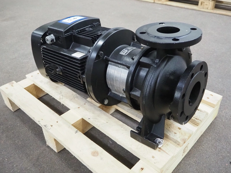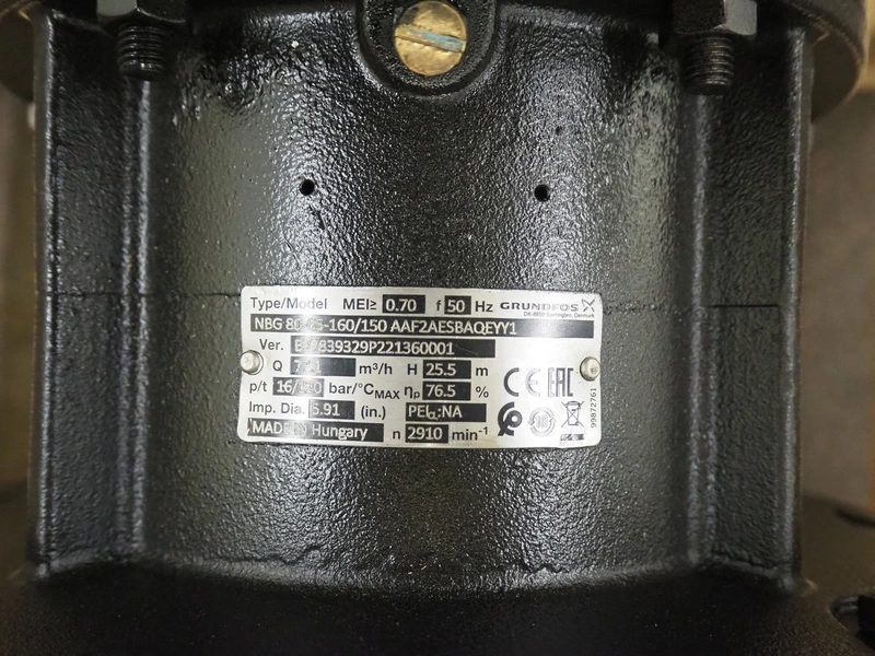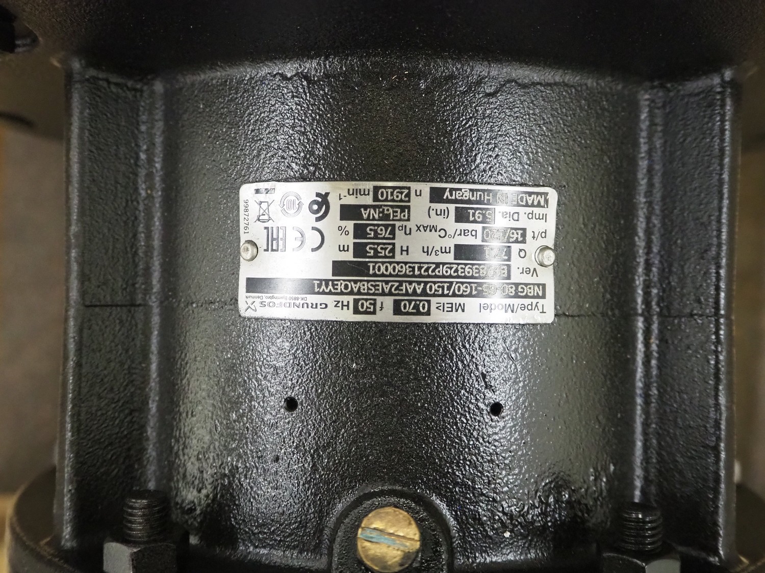 Grundfos centrifugal pump, type/model: NBG 80-65-160/150 AAF2AESBAQEYY1, capacity: 77.1 m³ per hour, dimensions: 700 mm x 300 mm x 340 mm.