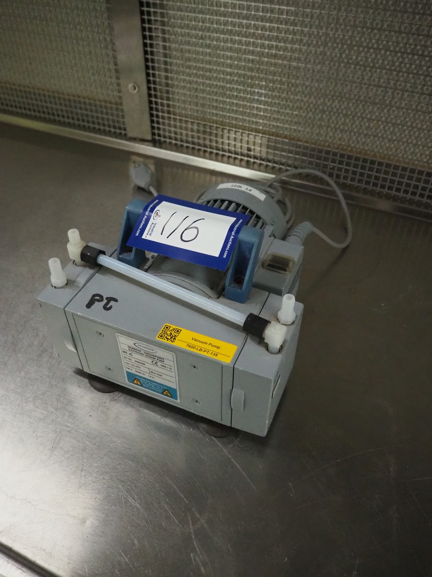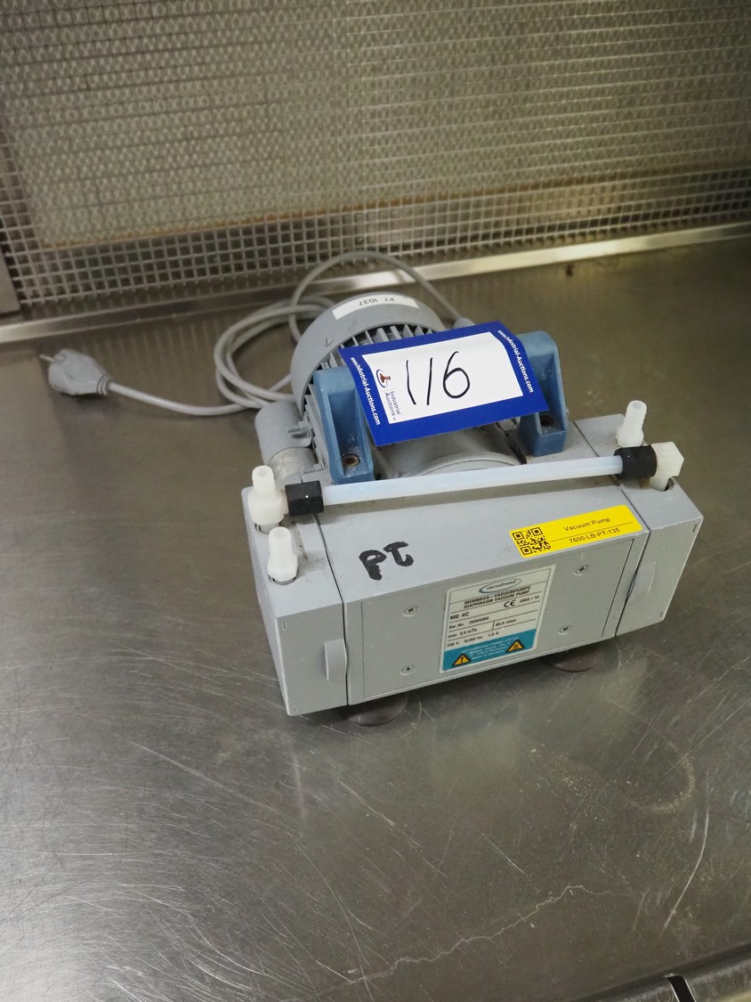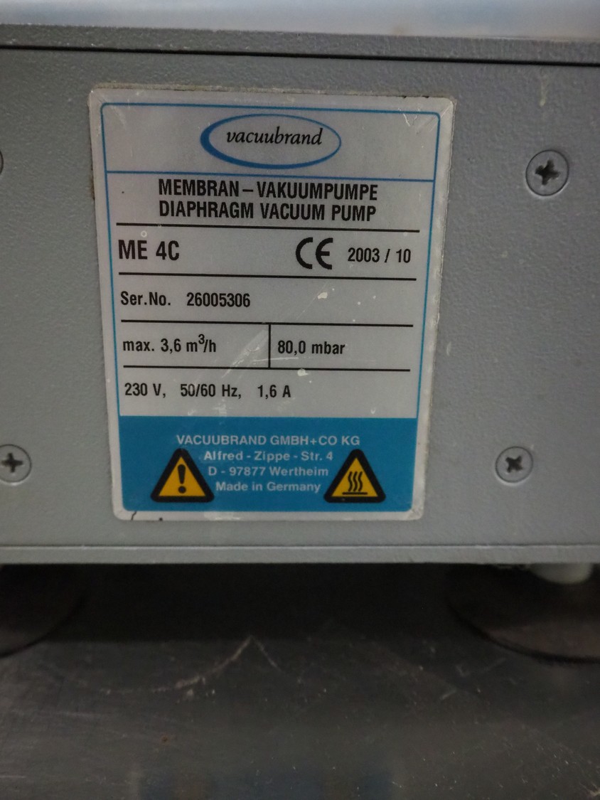 Vacuubrand vacuum pump, type: ME 4C, serial number: 26005306, year of construction: 2003, capacity: 3.6 m³ per hour, dimensions: 300 mm x 260 mm x 200 mm.