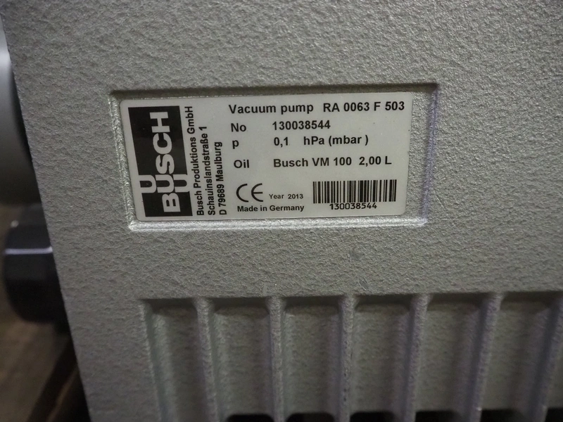 Busch vacuum pump, type: RA 0063 F 503, number: 130038544, year of construction: 2013, capacity: 63 m³ per hour, dimensions: 600 mm x 430 mm x 300 mm.