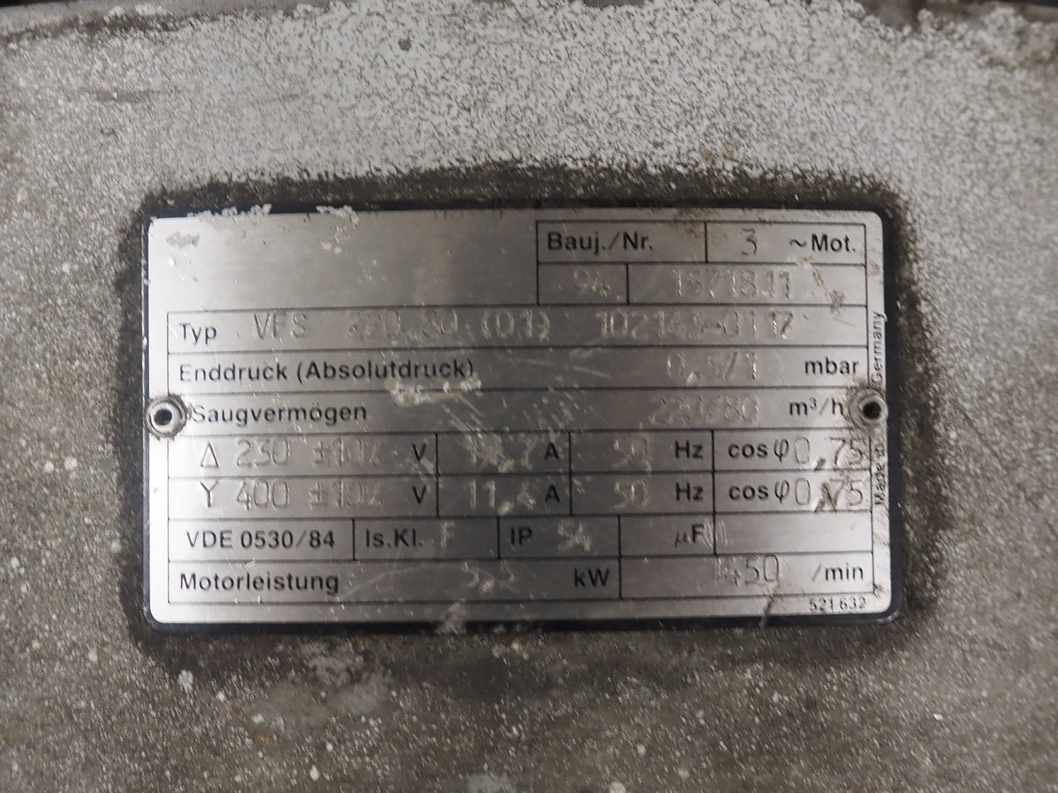 Leybold vacuum pump, type: VVS 25/80 (018), serial number: 152811, year of construction: 1994, capacity: 25/30 m³ per hour, dimensions: 1060 mm x 350 mm x 580 mm.