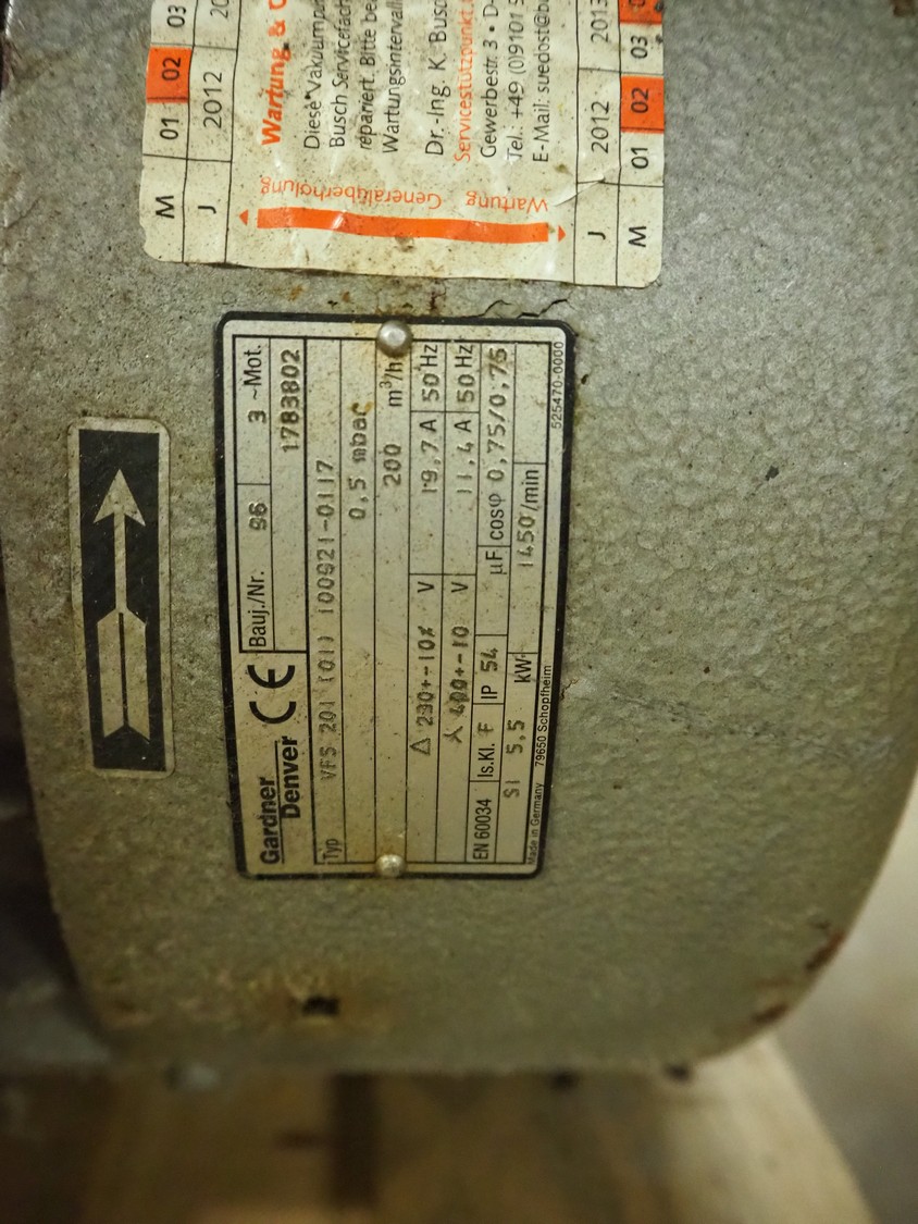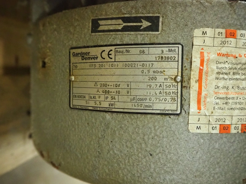 Gardner Denver vacuum pump, type: VFS 201 (01) 100921-0117, number: 1783802, year of construction: 1996, capacity: 200 m³ per hour, dimensions: 980 mm x 300 mm x 440 mm.