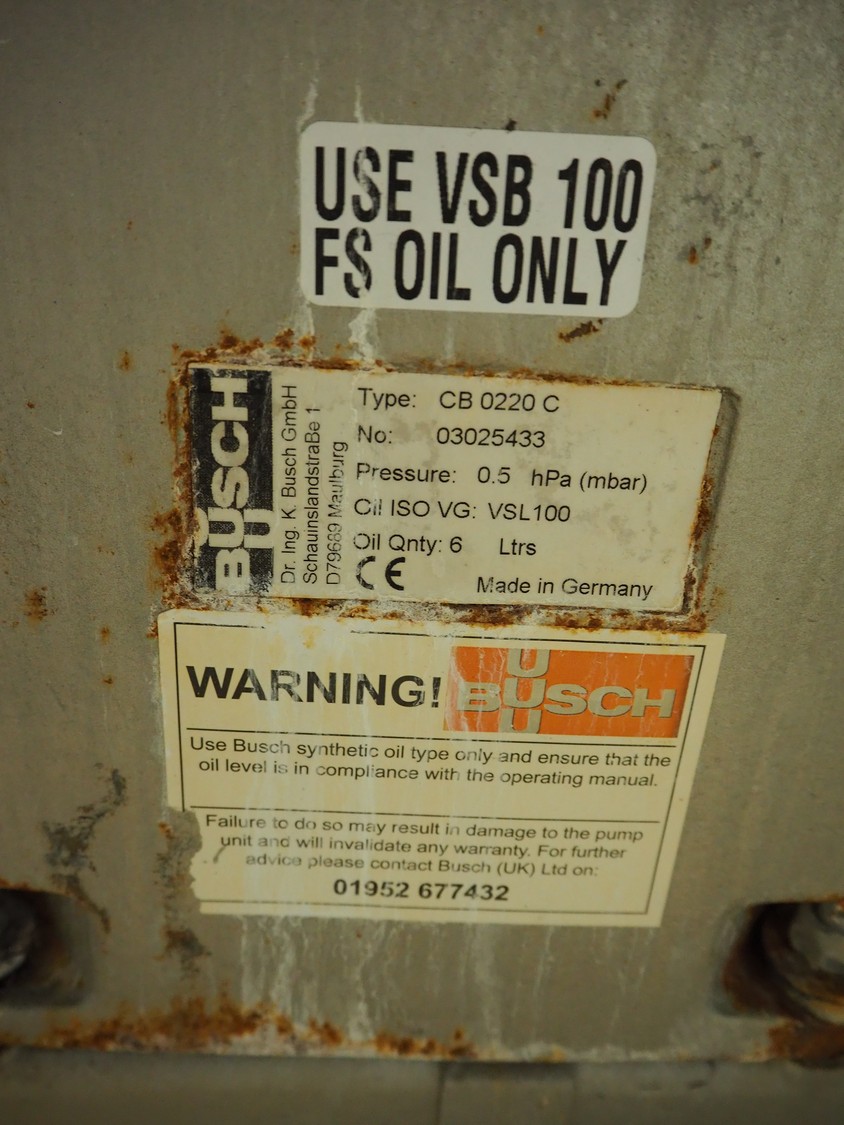 Busch vacuum pump, type: CB 0220 C, number: 03025433, capacity: 220 m³ per hour, dimensions: 1250 mm x 350 mm x 600 mm.