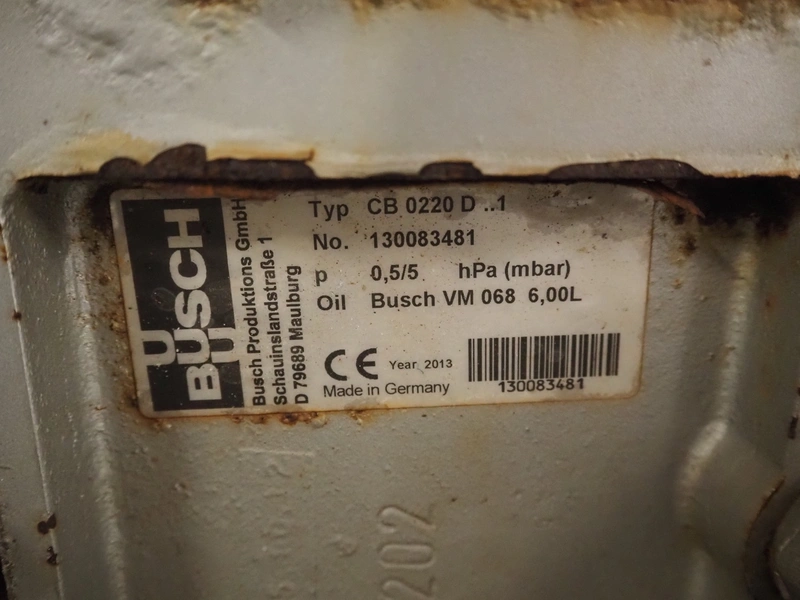 Busch vacuum pump, type: CB 0220 D, serial number: 130083481, year of construction: 2013, capacity: 220 m³ per hour, dimensions: 1000 mm x 350 mm x 600 mm.