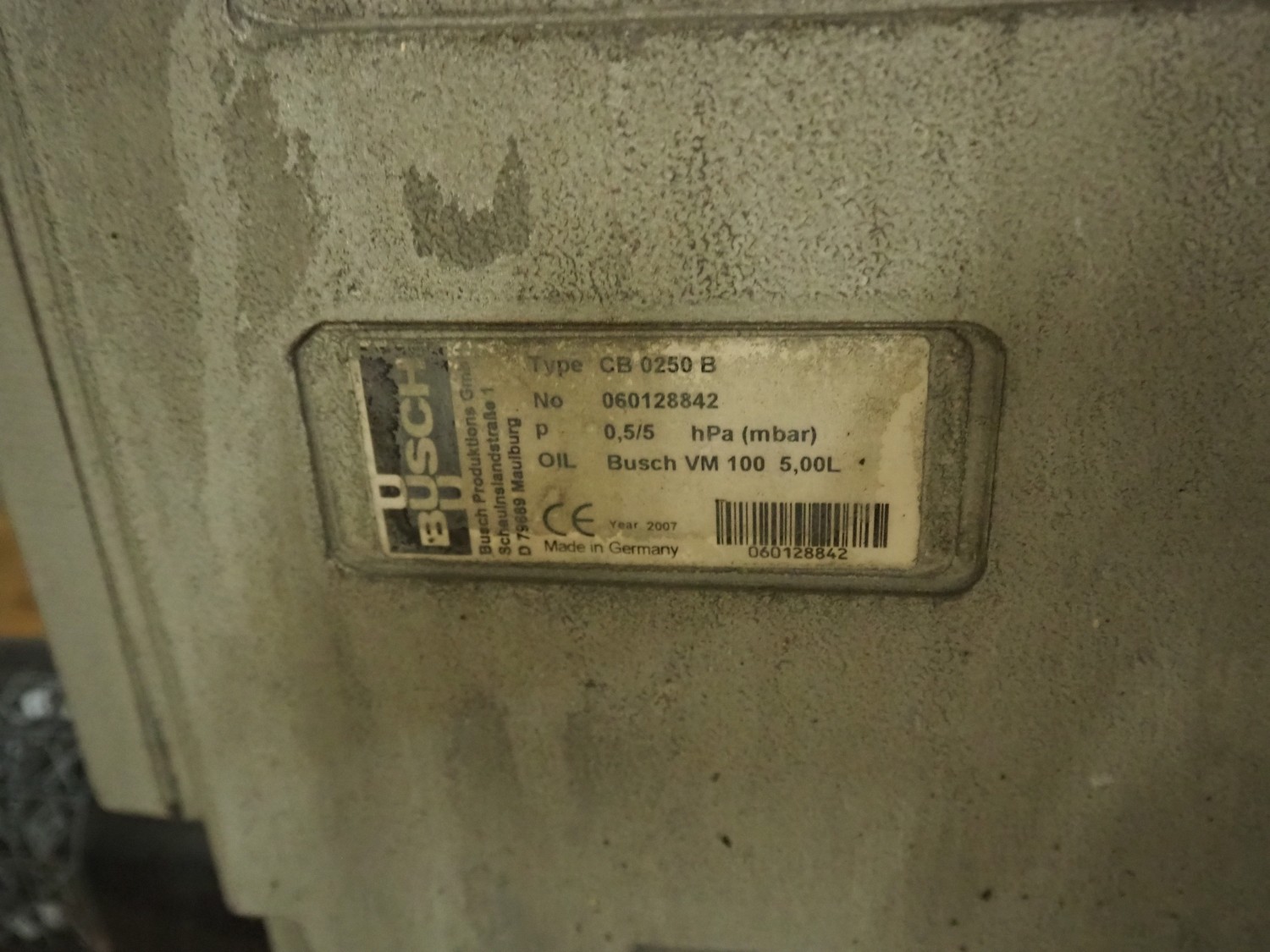 Busch vacuum pump, type: CB 0250 B, number: 060128842, year of construction: 2007, capacity: 250 m³ per hour, dimensions: 1100 mm x 550 mm x 430 mm.
