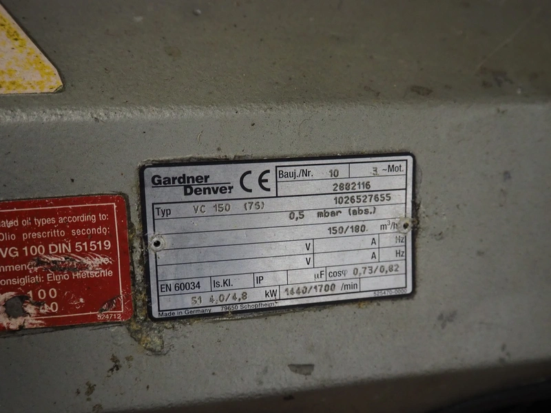 Gardner Denver vacuum pump, type: VC 150 (75), number: 1026527655, year of construction: 2010, capacity: 150/180 m³ per hour, dimensions: 750 mm x 400 mm x 600 mm.