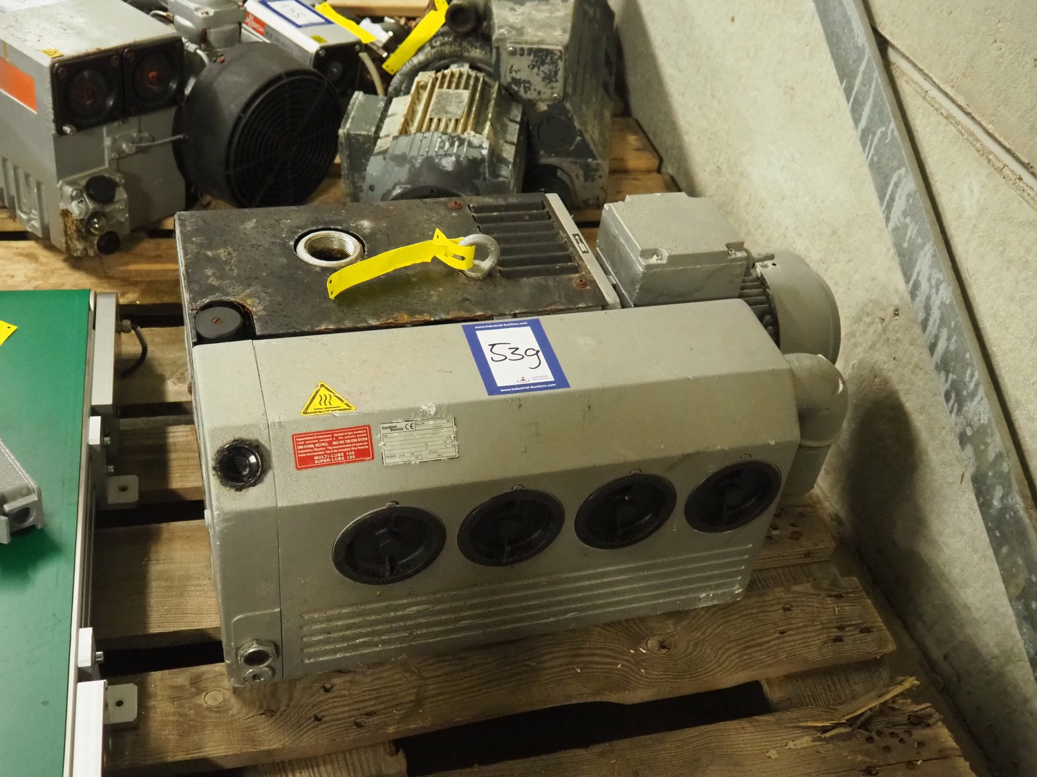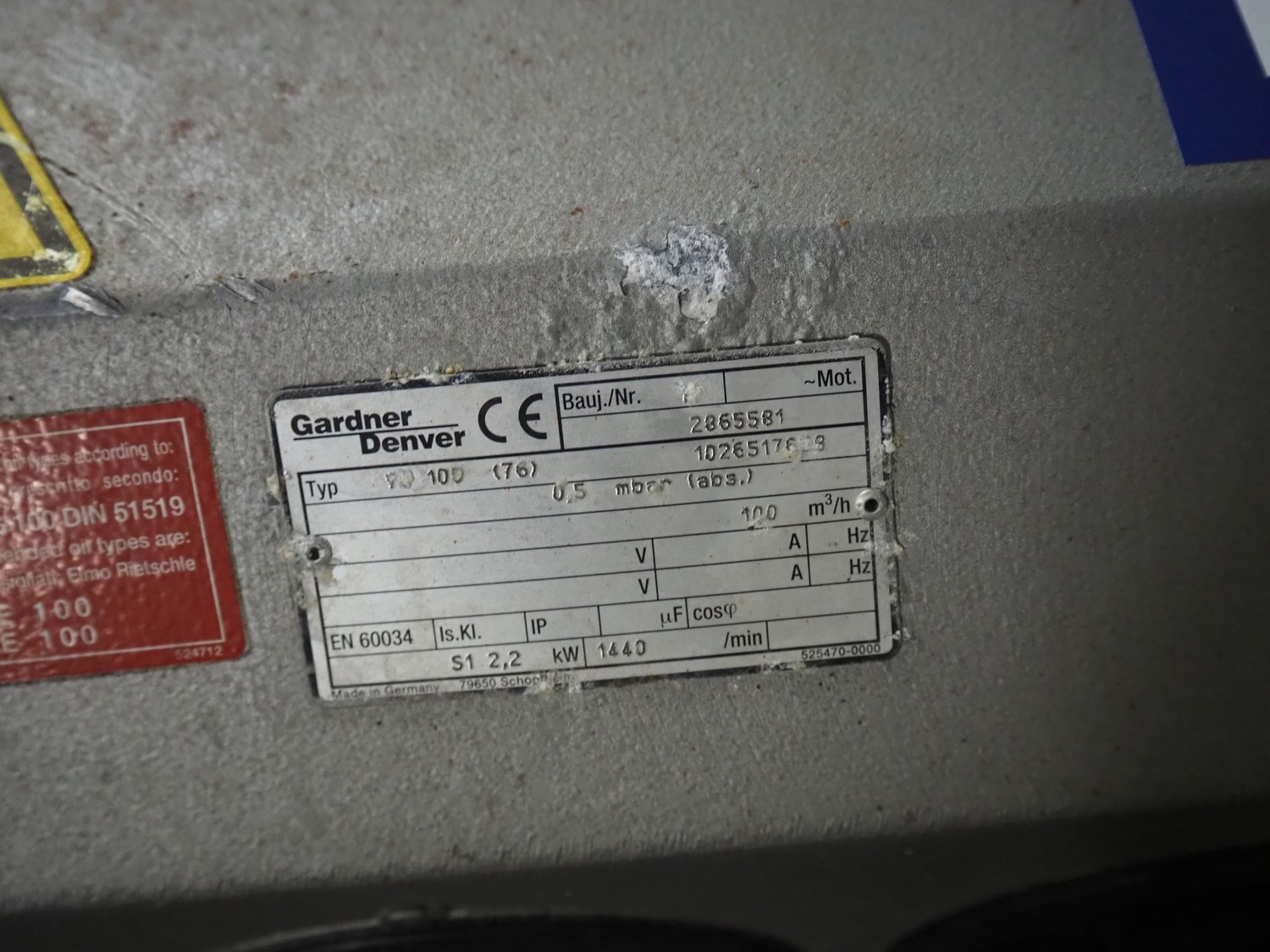 Gardner Denver vacuum pump, type: VC 150 (76), number: 2865581, capacity: 100 m³ per hour, dimensions: 700 mm x 420 mm x 300 mm.