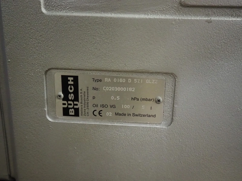 Busch vacuum pump, type: RA 0160 D 5ZI QLZZ, number: C0203000182, year of construction: 2002, capacity: 150 m³ per hour, dimensions: 850 mm x 540 mm x 500 mm.