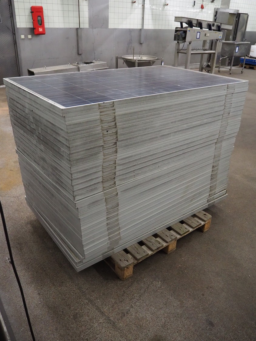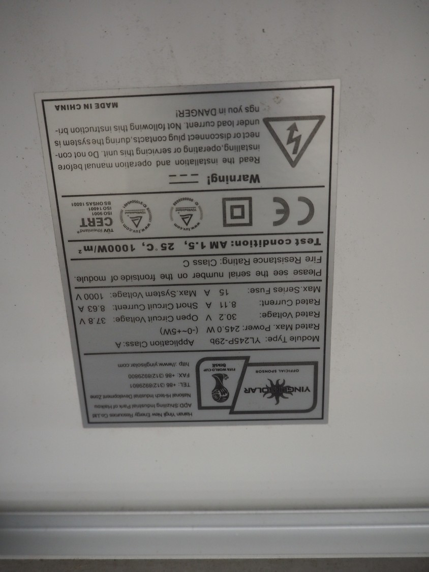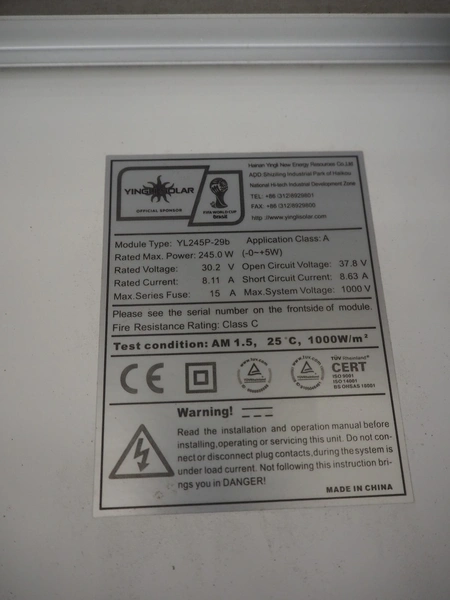 28 Hainan Tingli solar panels, model: YL245P-29b, maximum power: 245 Watt, dimensions: 1650 mm x 990 mm x 1250 mm.