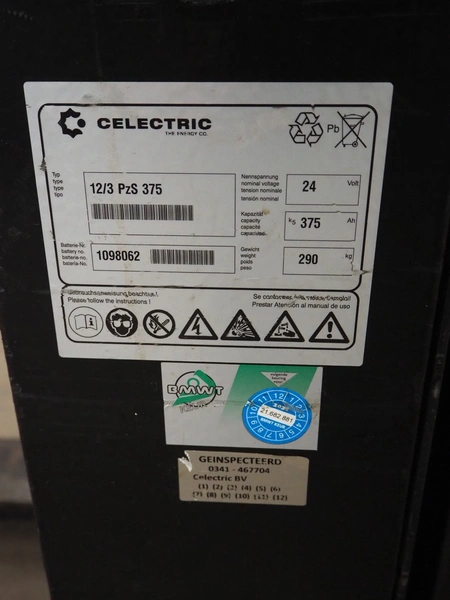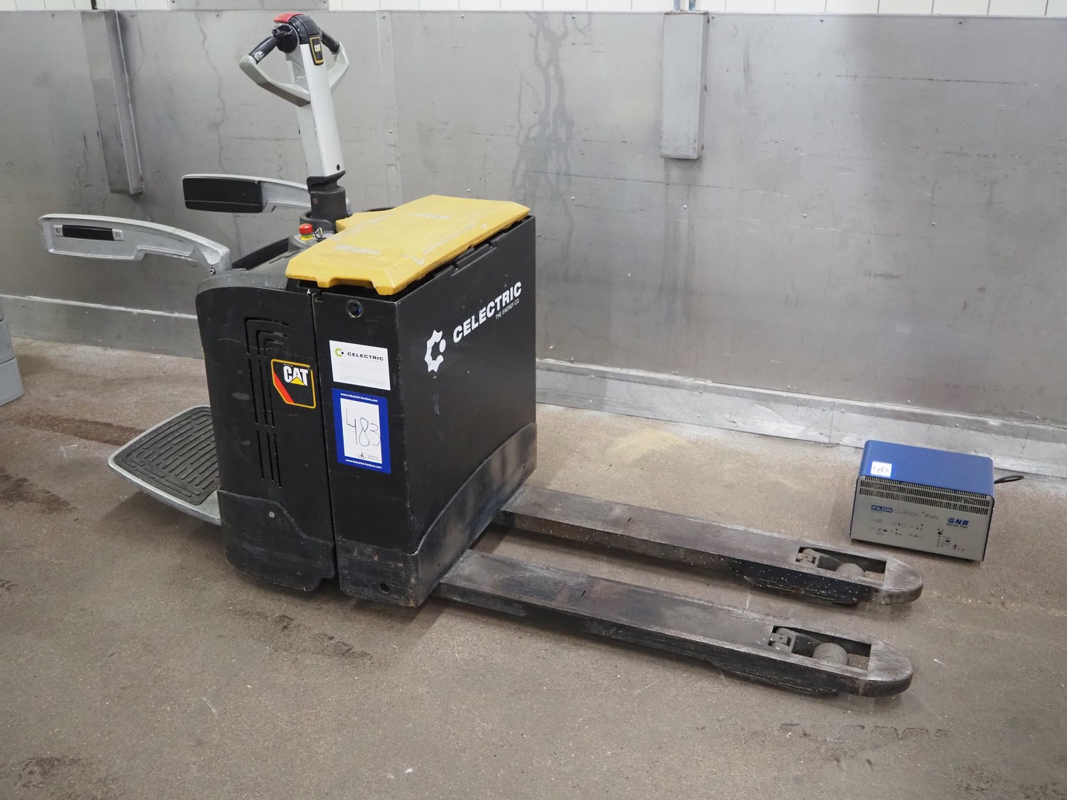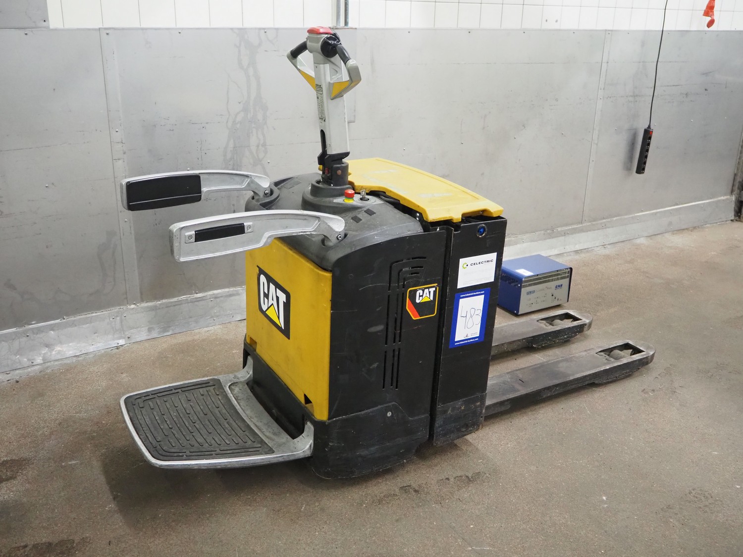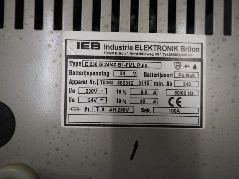 Caterpillar electric forklift, fork length: 1150 mm, total dimensions: 2400 mm x 800 mm x 1500 mm. Including IEB battery charger, type: E 230 G 24/40 B1-FML Puls, dimensions: 360 mm x 240 mm x 240 mm.