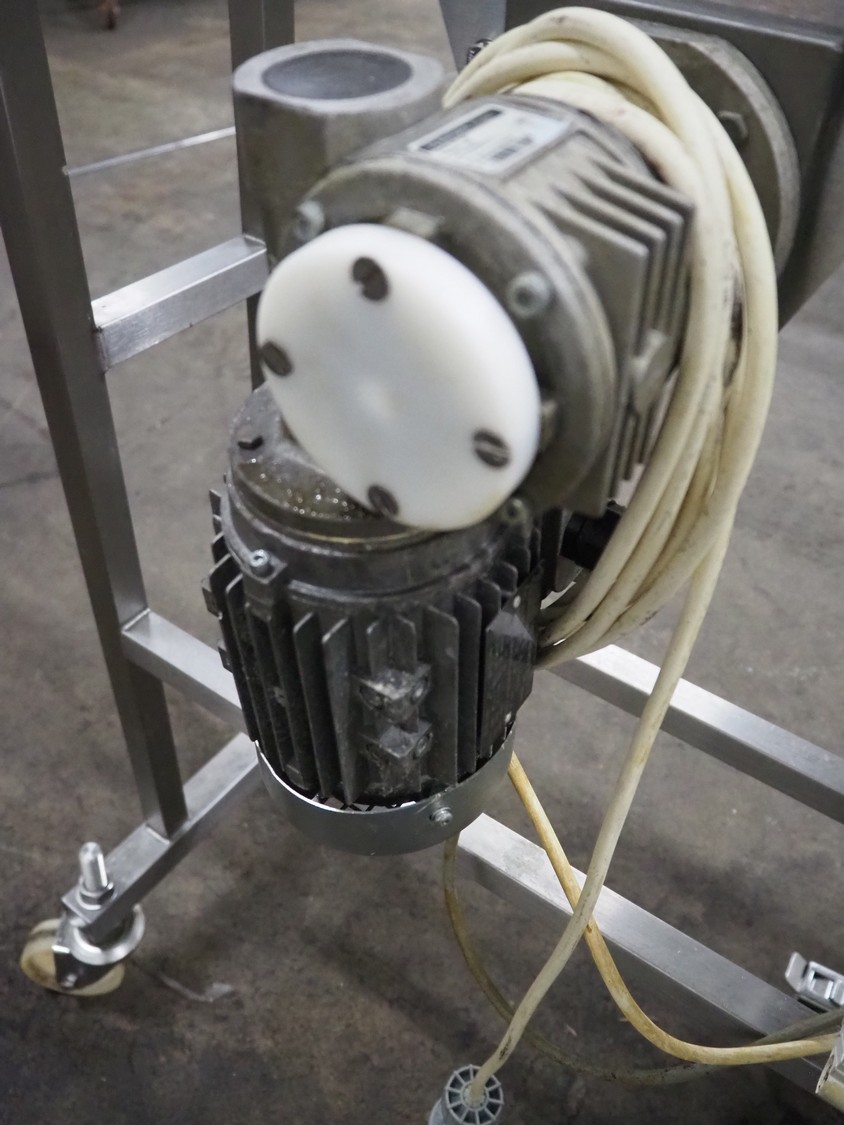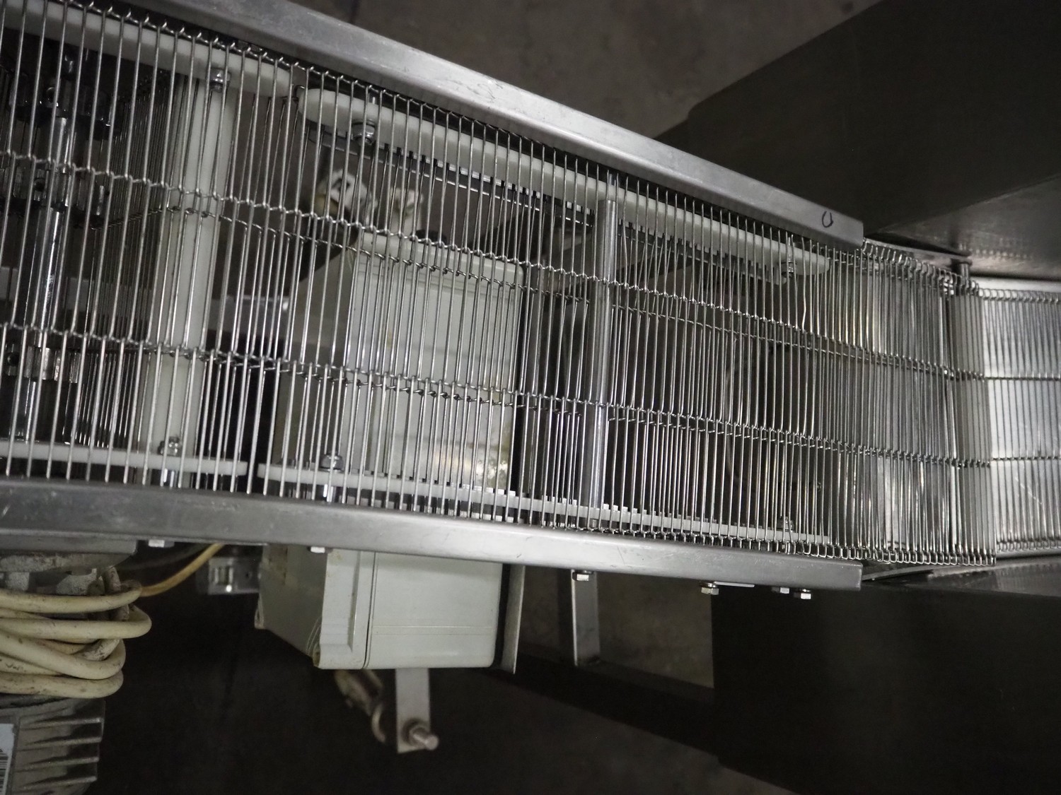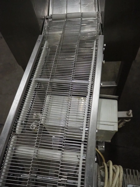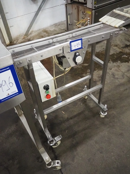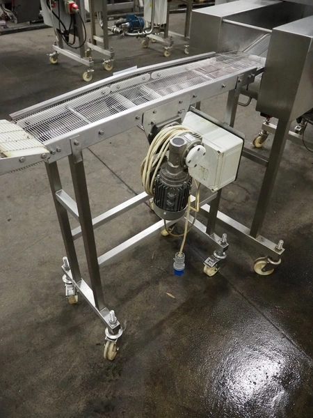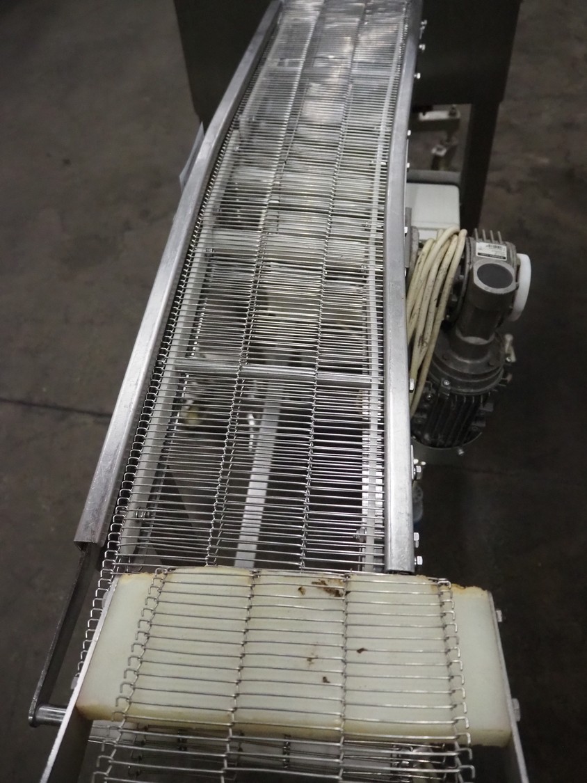 Mobile transport belt, s/s mesh belt, belt width: 180 mm, total dimensions: 1100 mm x 500 mm x 1050 mm.