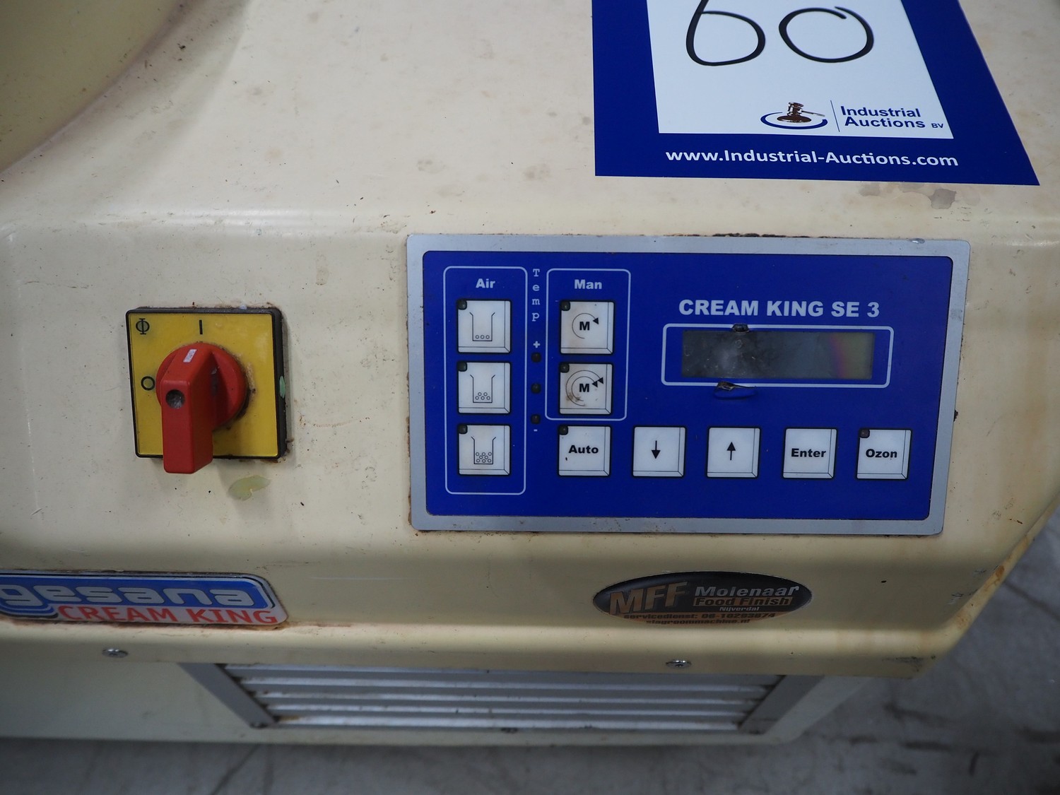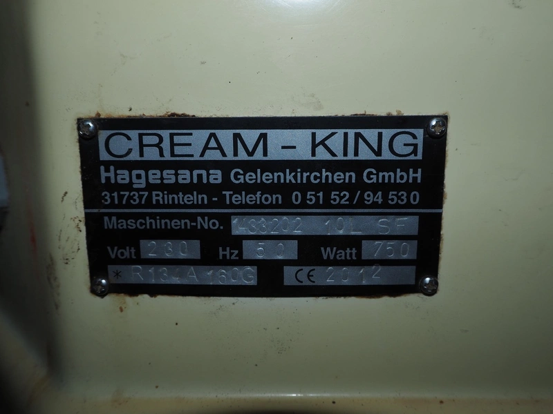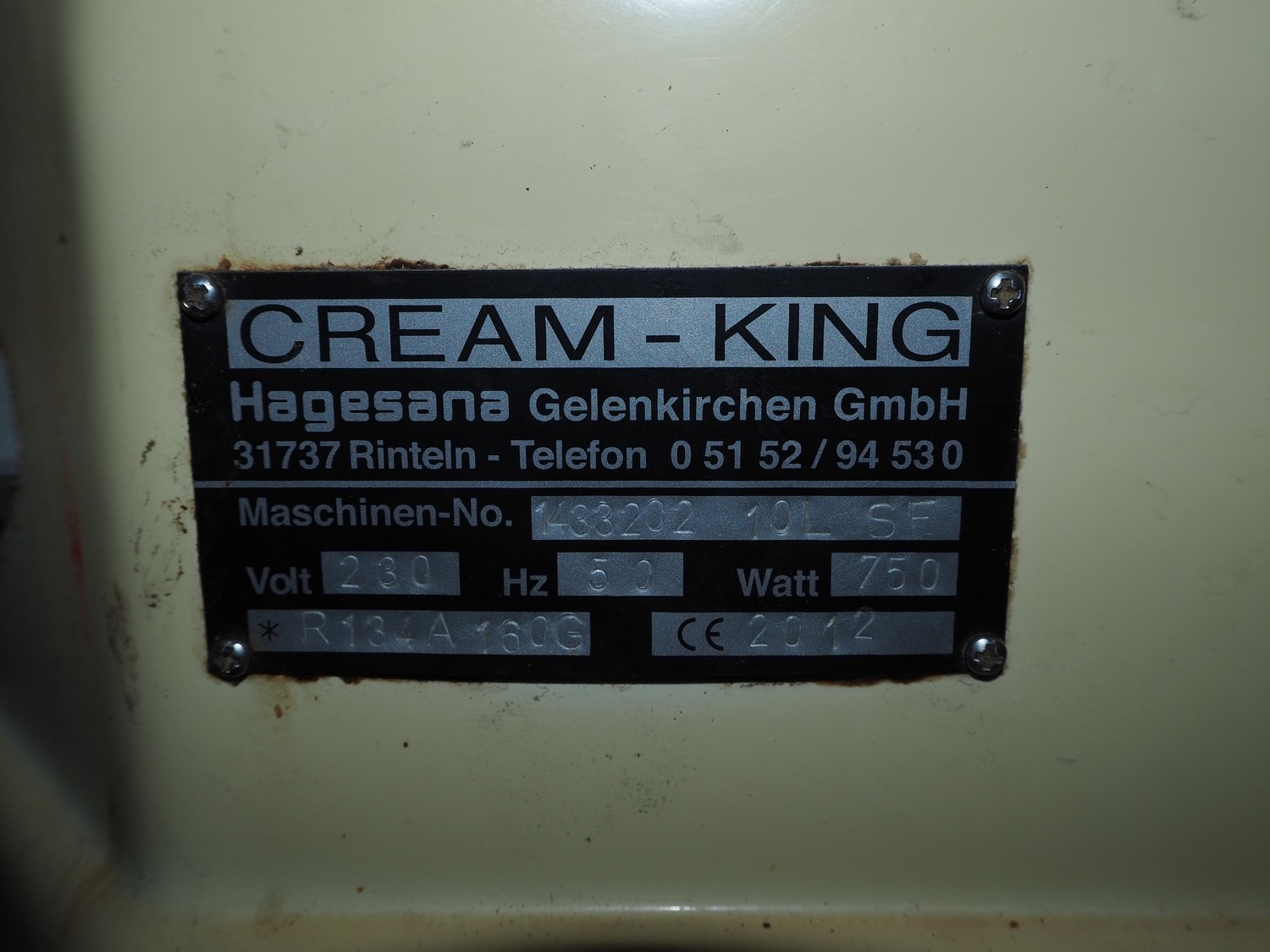 Hagesana whip cream machine, model: CREAM-KING, machine number: 1433232 10L SE, year of construction: 2012, 230 V, 50 Hz, 750 W, refrigerant: R134 A / 160 gram, dimensions: 800 mm x 440 mm x 580 mm. Incomplete.