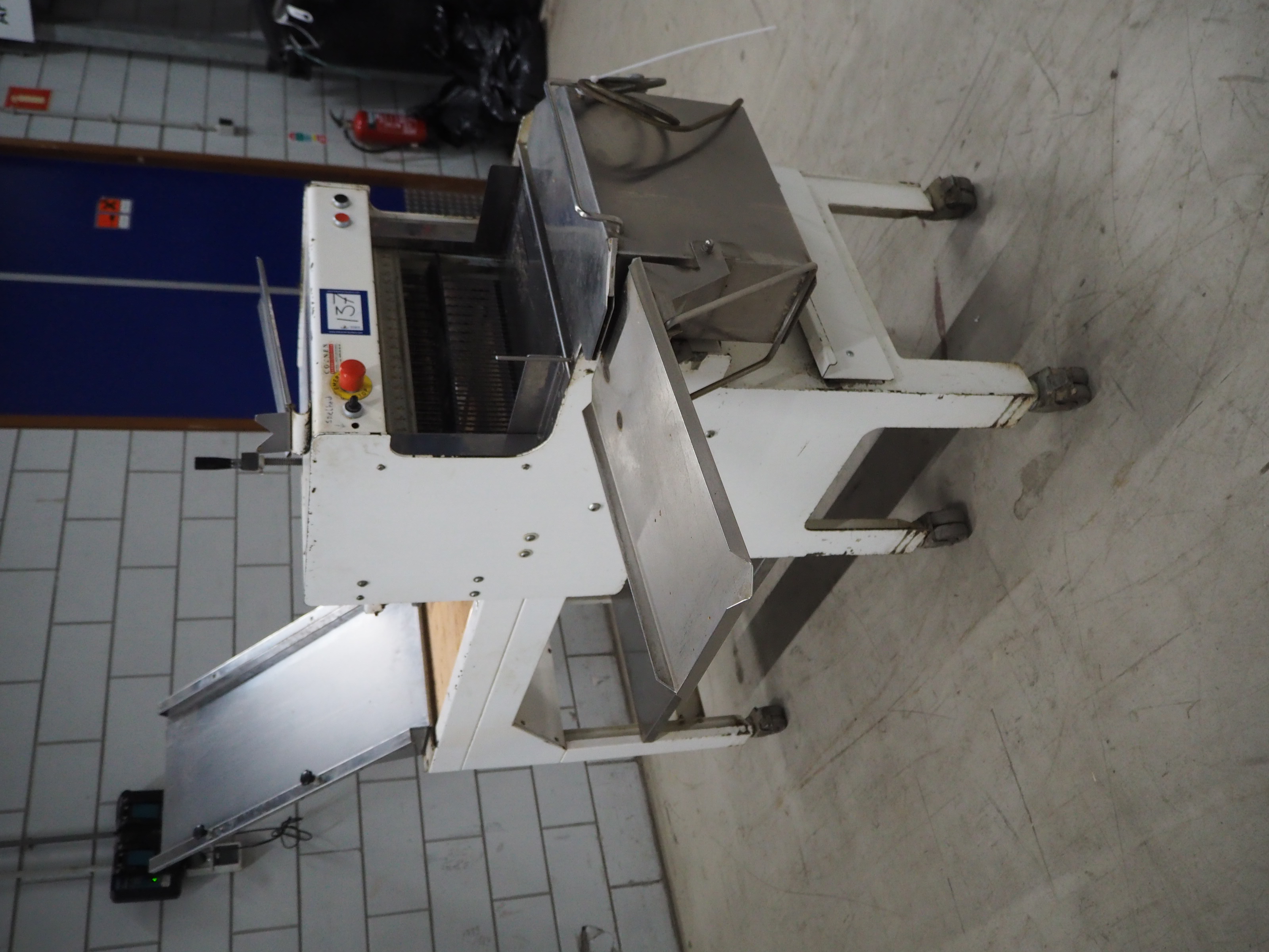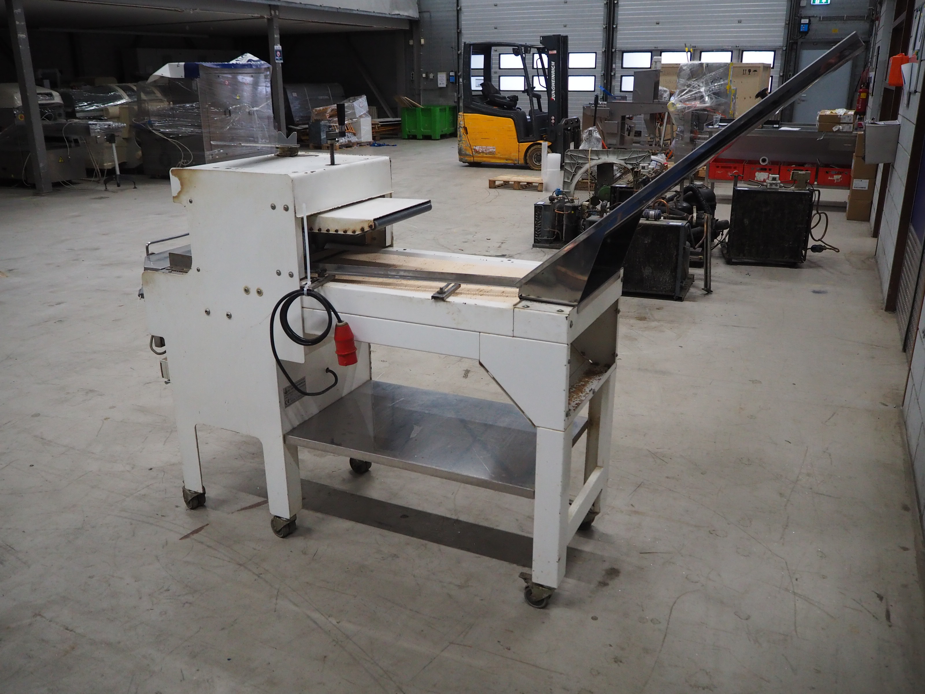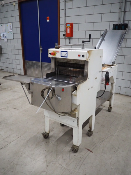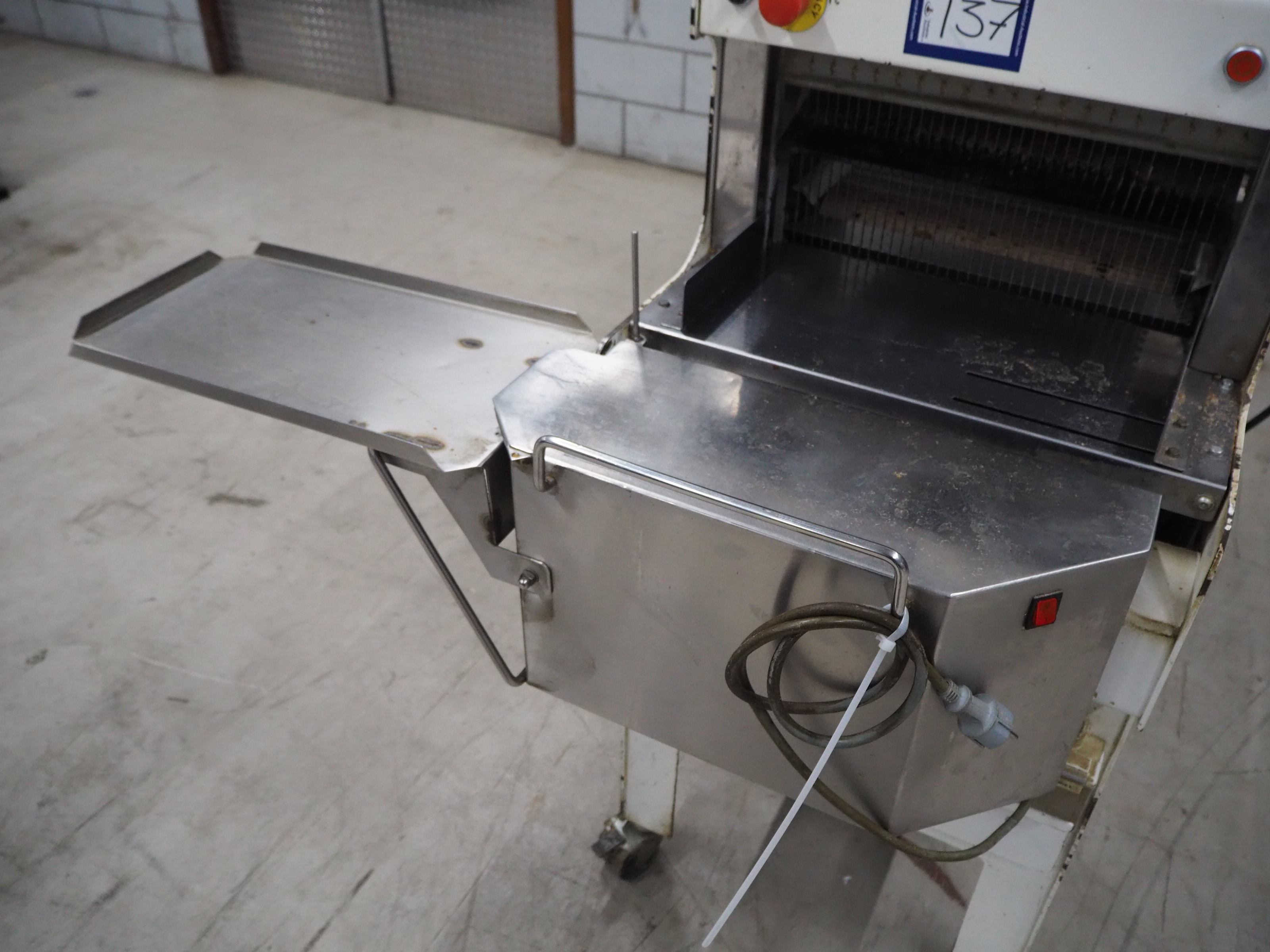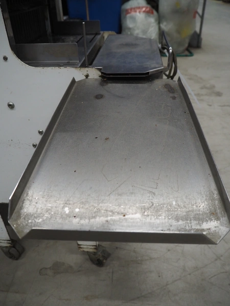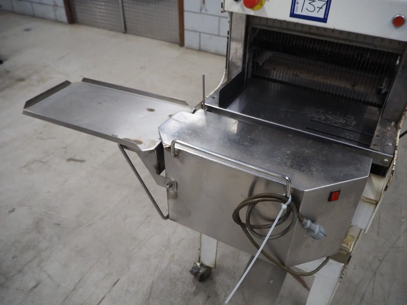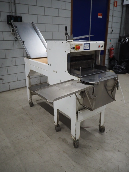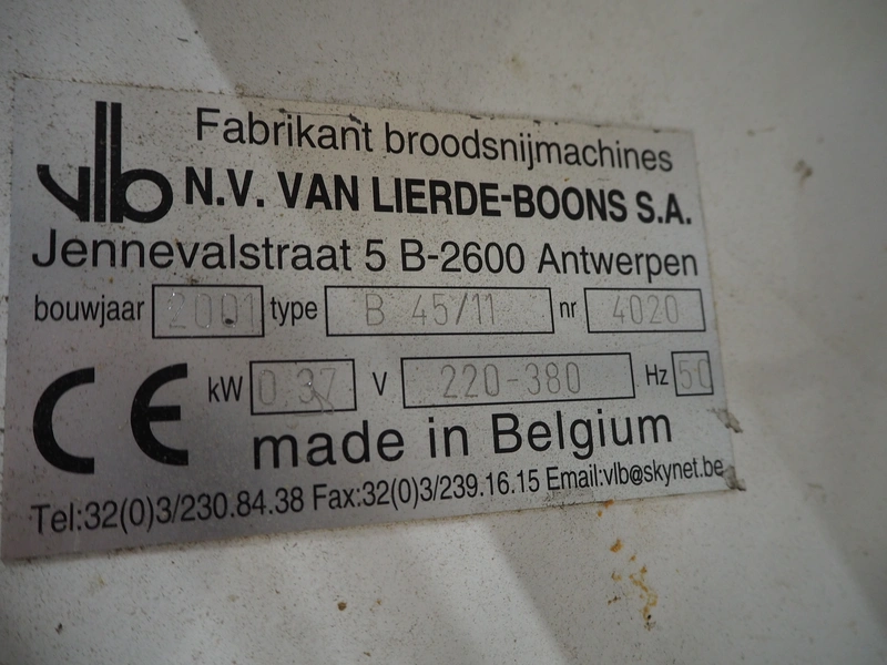 VLB mobile bread slicer with infeed belt, type: B 45/11, number: 4020, year of construction: 2001, 220/380 V, 50 Hz, 0.37 kW, plastic belt, belt width: 400 mm, plastic rollers, roller width: 400 mm, 38 knives, distance between knives: 11 mm, total dimensions: 2300 mm x 1100 mm x 1450 mm.