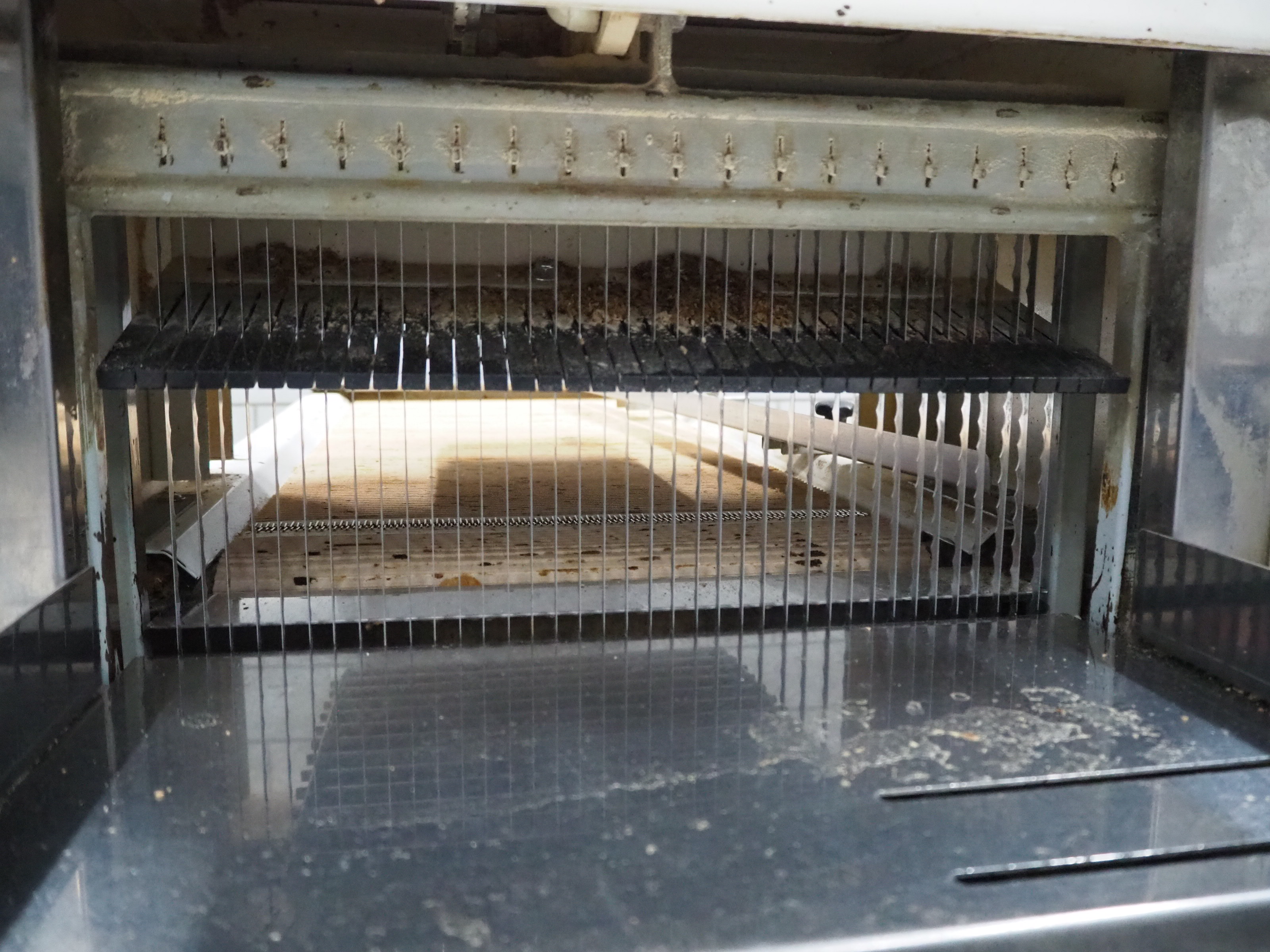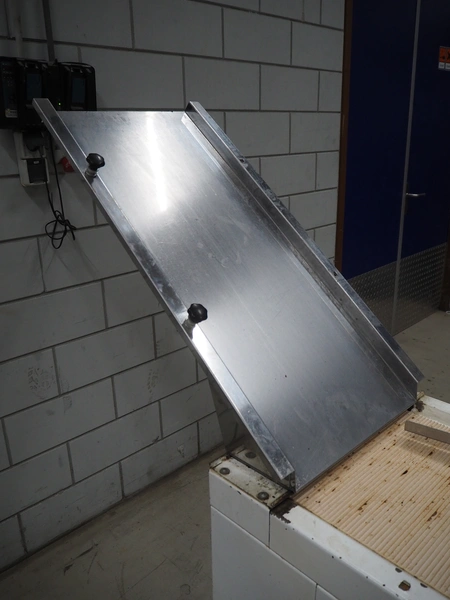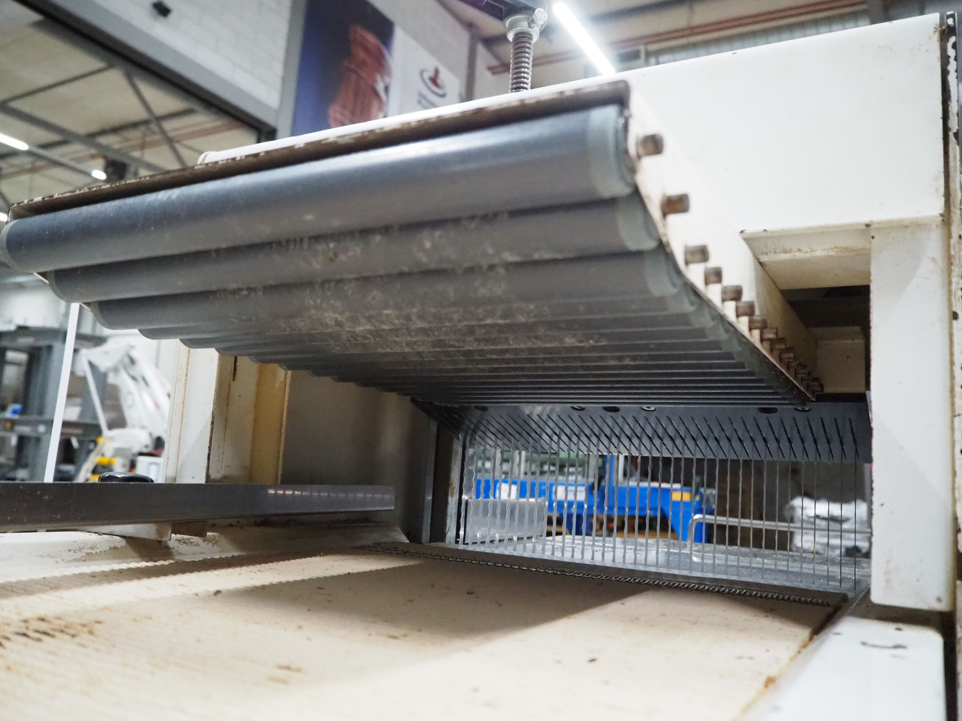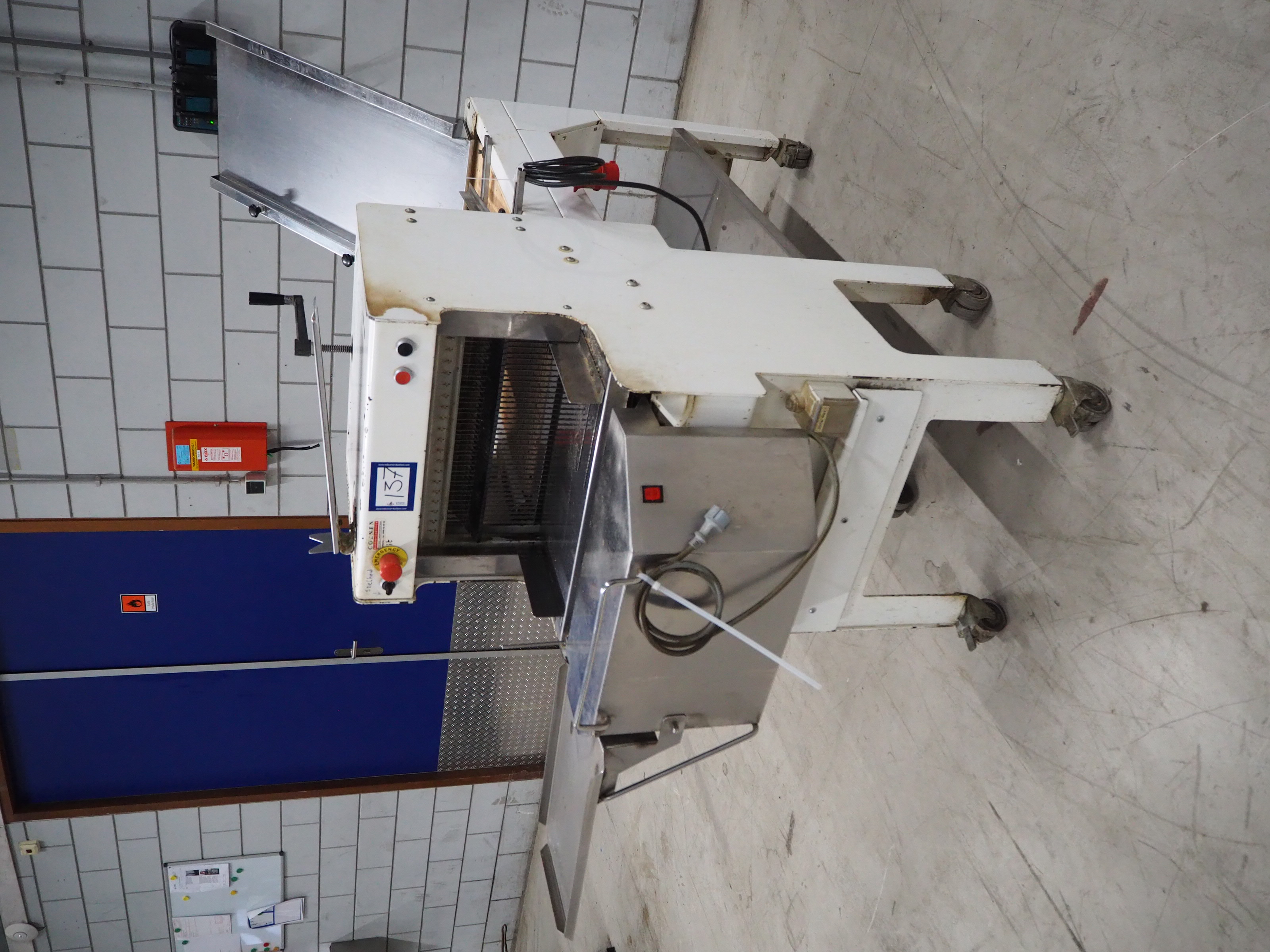 VLB mobile bread slicer with infeed belt, type: B 45/11, number: 4020, year of construction: 2001, 220/380 V, 50 Hz, 0.37 kW, plastic belt, belt width: 400 mm, plastic rollers, roller width: 400 mm, 38 knives, distance between knives: 11 mm, total dimensions: 2300 mm x 1100 mm x 1450 mm.