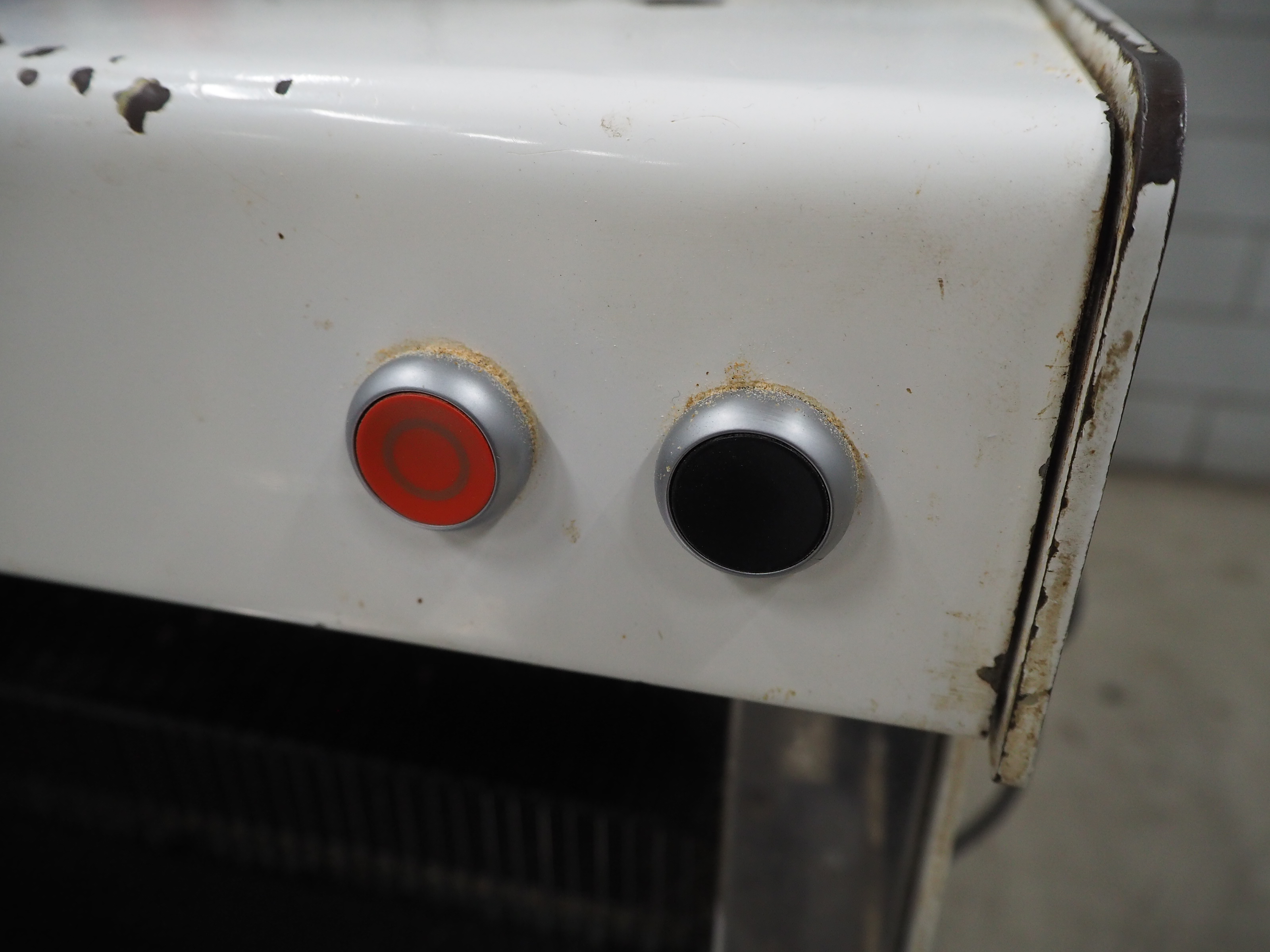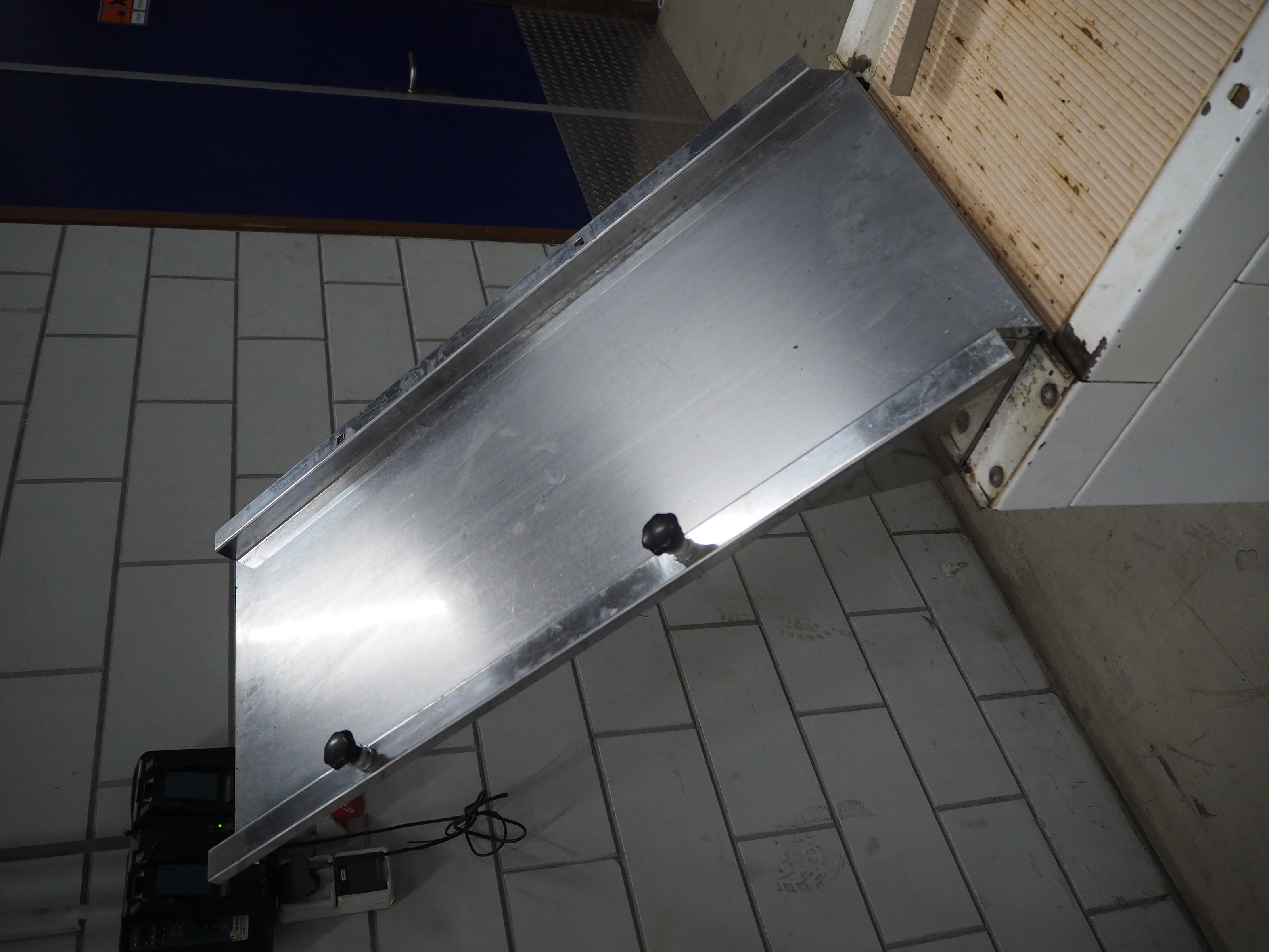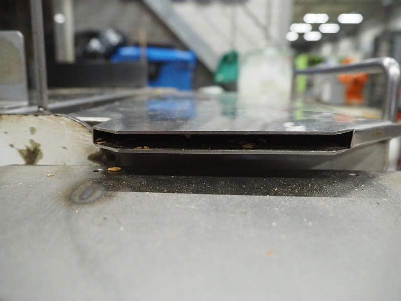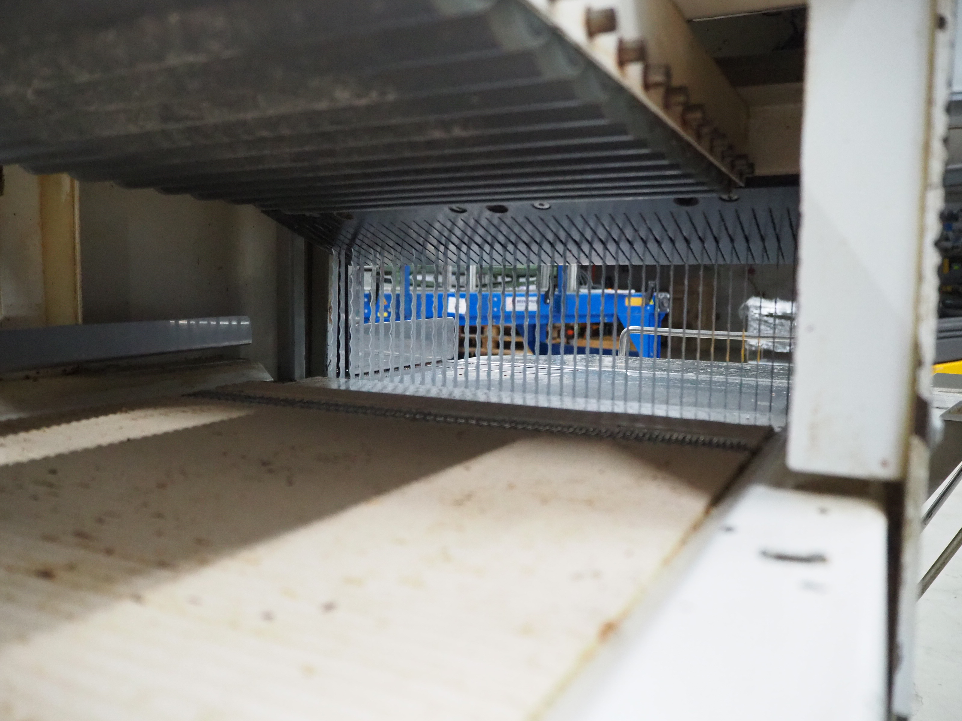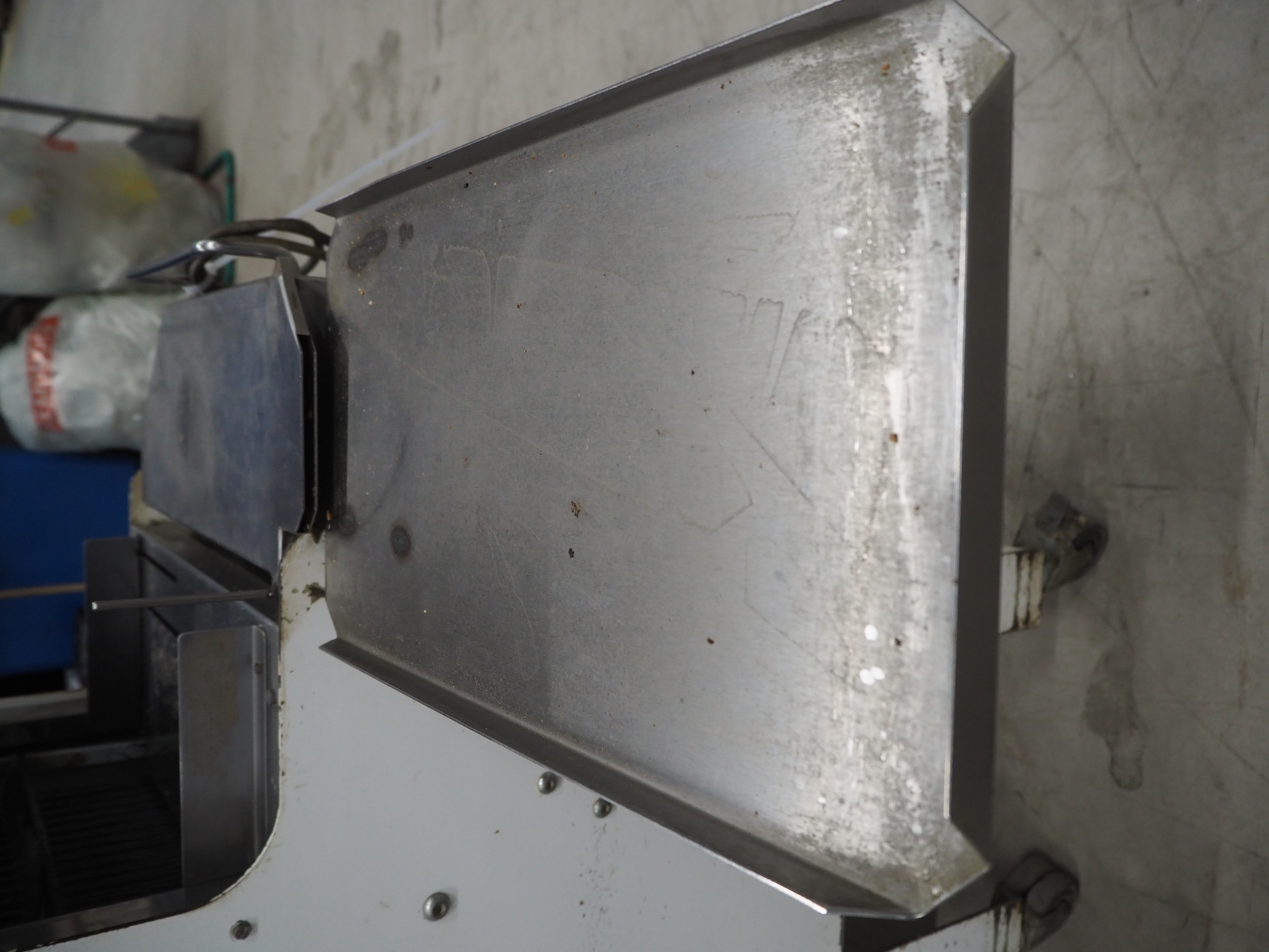 VLB mobile bread slicer with infeed belt, type: B 45/11, number: 4020, year of construction: 2001, 220/380 V, 50 Hz, 0.37 kW, plastic belt, belt width: 400 mm, plastic rollers, roller width: 400 mm, 38 knives, distance between knives: 11 mm, total dimensions: 2300 mm x 1100 mm x 1450 mm.