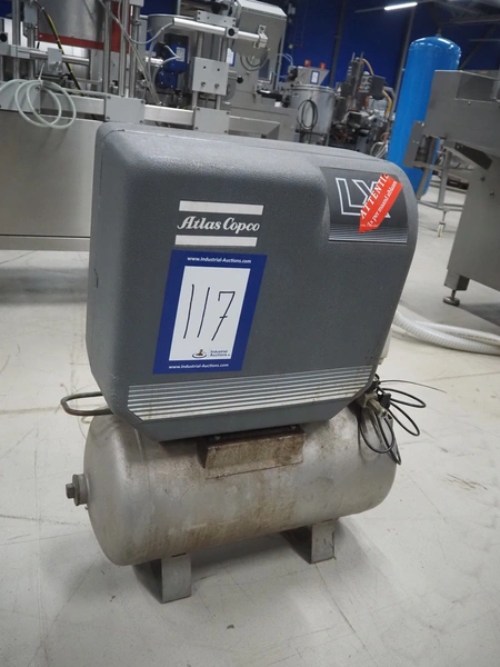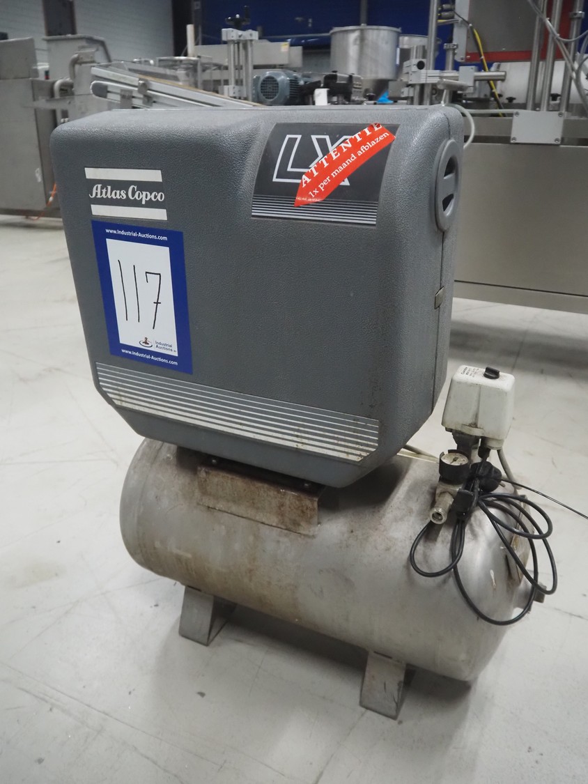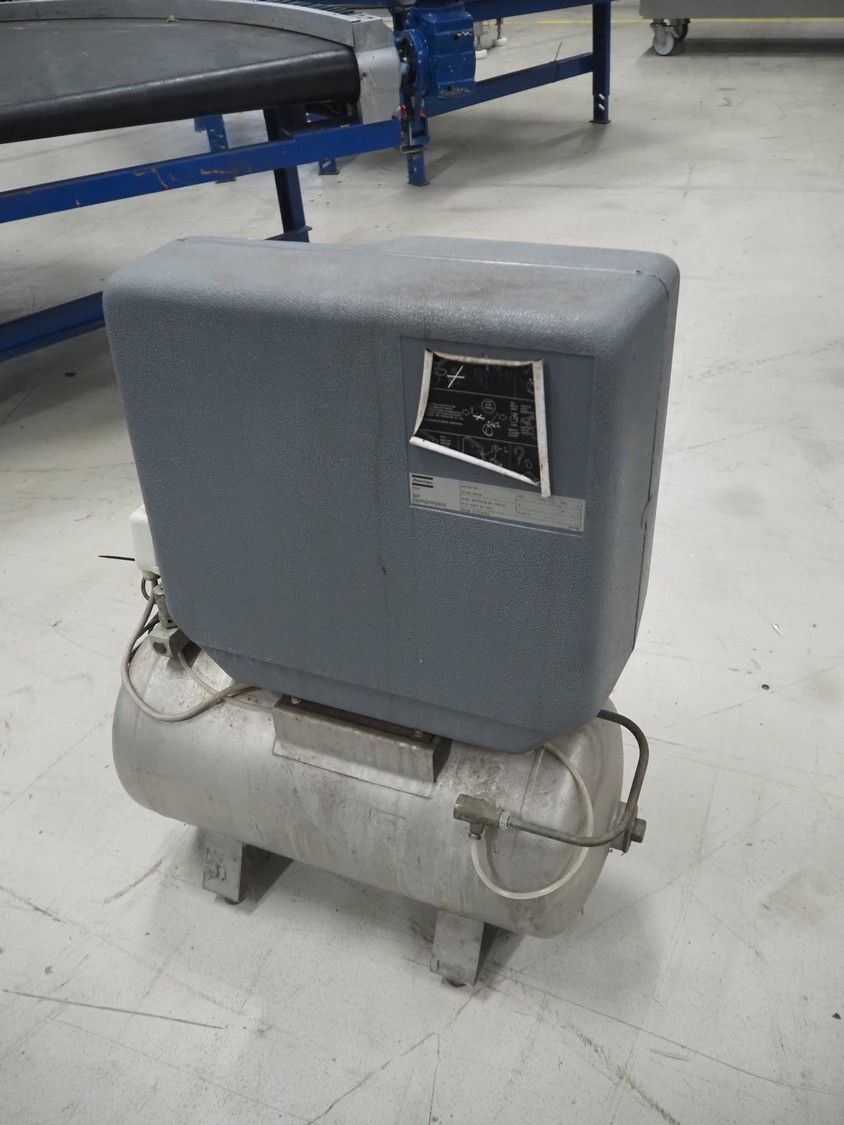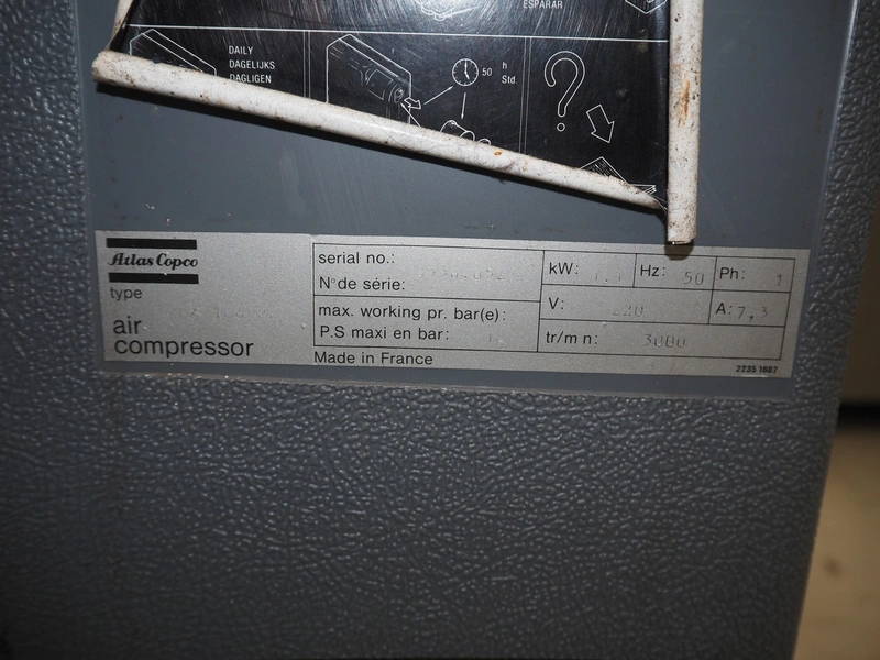 Atlas Copco mobile air compressor, 220 V, 1 Ph, 50 Hz, 7.3 A, 1.1 kW, dimensions: 730 mm x 370 mm x 900 mm.