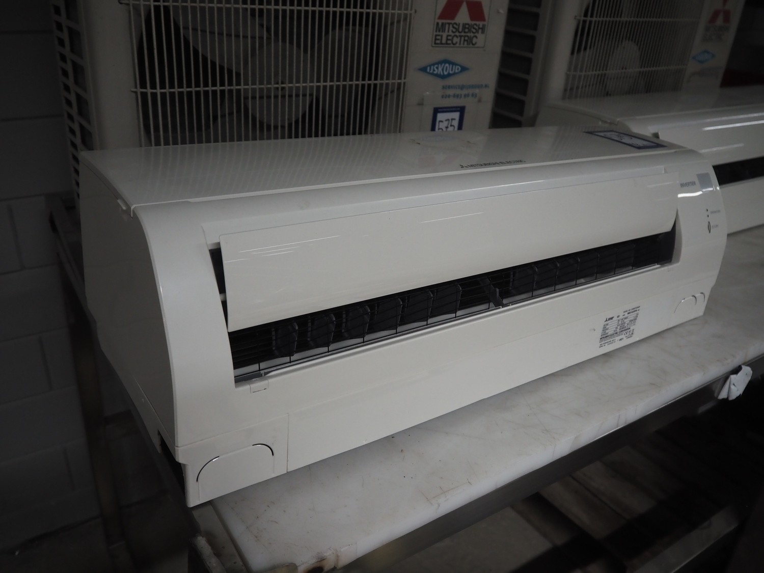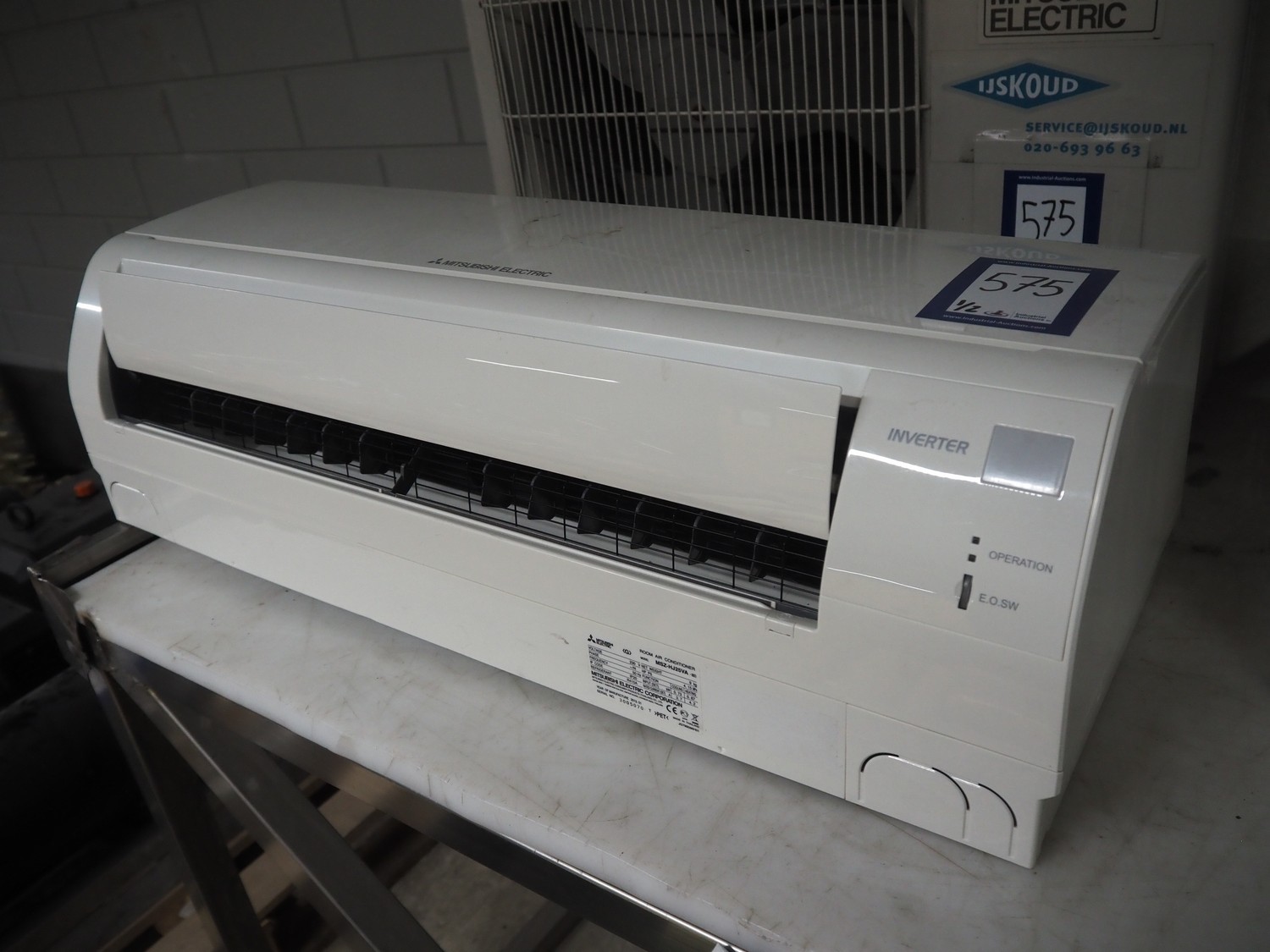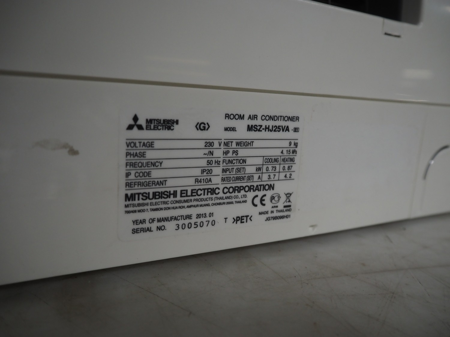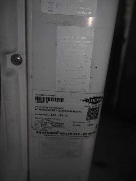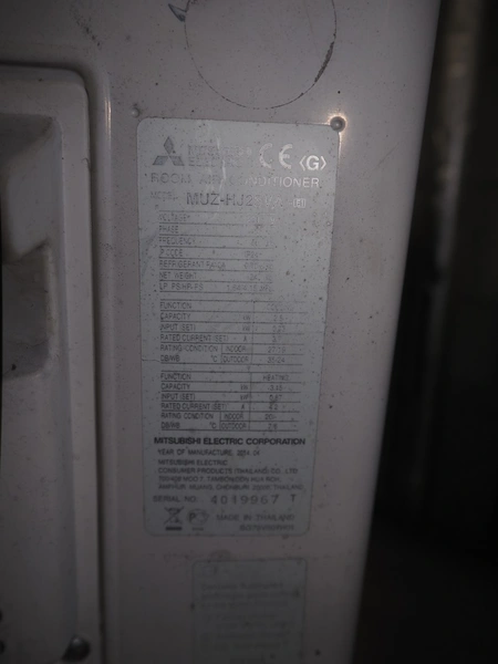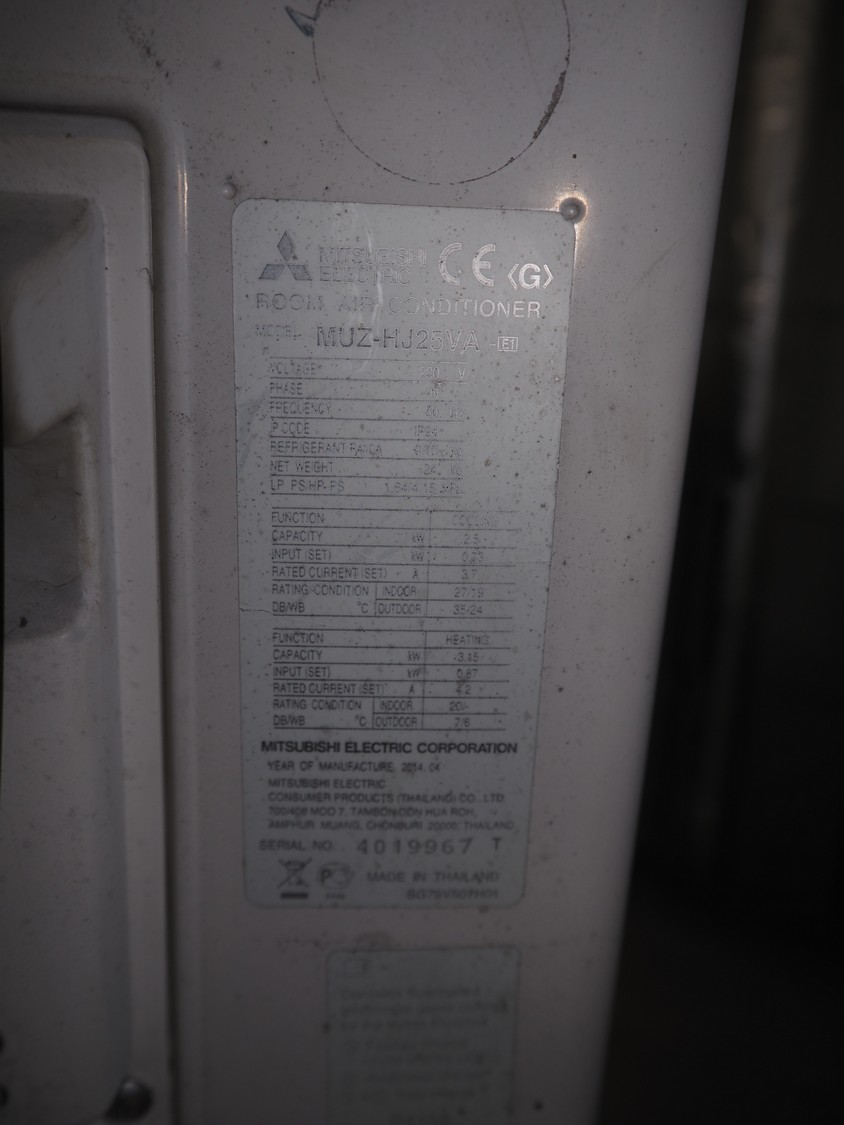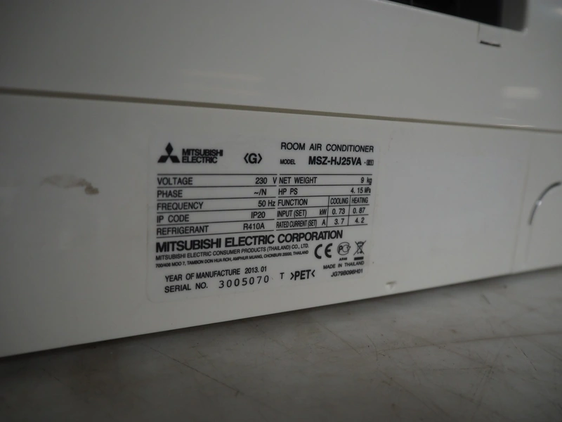 Mitsubishi inside and outside air conditioning unit, type outside unit: MUZ-HJ25VA, 230 V, 50 Hz, dimensions: 800 mm x 300 mm x 230 mm, type inside unit: MSZ-HJJ25VA, serial number: 3005070, year of construction: 2013, 230 V, 50 Hz, refrigerant: R410A, dimensions: 700 mm x 270 mm x 530 mm.