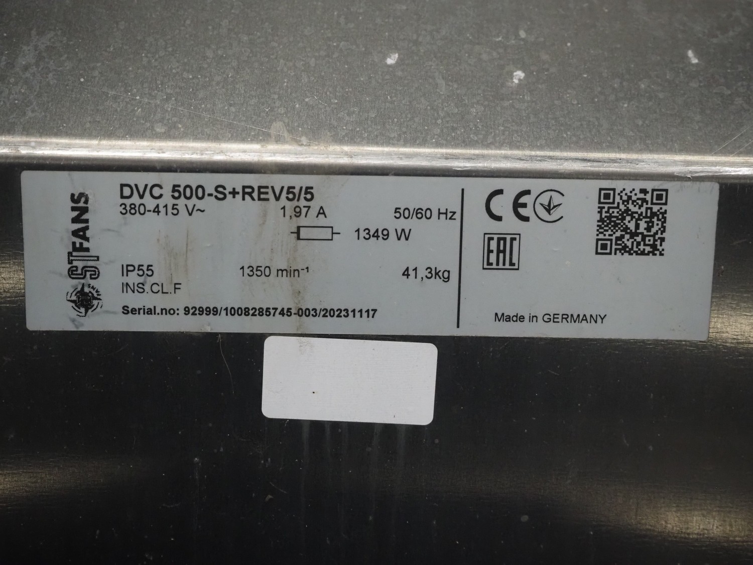 ST Fans fan, model: DVC 500-S+REV5/5, serial number: 92999/1008285745-003/20231117, 380-415 V, 50/60 Hz, 1.97 A, 1349 W, dimensions: 910 mm x 910 mm x 500 mm.