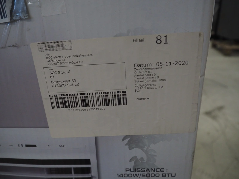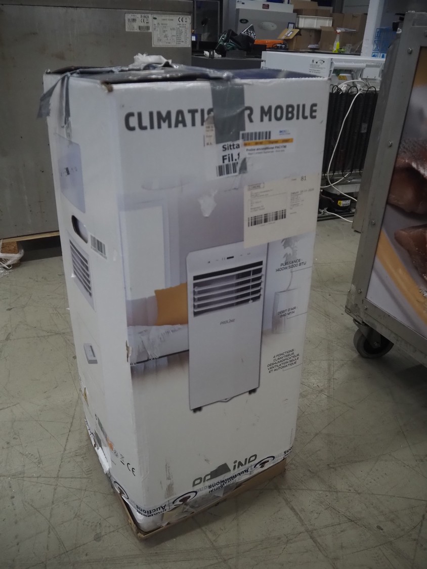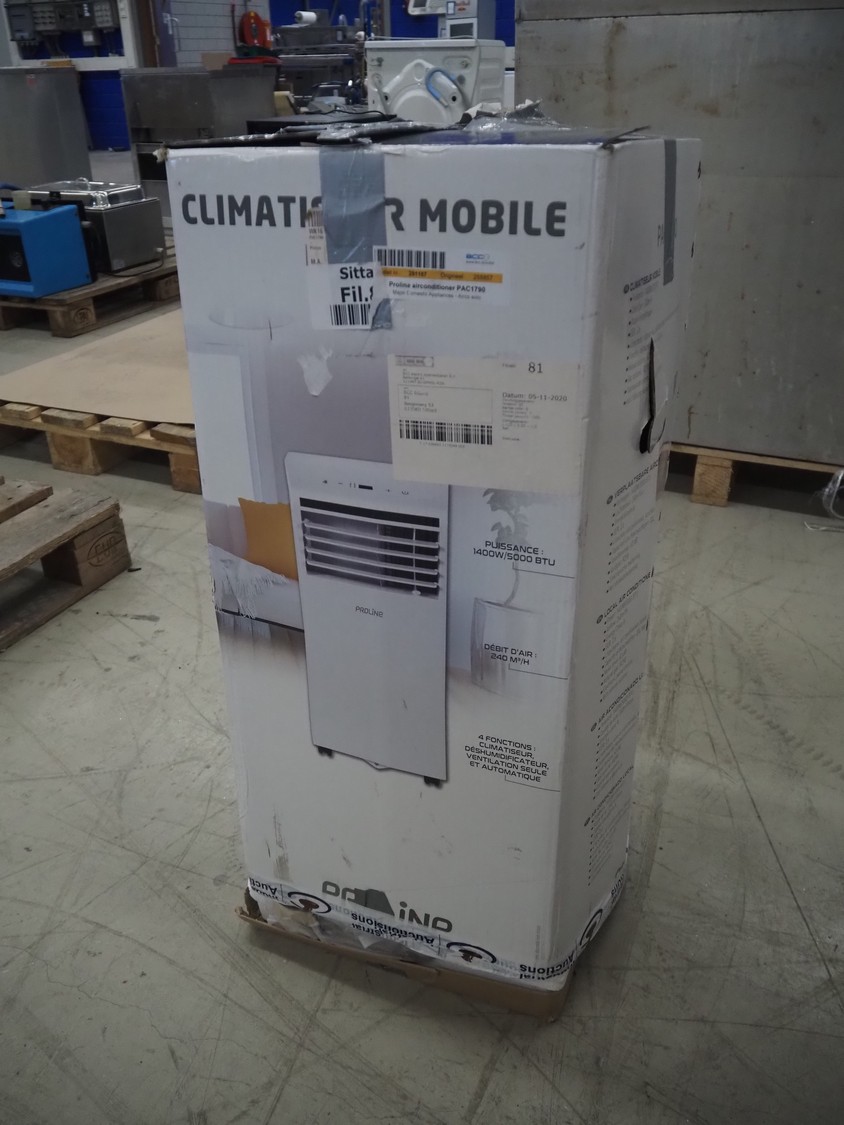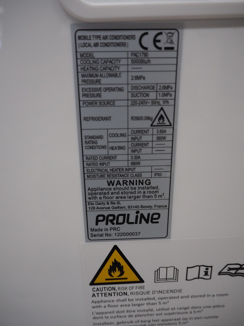 Proline air conditioning unit, model: PAC1790, serial number: 122000037, 220-240 V, 1 Ph, 50 Hz, 2.6 A, 560 W, refrigerant: R290, 0.09 kg, dimensions: 400 mm x 400 mm x 800 mm.