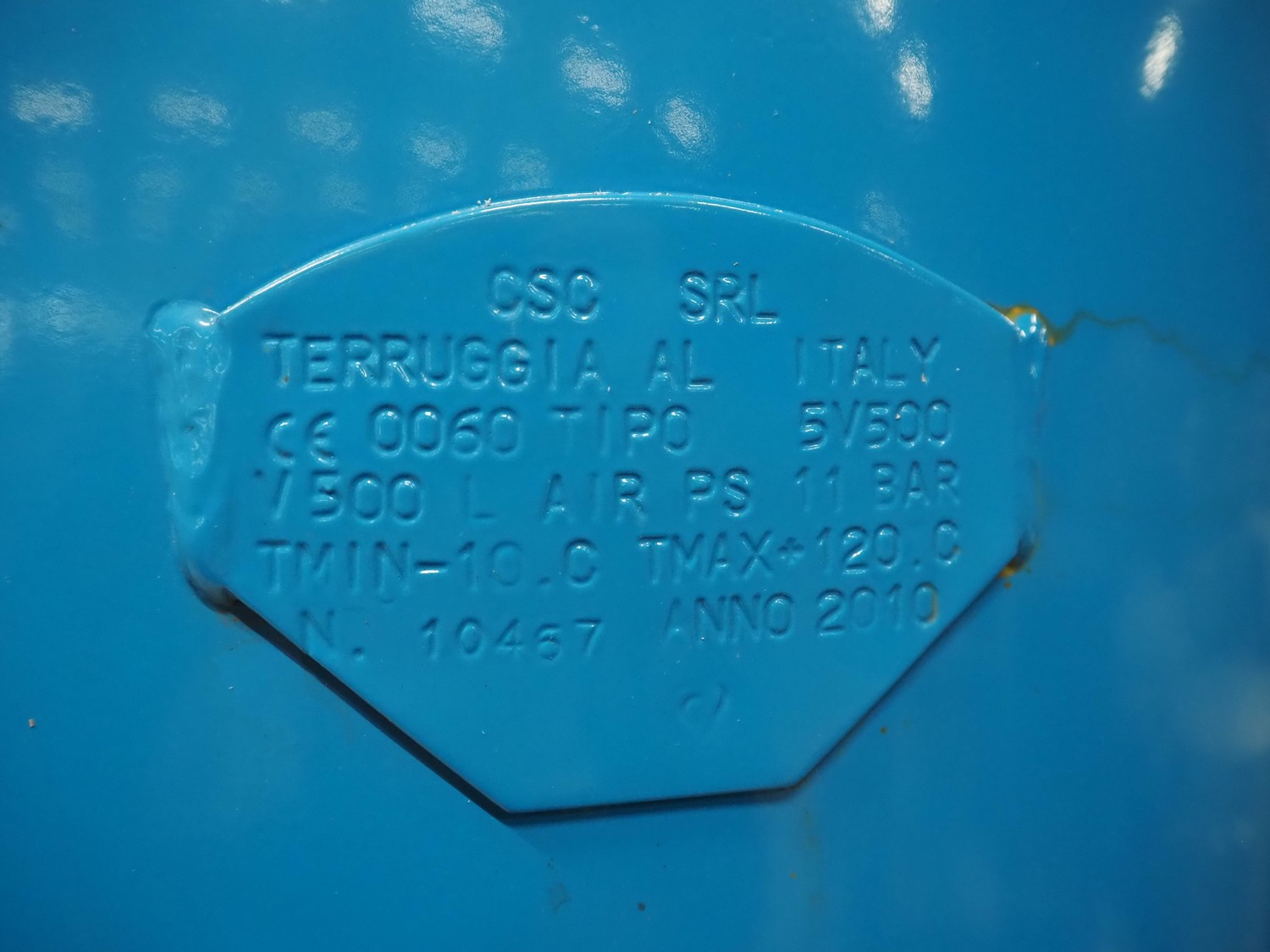 CSL SRL pressure tank, type: 0060, number: 10467, year of construction: 2010, volume: 500 liter, max pressure: 11 bar, max temperature: 120 C°, dimensions: Ø 600 mm x 2170 mm.