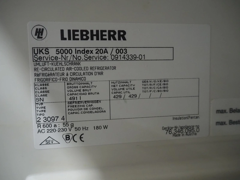 Liebherr refrigerator, type: 2 3097 4, serial number: 76.346.095.0, 220/230 V, 50 Hz, 180 W, refrigerant: R 600 a, 55 g, 5 floors, floor dimensions: 520 mm x 670 mm, total dimensions: 660 mm x 750 mm x 1630 mm.