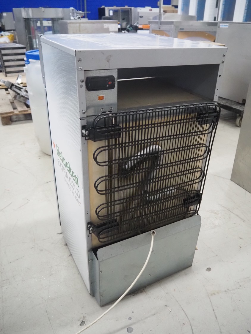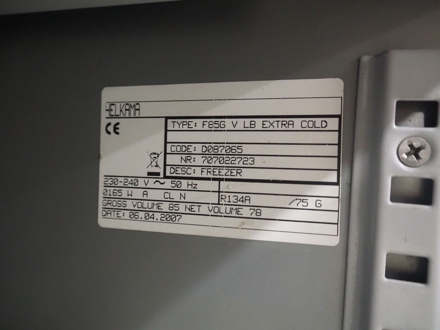 Helkama refrigerator, type: F85G V LB EXTRA COLD, number: 707022723, year of construction: 06.04.2007, 230/240 V, 1 Ph, 50 Hz, refrigerant: R134A, 75 g, 2 floors, floor dimensions: 270 mm x 430 mm, total dimensions: 500 mm x 500 mm x 950 mm.