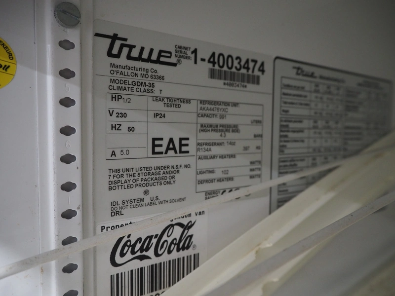 True refrigerator, model: GDM-35, serial number: 1-4003474, 230 V, 50 Hz, 5.0 A, refrigerant: R134a, 387 gram, volume: 991 liter, dimensions: 1000 mm x 780 mm x 2000 mm.