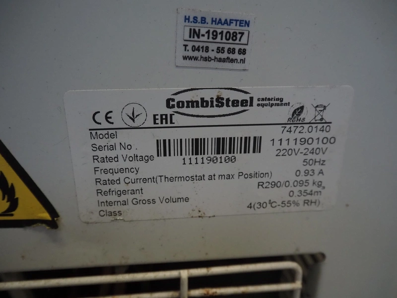 CombiSteel refrigerated showcase, model: 7472.0140, serial number: 111190100, 220/240 V, 50 Hz, 0.93 A, refrigerant: R290, 0.095 kg, 8 compartments, dimensions compartments: (8x) 335 mm x 140 mm, total dimensions: 1210 mm x 850 mm x 1280 mm.