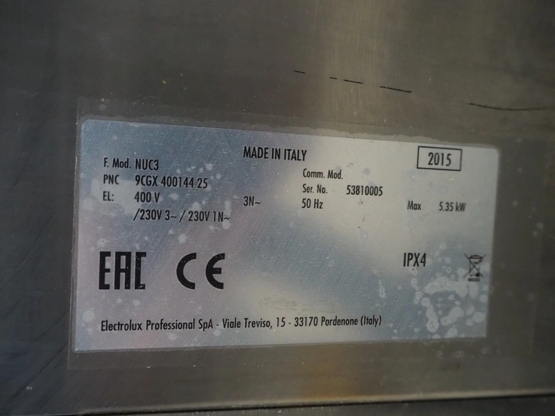 Electrolux Professional SpA dishwasher, model: NUC3, serial number: 53810005, year of construction: 2015, 400 V, 3 Ph, 50 Hz, 5.35 kW, dimensions basket: 500 mm x 500 mm, total dimensions: 650 mm x 600 mm x 1280 mm.