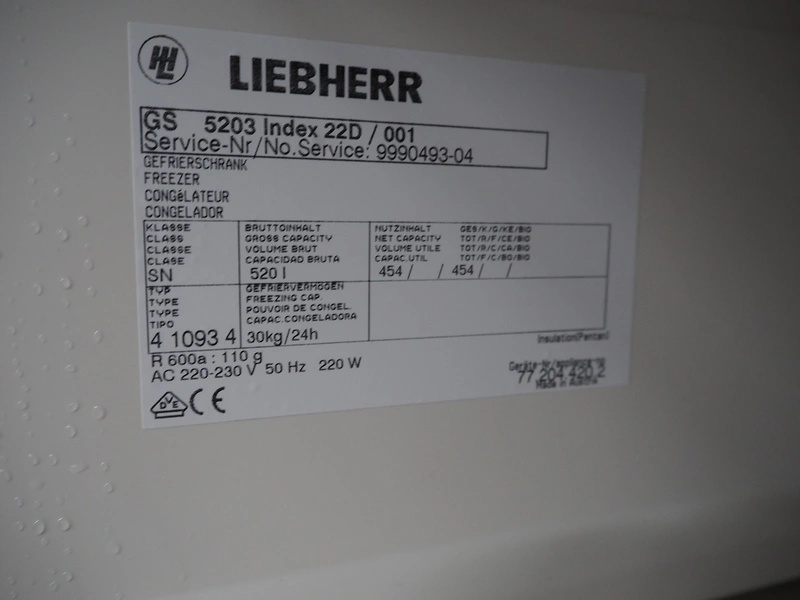 Liebherr freezer, model: GS 5203, number: 77.204.420.2, 220-230 V, 50 Hz, 220 W, refrigerant: R600a, 110 gram, volume: 520 liter, dimensions: 750 mm x 700 mm x 1700 mm.