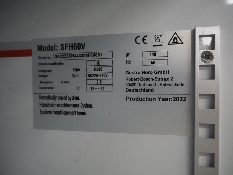 Gastro Hero GmbH freezer, model: SFH60V, serial number: SK2222GH44432SF6V051, year of construction: 2022, 220/240 V, 50 Hz, 2.8 A, refrigerant: R290, 140 gr, 5 floors, floor dimensions: 620 mm x 520 mm, total dimensions: 720 mm x 775 mm x 1850 mm.