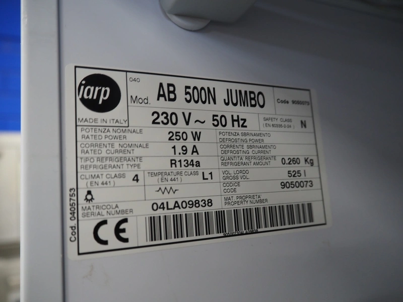 Iarp freezer, model: AB 500N JUMBO, serial number: 04LA09838, 230 V, 50 Hz, 1.9 A, 250 W, volume: 525 liter, refrigerant: R134a / 0.260 kg, dimensions: 780 mm x 730 mm x 1710 mm.