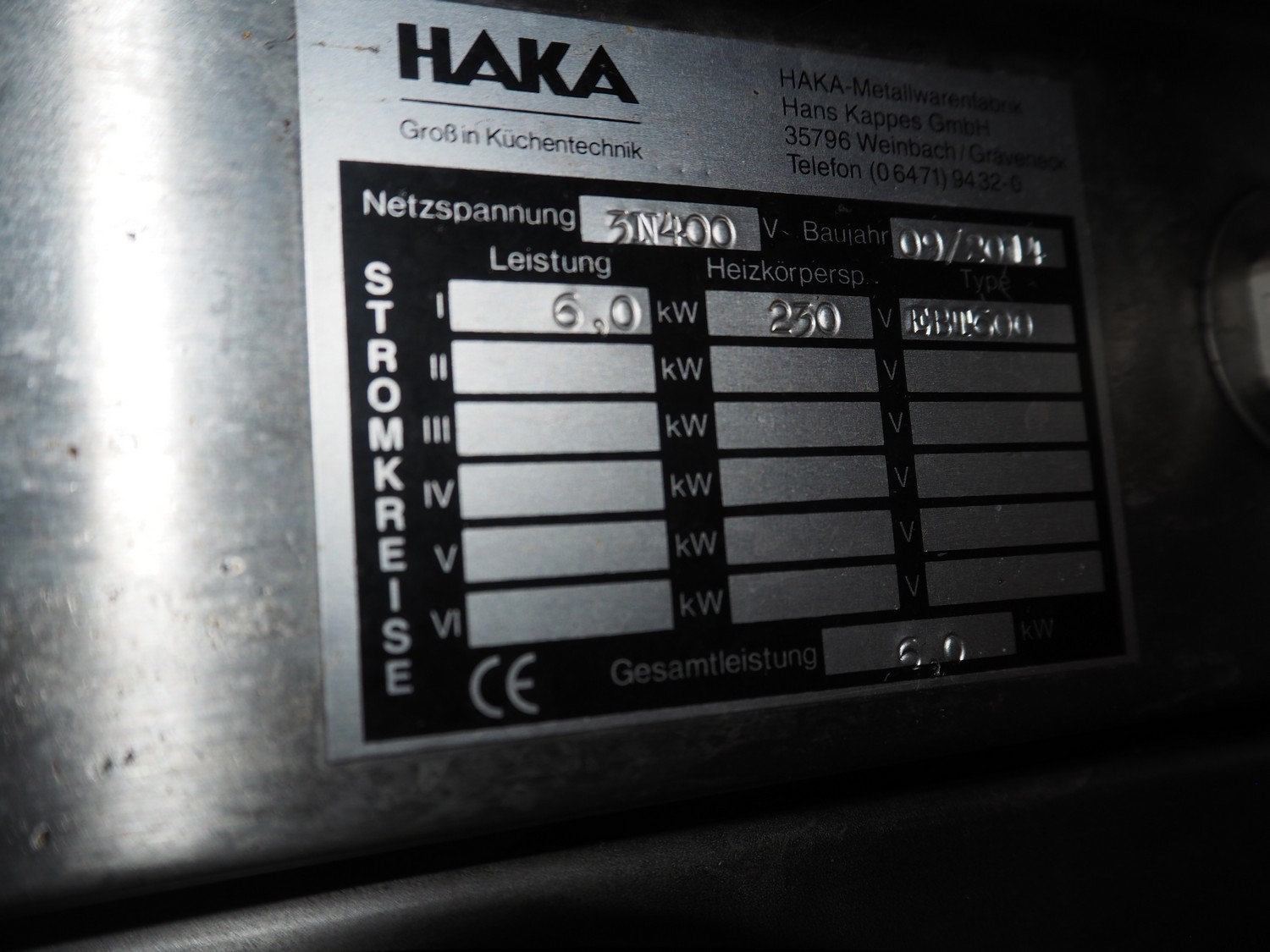 Haka frying pan, type: EBT600, year of construction: 09/2014, 400 V, 3 Ph, 6 kW, dimensions: 650 mm x 600 mm x 1000 mm.