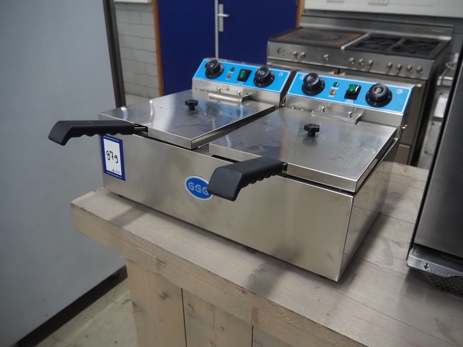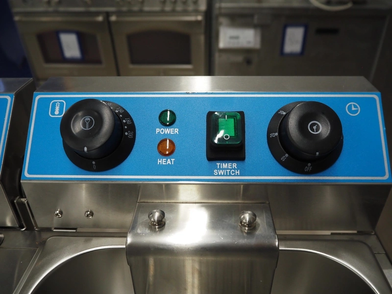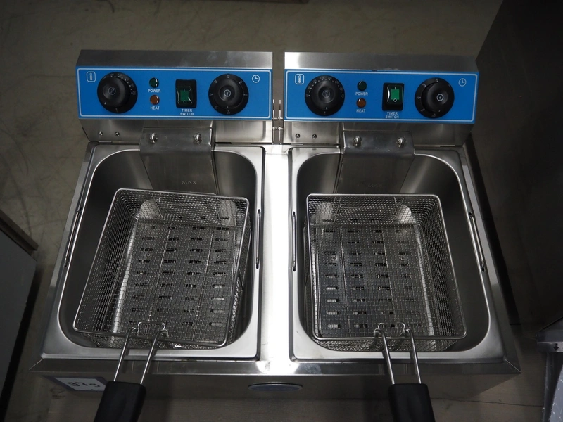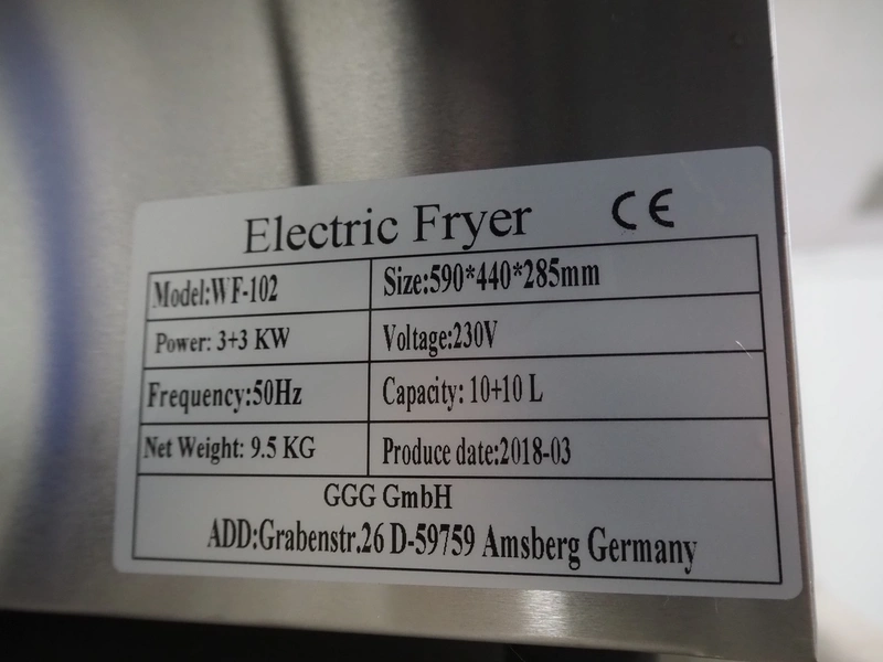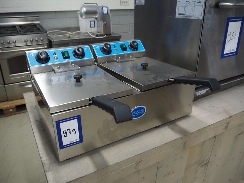 GGG double fryer, model: WF-102, year of construction: 03-2018, 230 V, 50 Hz, 3 + 3 kW, electrically heated, volume: (2x) 10 liter, dimensions: 650 mm x 600 mm x 300 mm. Never used.
