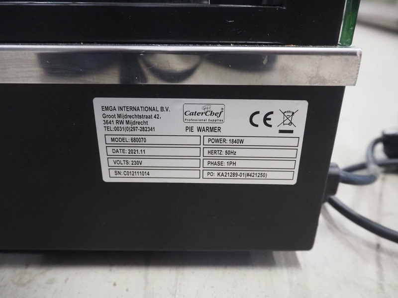 Emga International pie warmer, model: 680070, serial number: C012111014, year of construction: 11.2021, 230 V, 1 Ph, 50 Hz, 1840 W, dimensions: 660 mm x 400 mm x 640 mm.