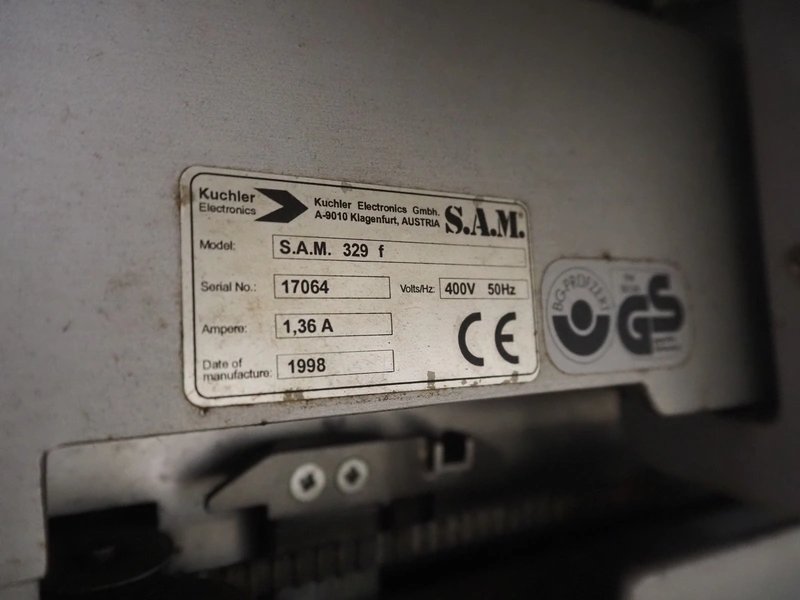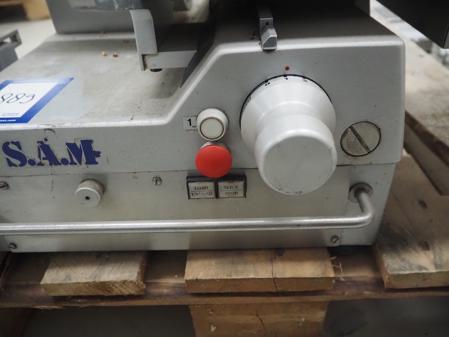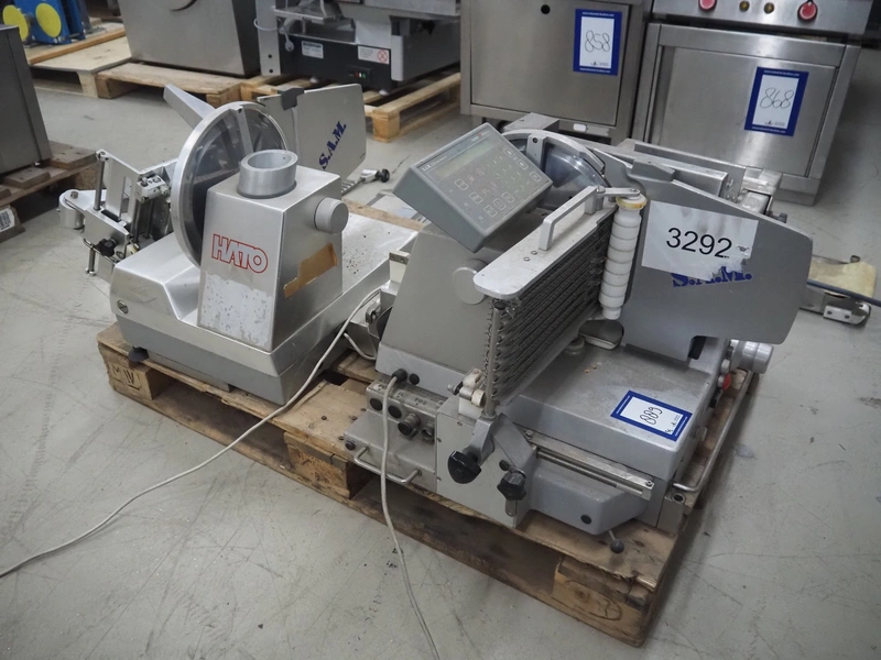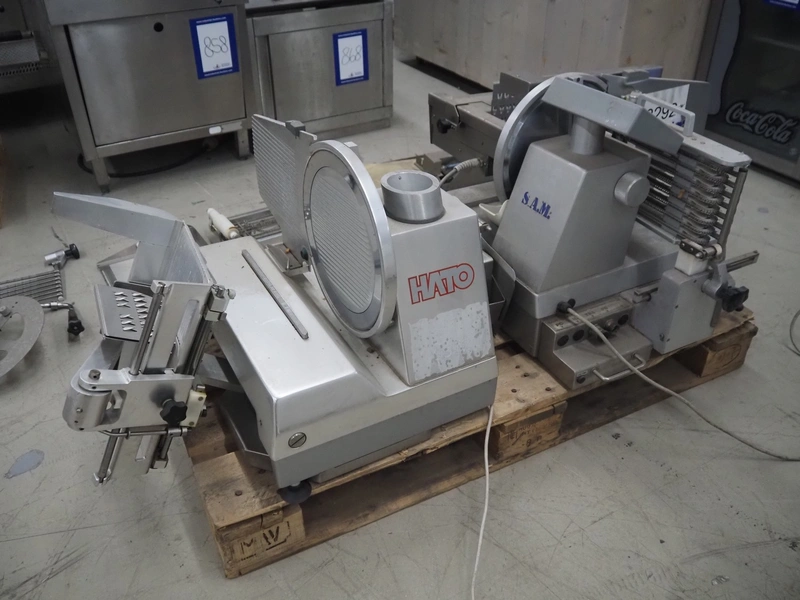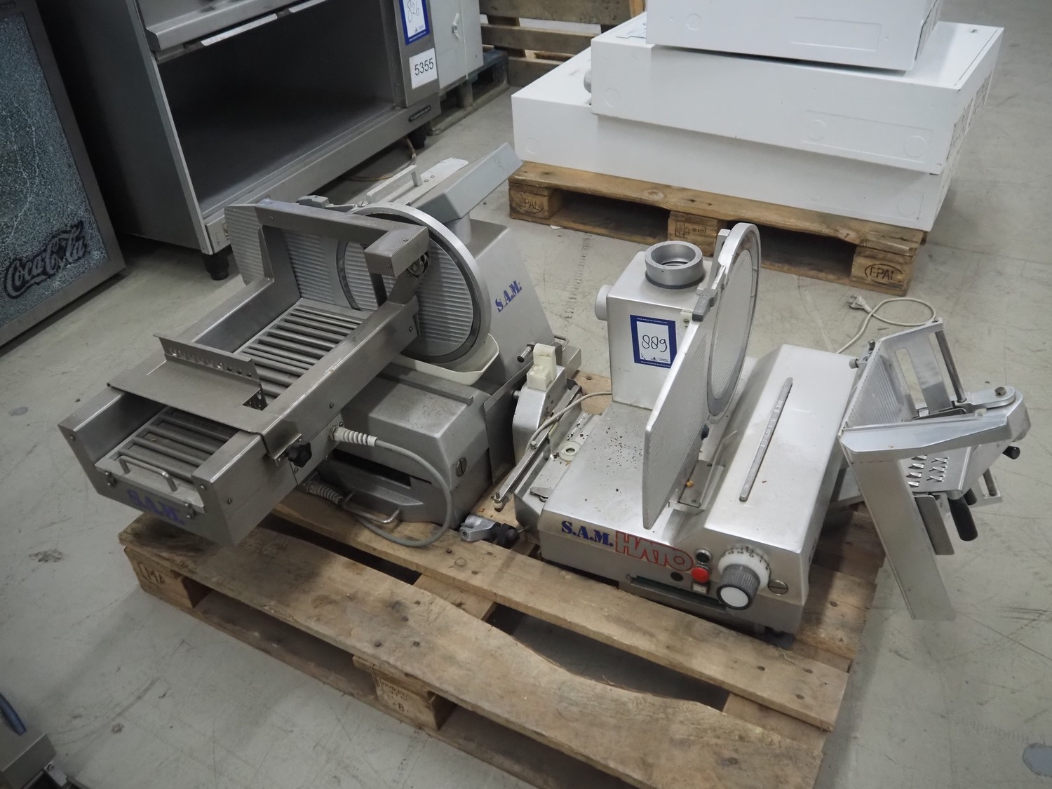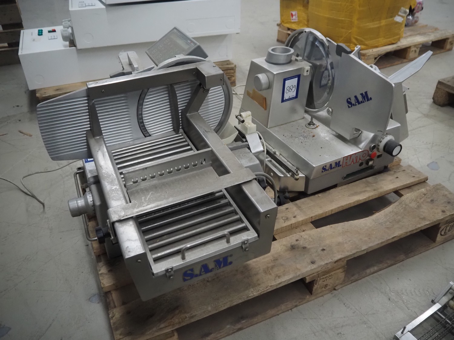 2 S.A.M. automatic slicer, model: S.A.M. 329 f, serial number: 17064, year of construction: 1998, 400 V, 50 Hz, 1.36 A, dimensions: 940 mm x 600 mm x 500 mm and model: 308aXL A, number: 11311, 220 V, 180 W, dimensions: 670 mm x 600 mm x 450 mm. Technical conditions unknown.