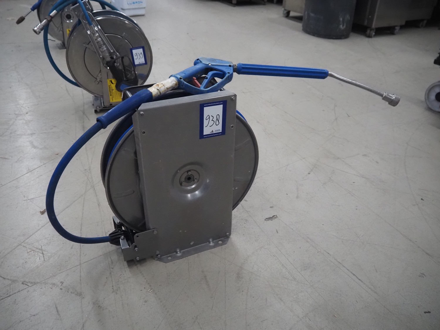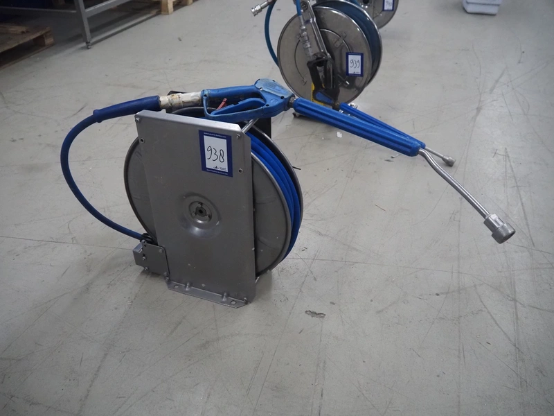 S/s hose reel with spray pistol, dimensions: 440 mm x 340 mm x 440 mm.