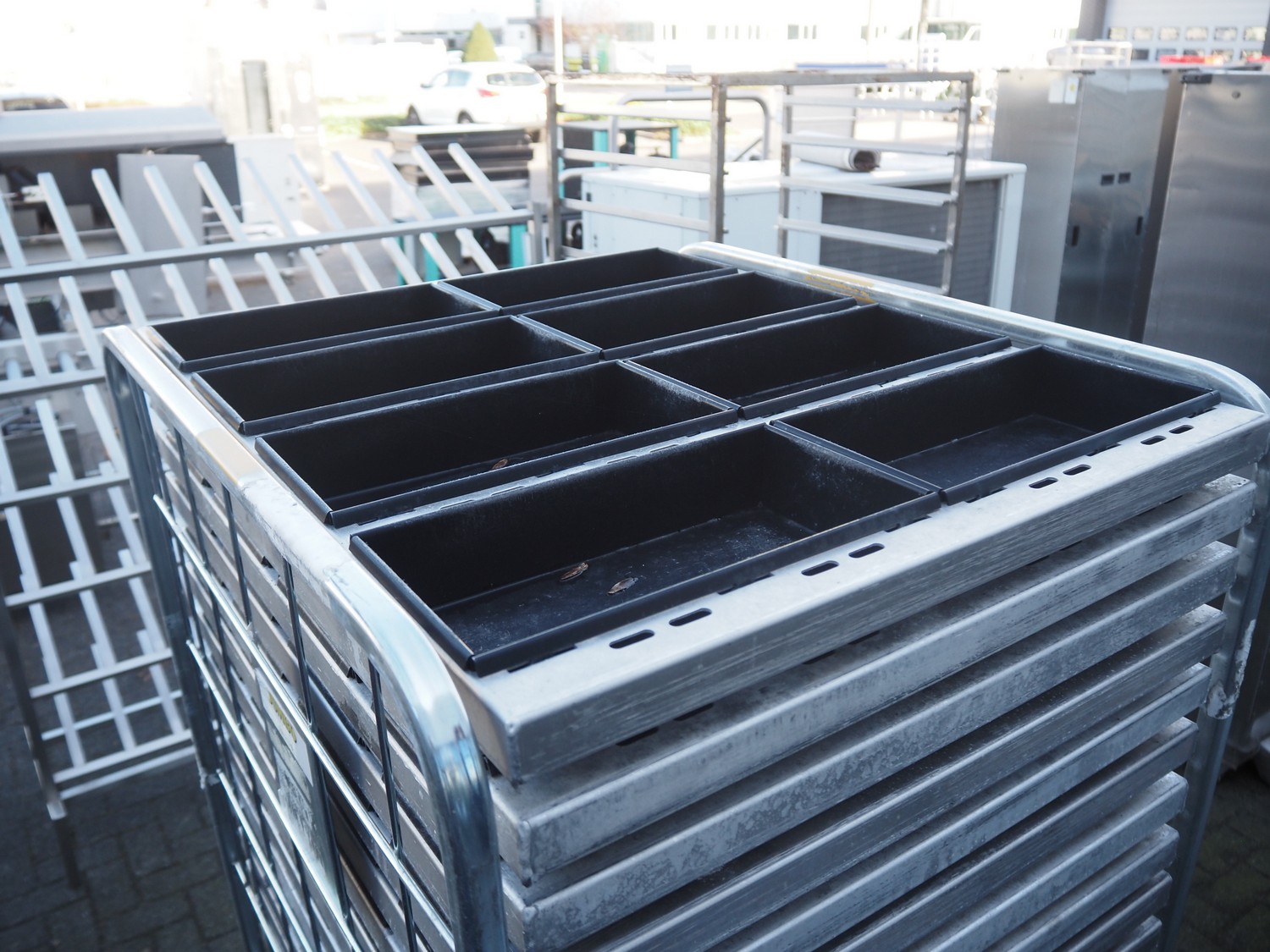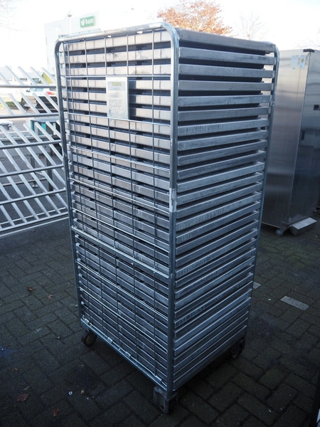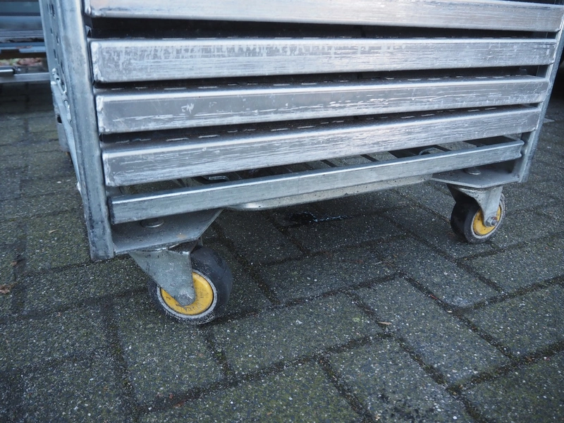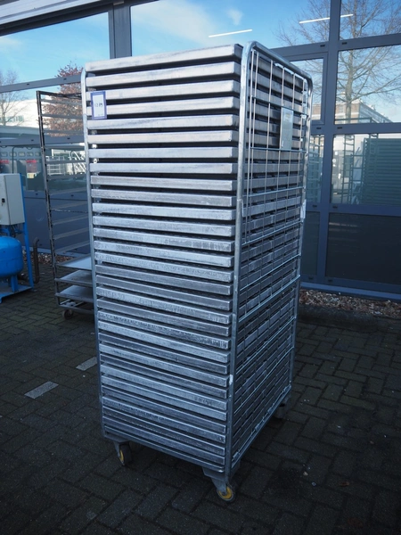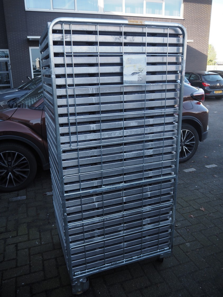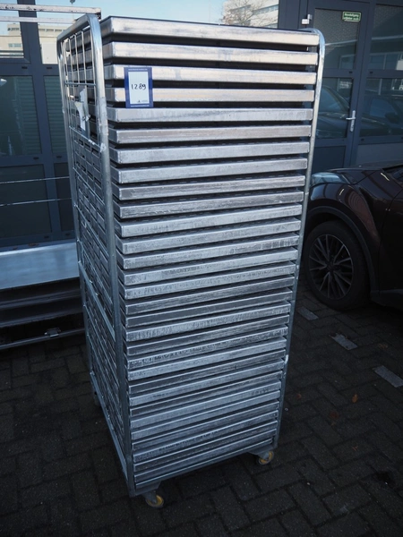 Steel trolley with large amount of s/s trays, dimensions tray: 295 mm x 150 mm x 60 mm, total dimensions: 810 mm x 670 mm x 1770 mm