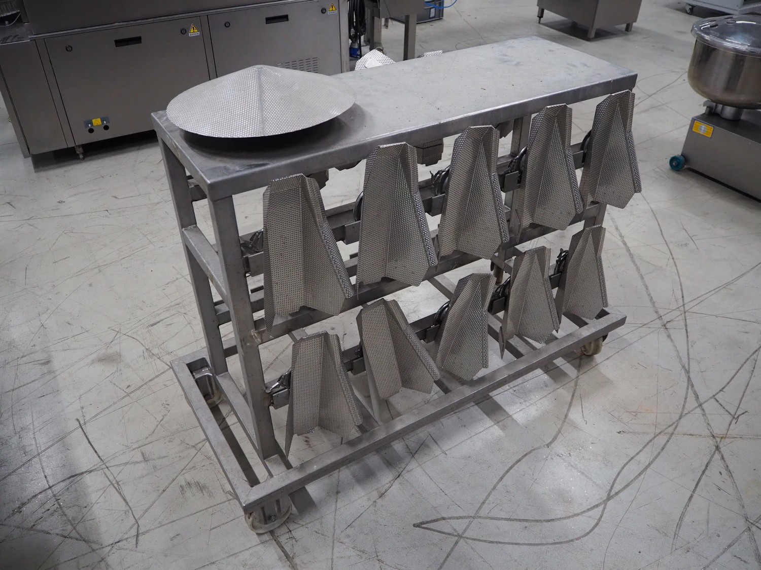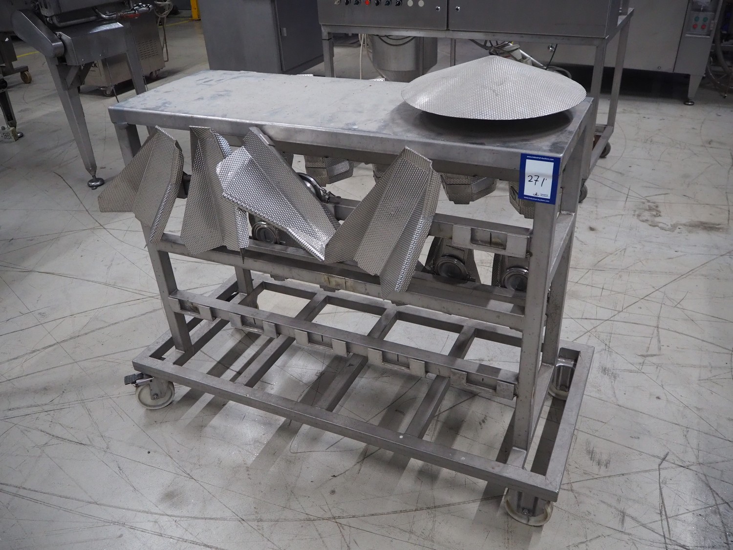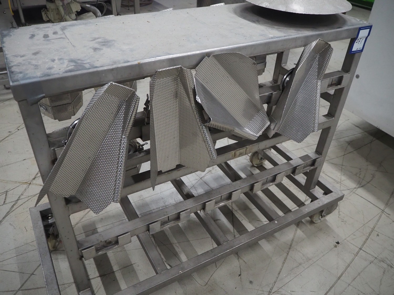 S/s trolley with parts for multihead weigher, dimensions: 1350 mm x 600 mm x 1100 mm.