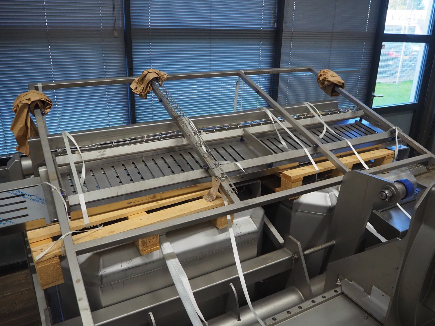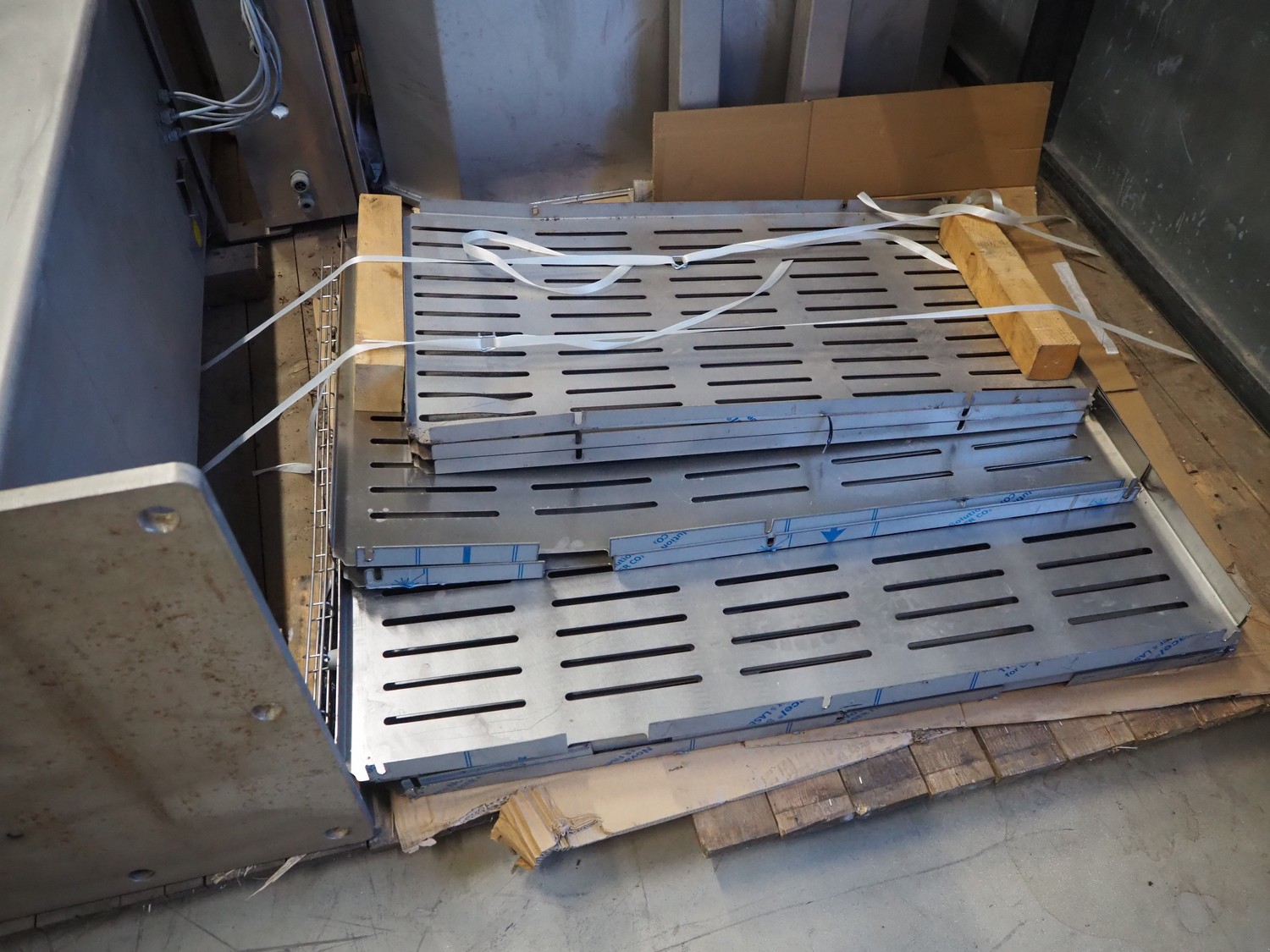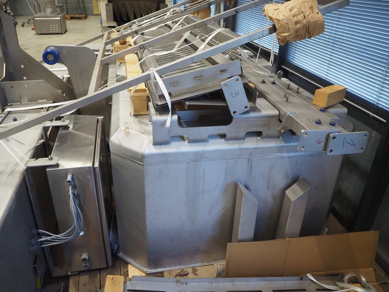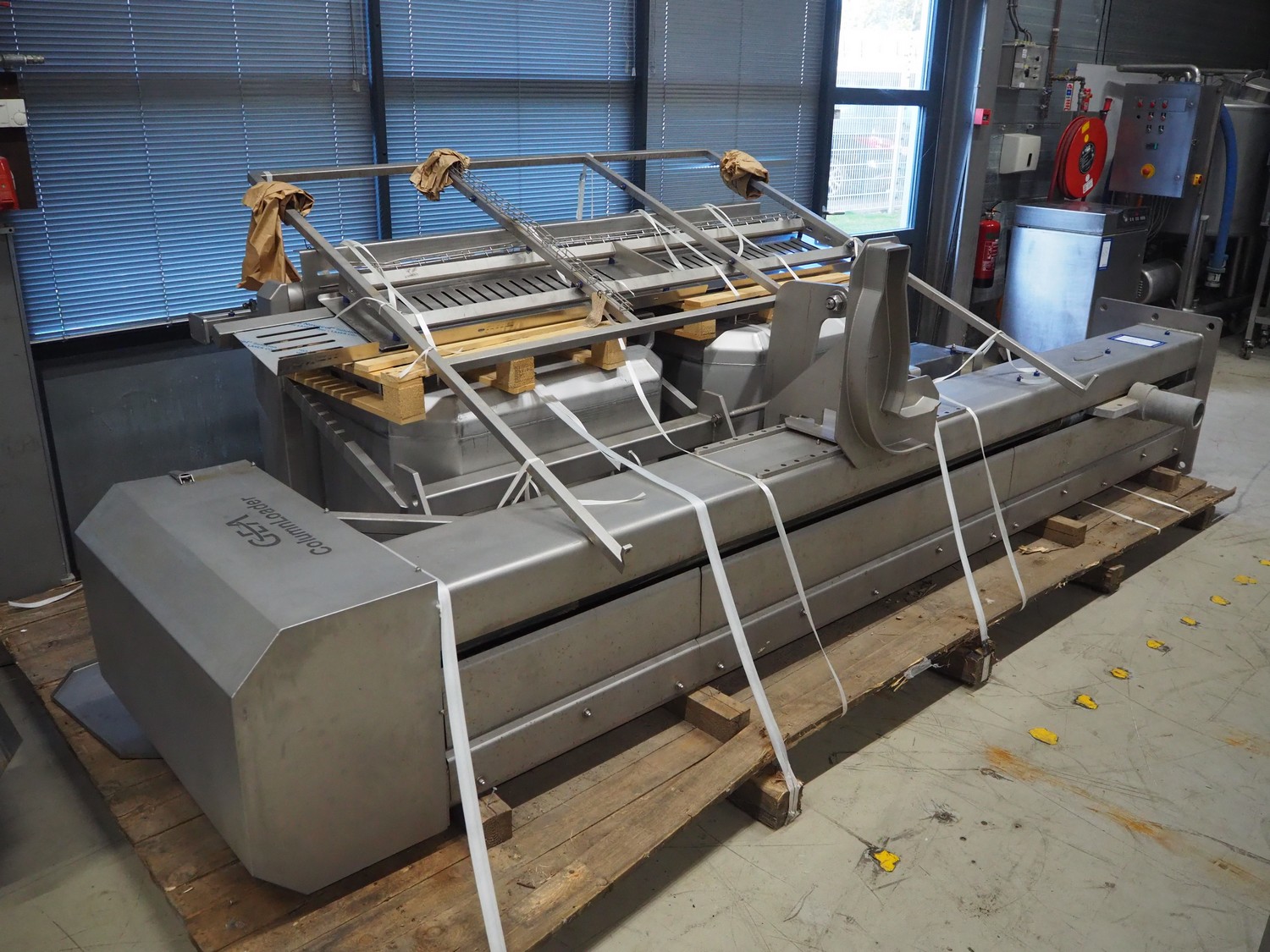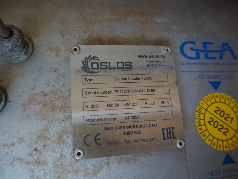 GEA lifter for pallet boxes with safety cage, type: GEA ColumnLoader 1000S, serial number: E011270705104/8790, year of construction: 04/2021, 380 V, 3 Ph, 50 Hz, 5.2 A, 2.2 kW, capacity: 1000 kg, clearance: 1270 mm x 1100 mm x 850 mm, lifting height: 2360 mm, total dimensions: 2450 mm x 1200 mm x 4400 mm, dimensions dismantled loader: 4200 mm x 2380 mm x 1500 mm.