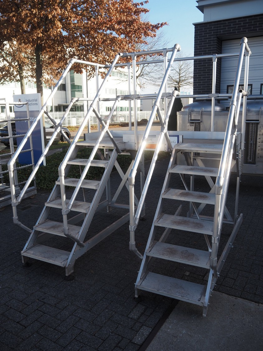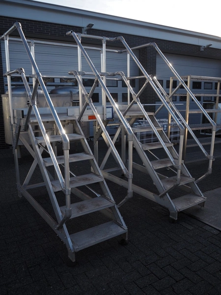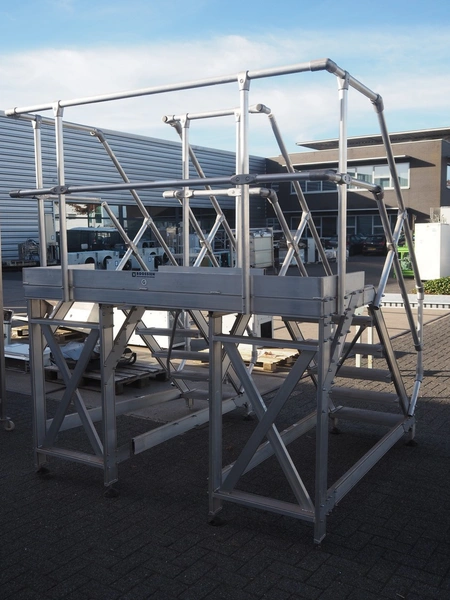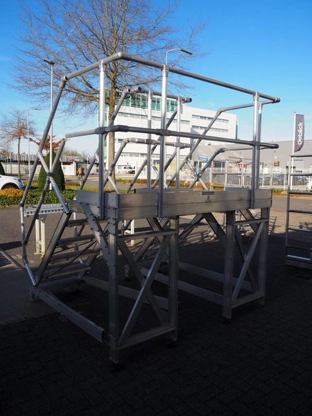 Roossien Hoogwerktechniek aluminium platform, capacity: 150 kg, platform height: 1300 mm, total dimensions: 2130 mm x 2080 mm x 2400 mm.