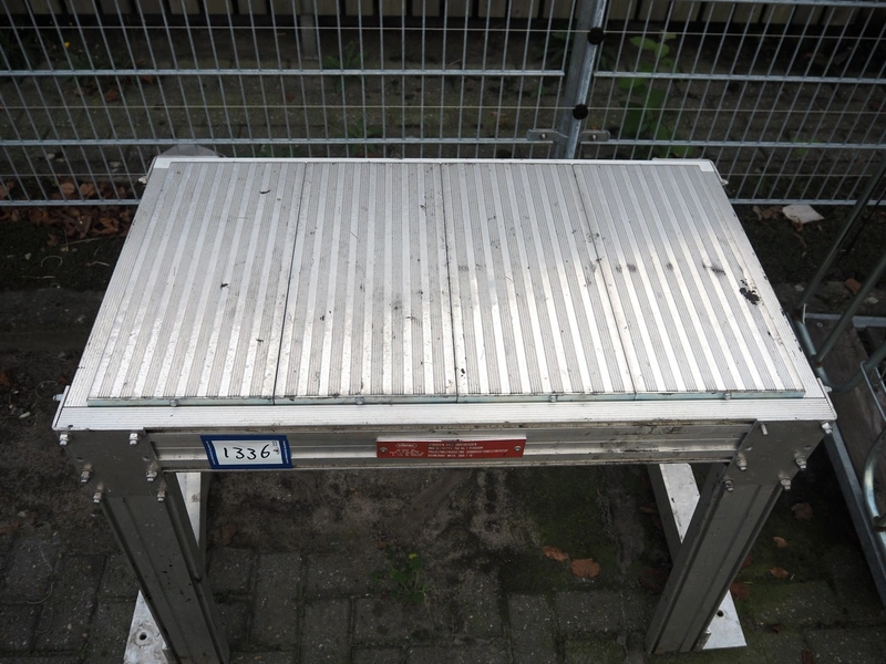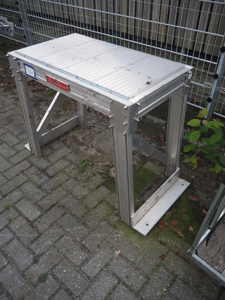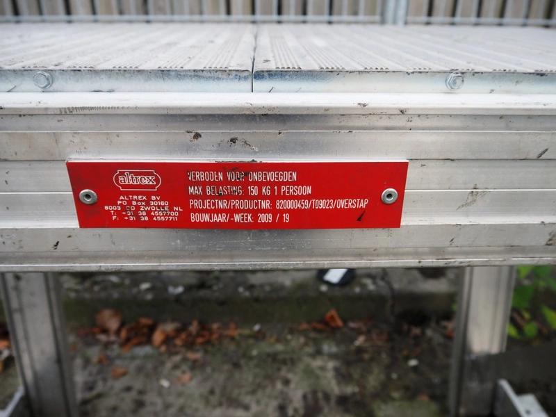 Altrex working platform, product number: 820000459/T09023/OVERSTAP, year of construction: 04/2009, max capacity: 150 kg, working height: 820 mm, total dimensions: 1230 mm x 540 mm x 820 mm.