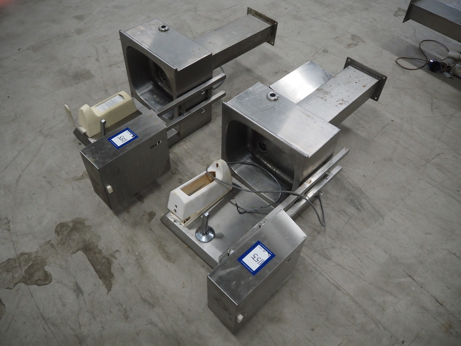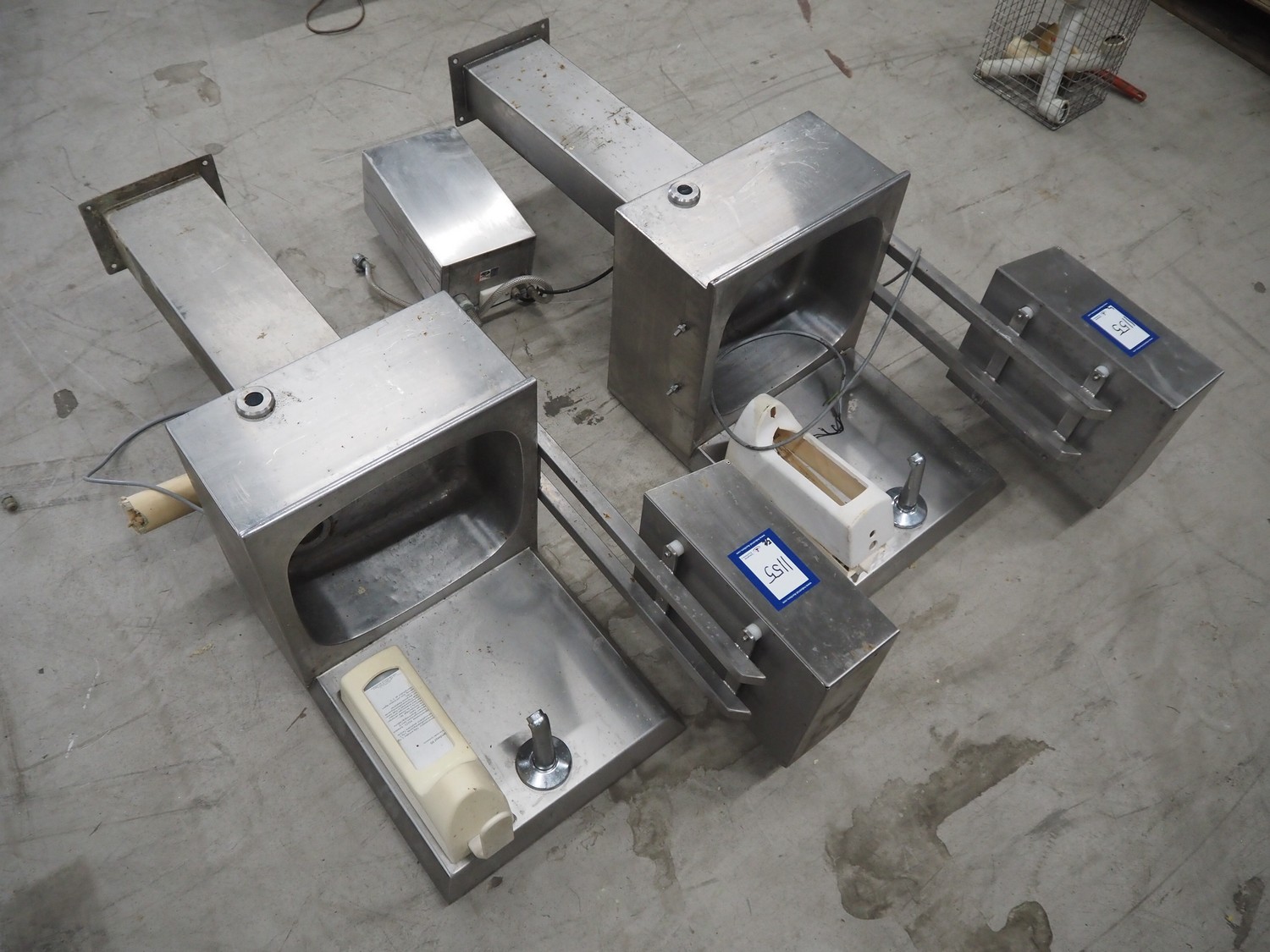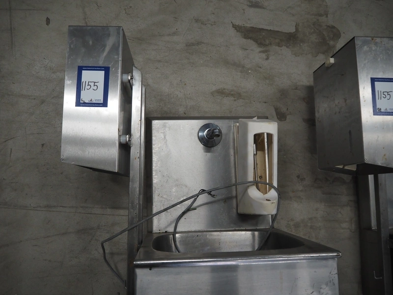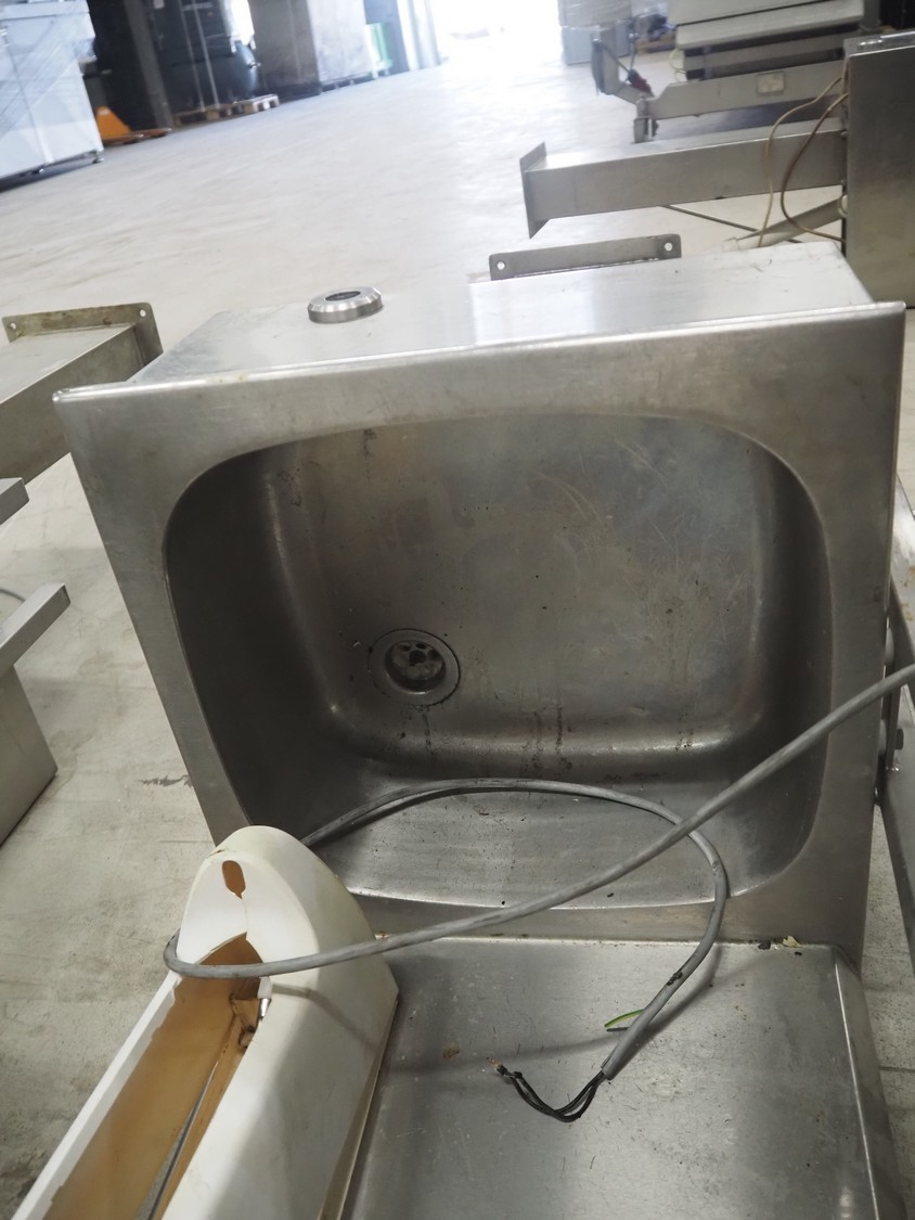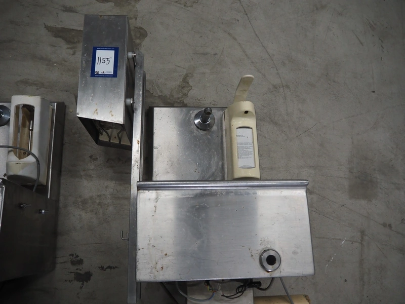 2 Itec s/s sinks, sensor operated, with soap dispenser, paper dispenser and 1 knife sterilizer, dimensions: (2x) 600 mm x 470 mm x 1380 mm.